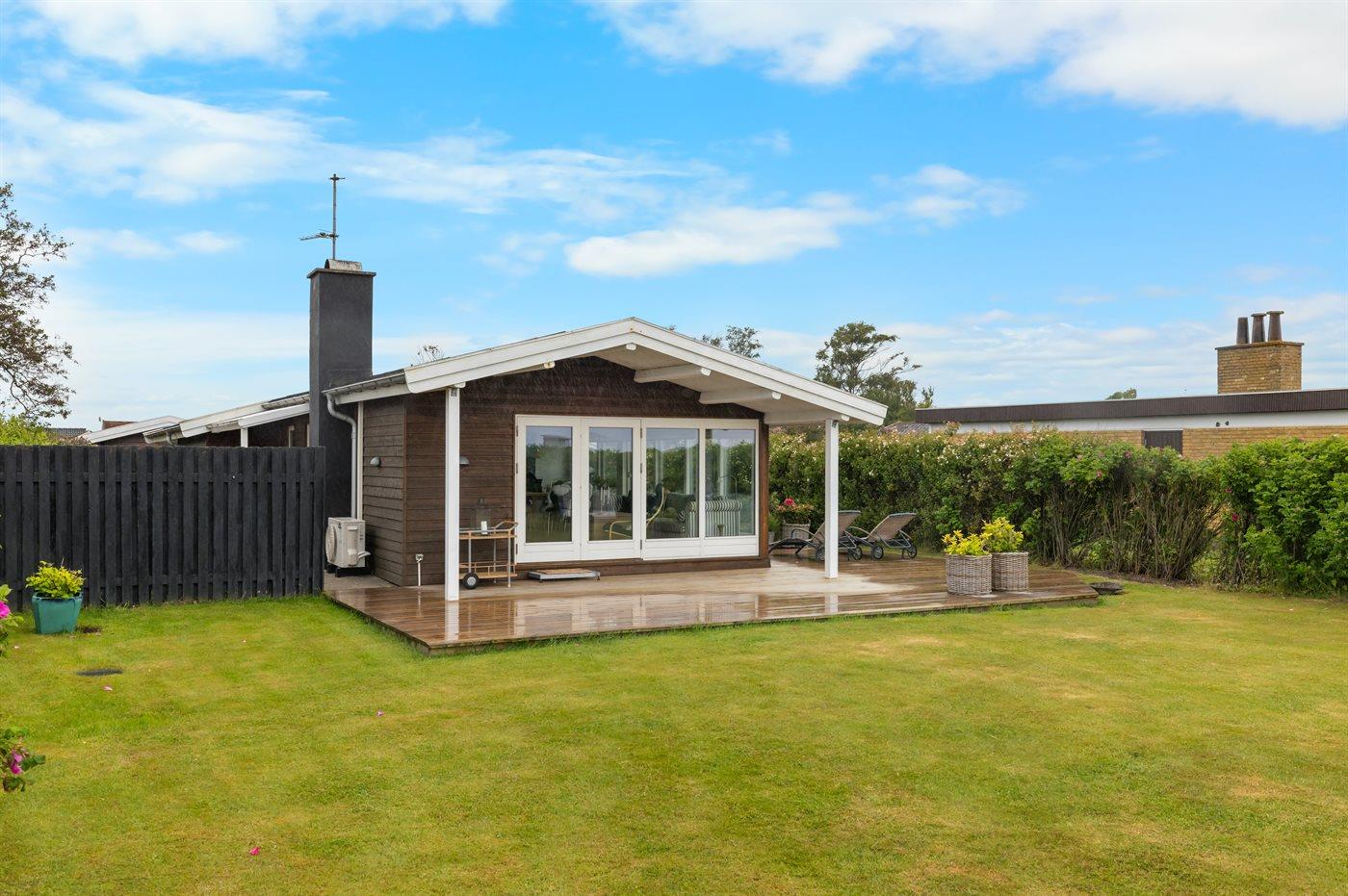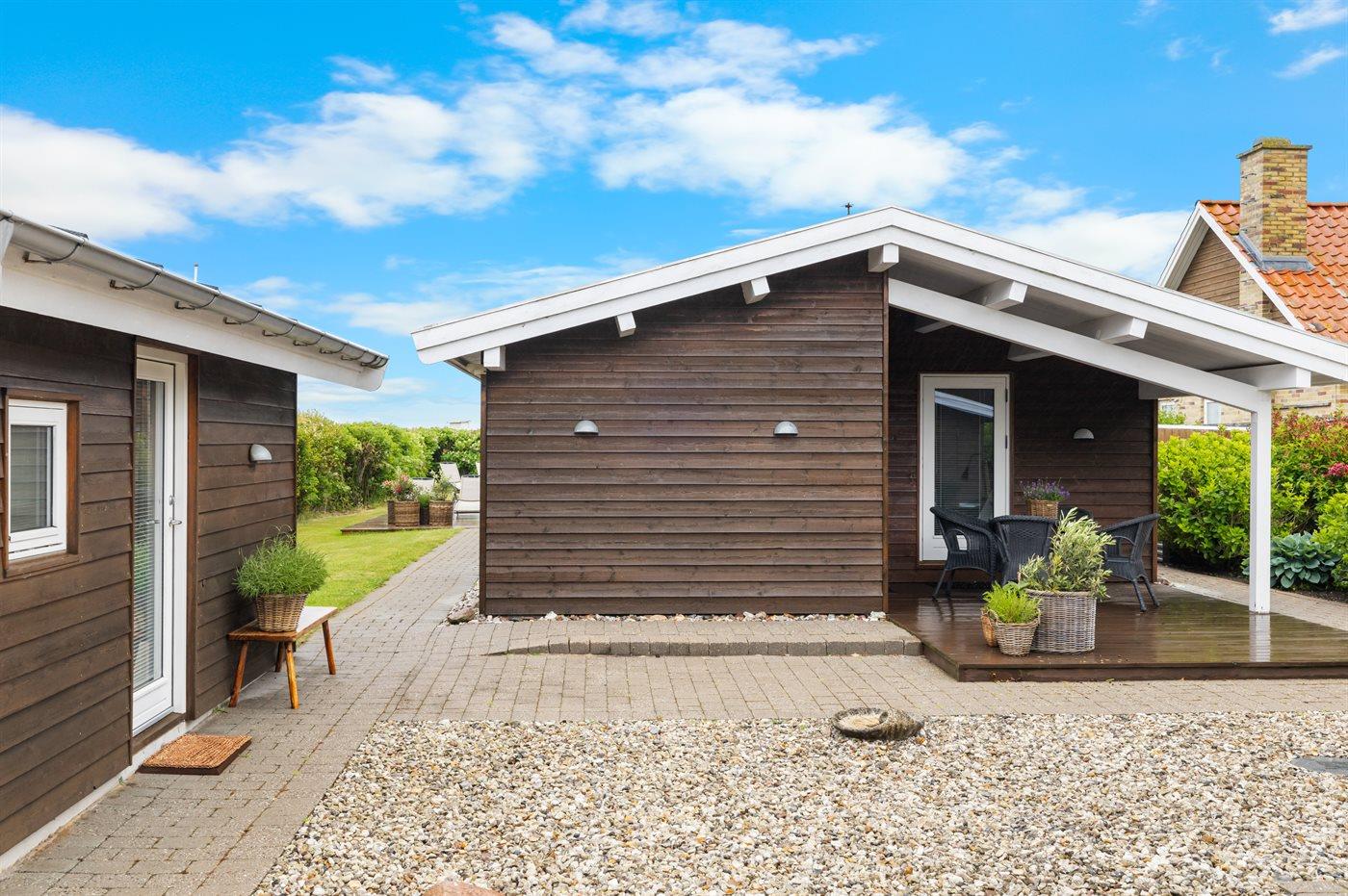 Ferieboligen er beliggende på en 970 m² stor havegrund. Der er 20 m til havet. Nærmeste forretning er beliggende i en afstand af 2200 m. Til ferieboligen hører åbent terrasseareal. Desuden er der overdækket terrasse. Der er redskabsrum. Udendørs bruser. Grill til rådighed. Der er carport til rådighed. Parkering ved ferieboligen.
