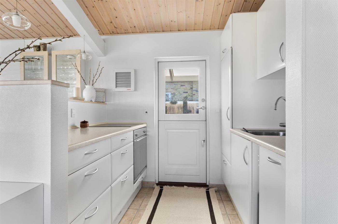 Køkkenet er udstyret med 1 køleskab. Der er 4 keramiske kogeplader, varmluftovn, mikrobølgeovn samt opvaskemaskine Der er gulvvarme i køkkenet.