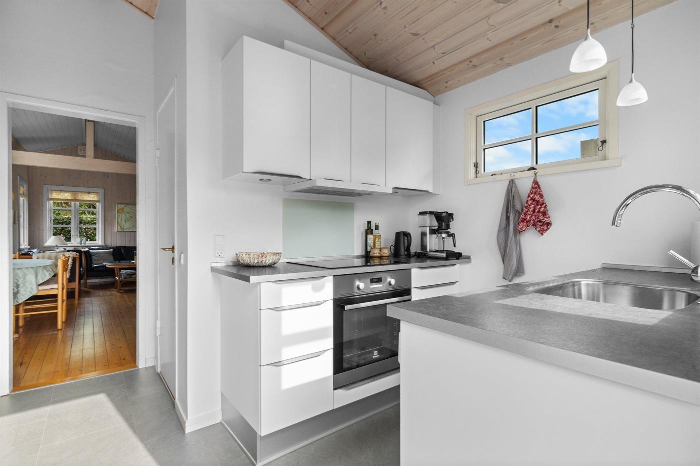 Køkkenet er udstyret med 1 køleskab. Der er 4 induktionskogeplader, varmluftovn samt opvaskemaskine.