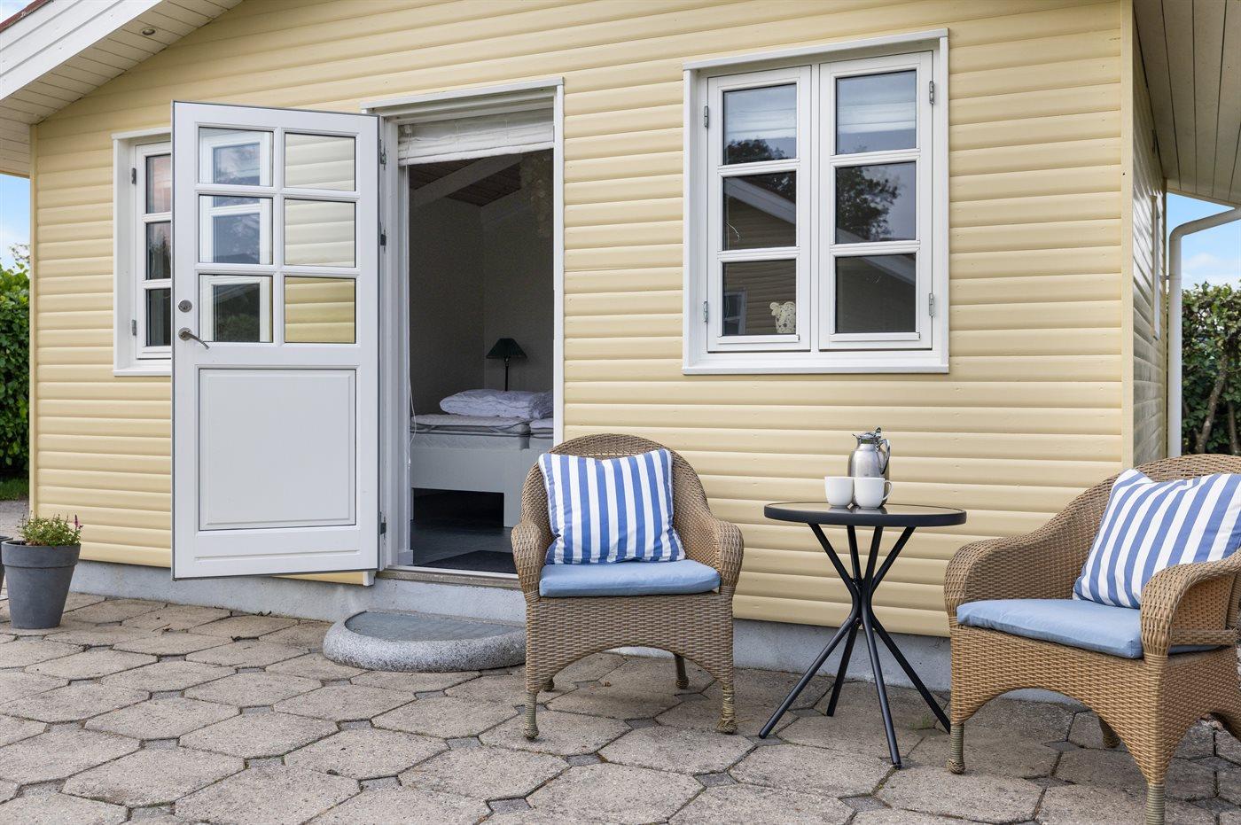 Huset er lyst og hyggeligt indrettet og har 2 anneks, hvoraf det ene er moderne med eget toilet. Omkring huset er der flere dejlige terrasser og en overdækket afdeling, som indbyder til hyggelige aftener. Fra haven er der låge lige ud til stien, der fører direkte ned til stranden, som kun ligger 60 meter væk.