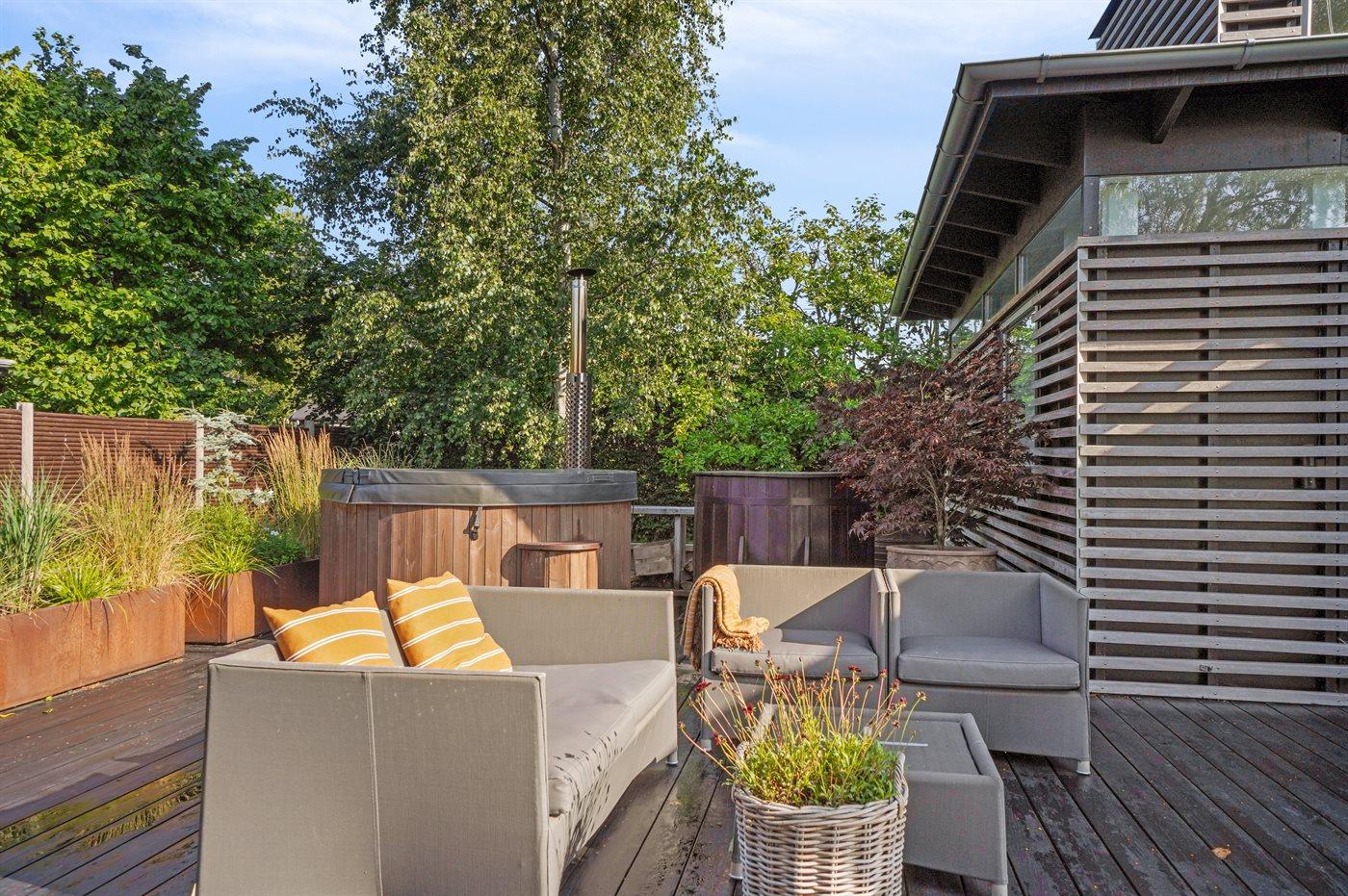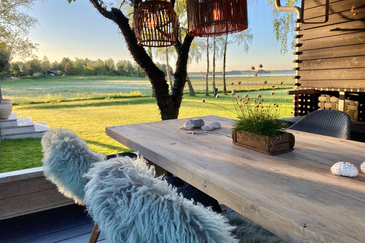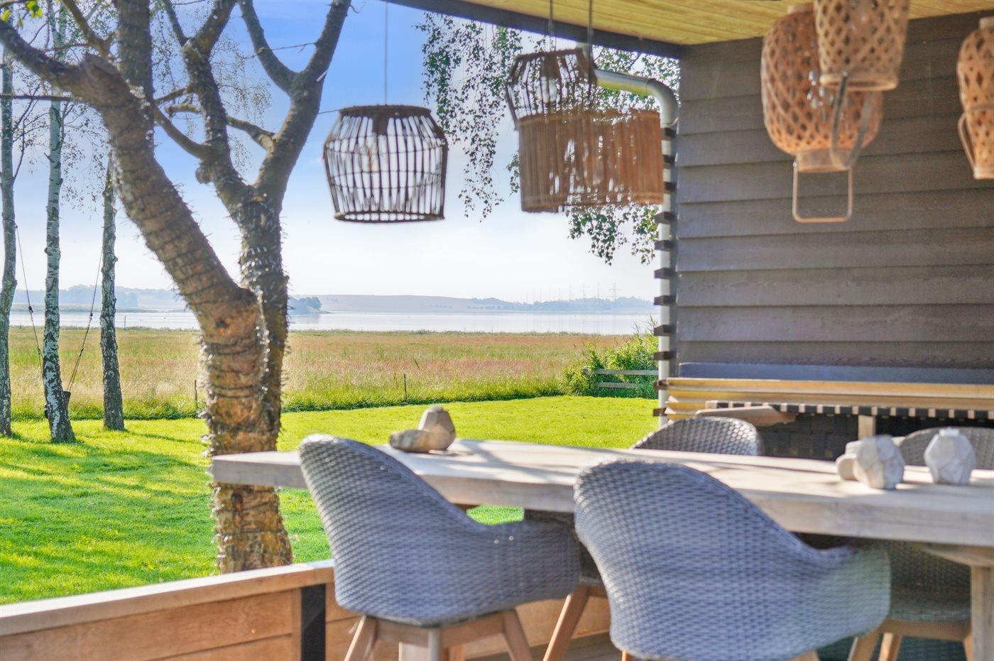 Fra terrassen er der åben udsigt til fjorden, og her finder du også et lækkert vildmarksbad – perfekt til afslappende stunder under åben himmel året rundt.