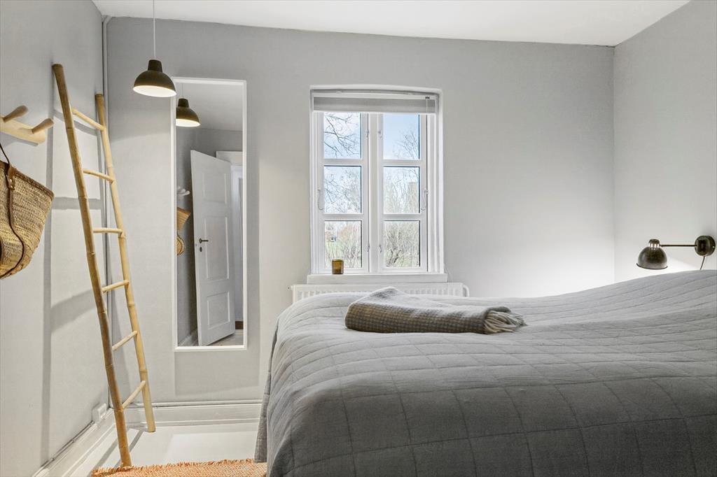 Stilen er ført videre i soveværelset med en komfortabel dobbeltseng, sengelamper og borde samt god opbevaringsplads. Dette værelse har vinduer mod vest og den fredelige og grønne have, så her er der helt ro.