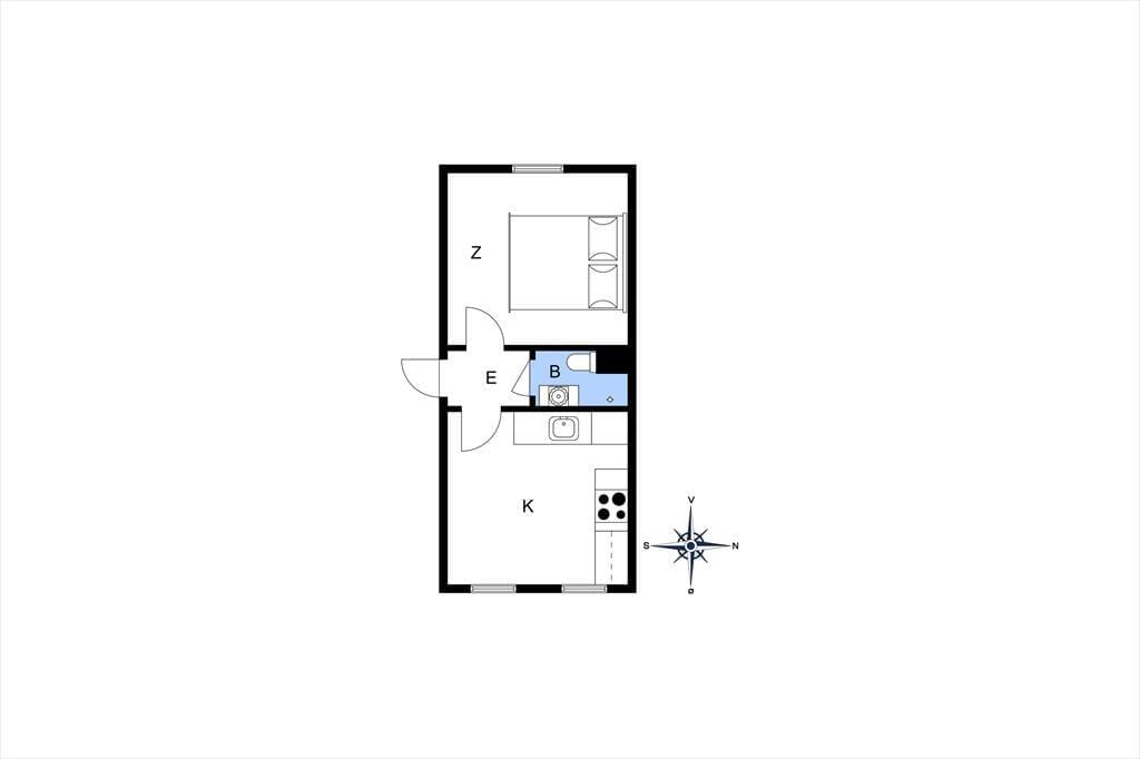 I køkkenet er køleskab, en lille ovn, to kogeplader samt diverse tilbehør til madlavningen. Her er også en spiseplads, hvor I kan lægge planer for dagen, nyde feriens måltider og det gode fra de sydvendte vinder. Køkkenet er lyst og indrettet i en hyggelig og samtidig moderne stil.