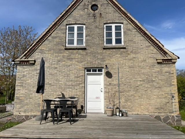 Ved indgangen til ferielejligheden er en fin træterrasse, hvor man kan tilbringe mange gode timer, når vejret tillader det. Her er det oplagt at tage sine måltider eller morgenkaffe med ud, og nyde den fredelige have med flere ældre træer og buske eller kigge på landsbylivet i Tanderup.