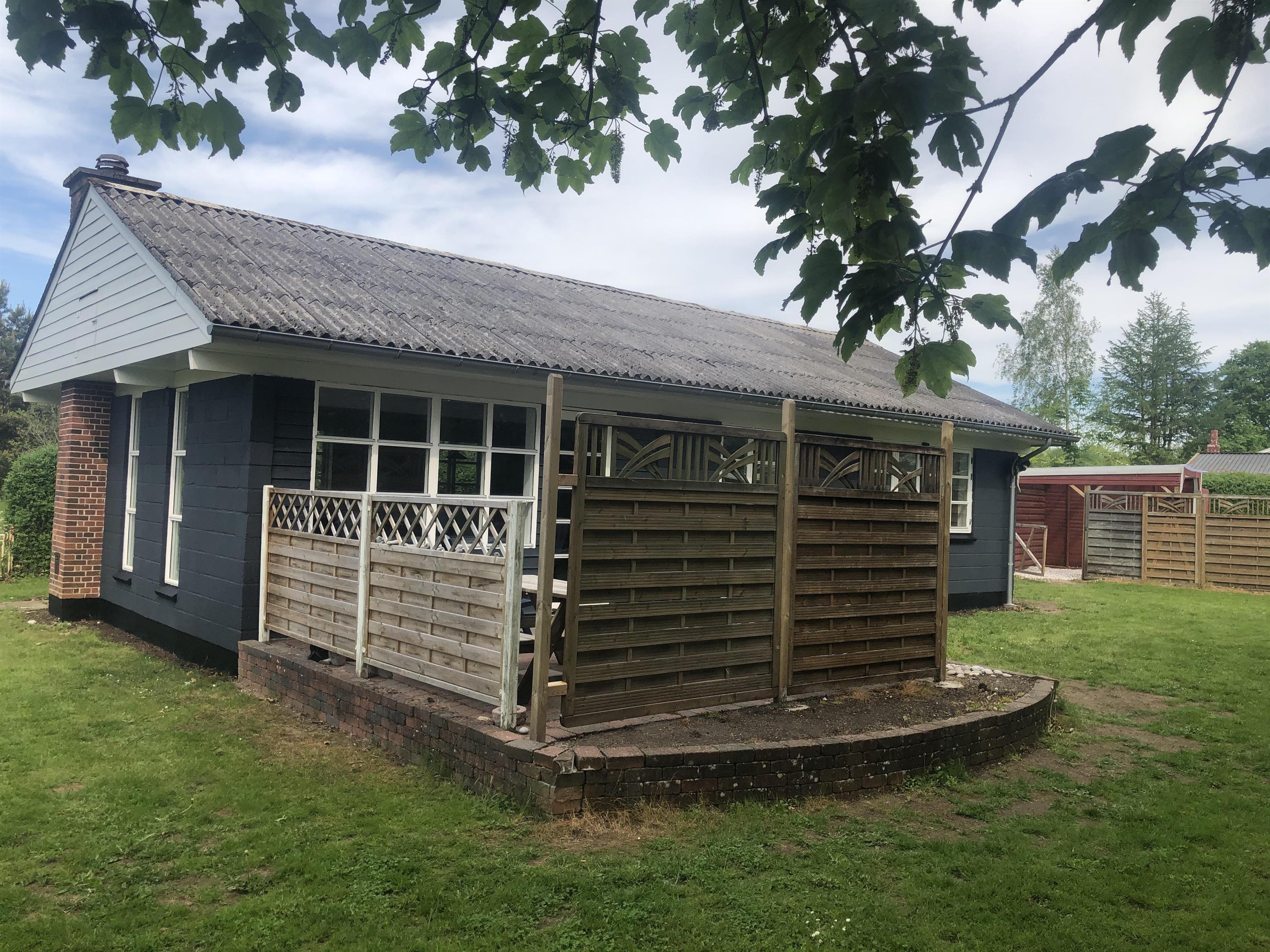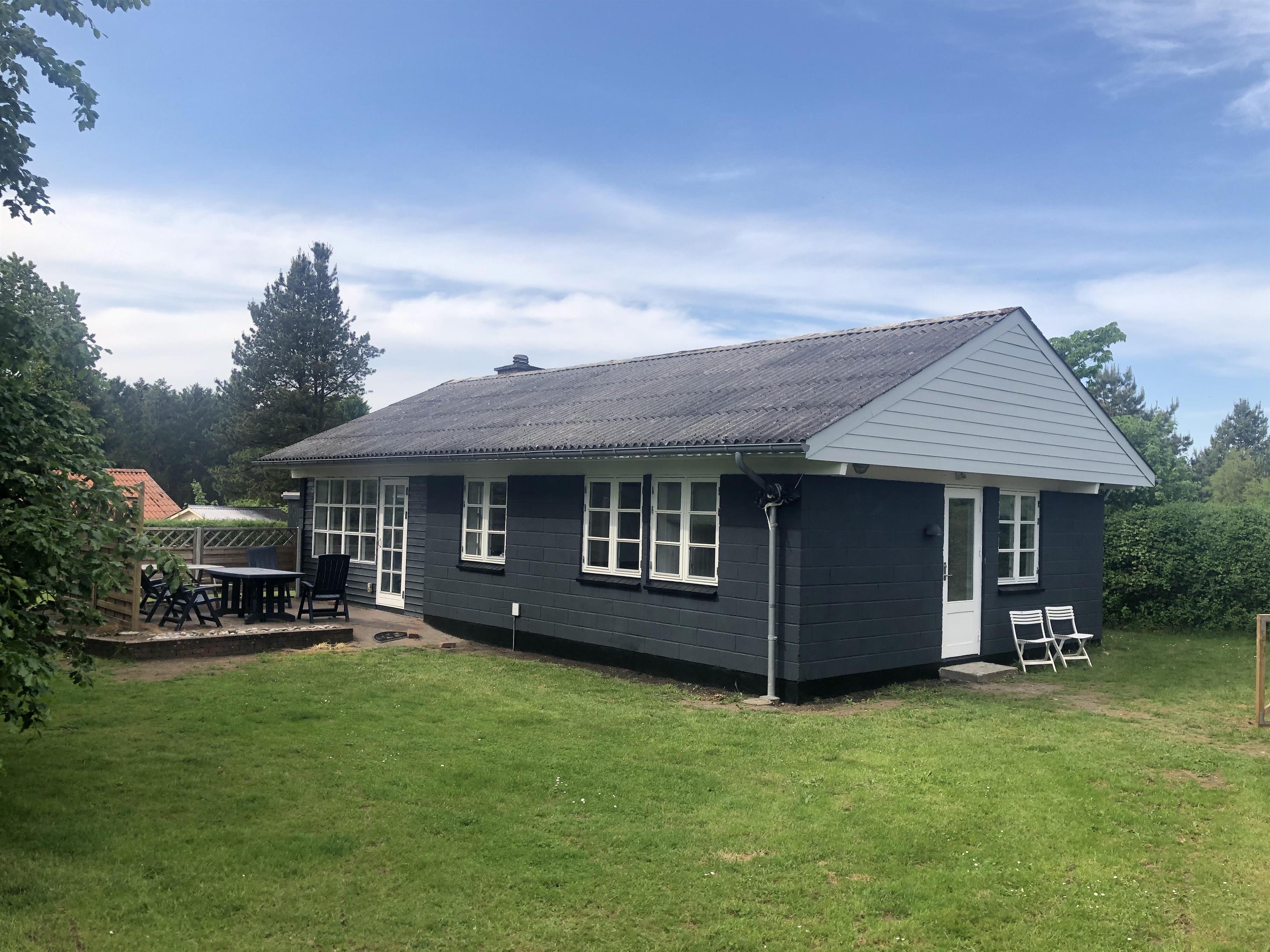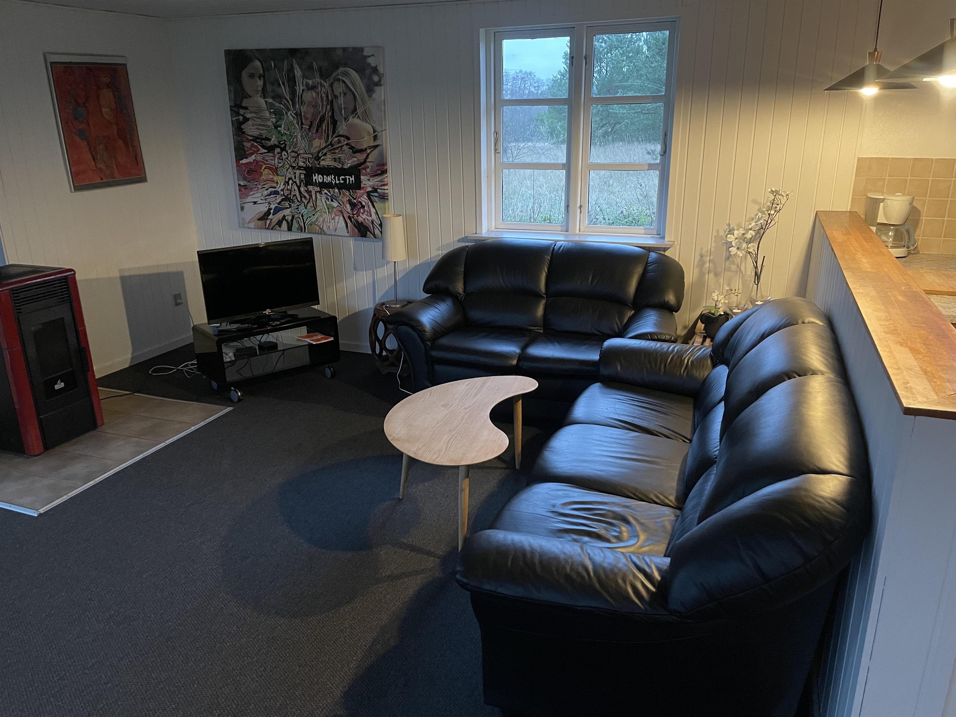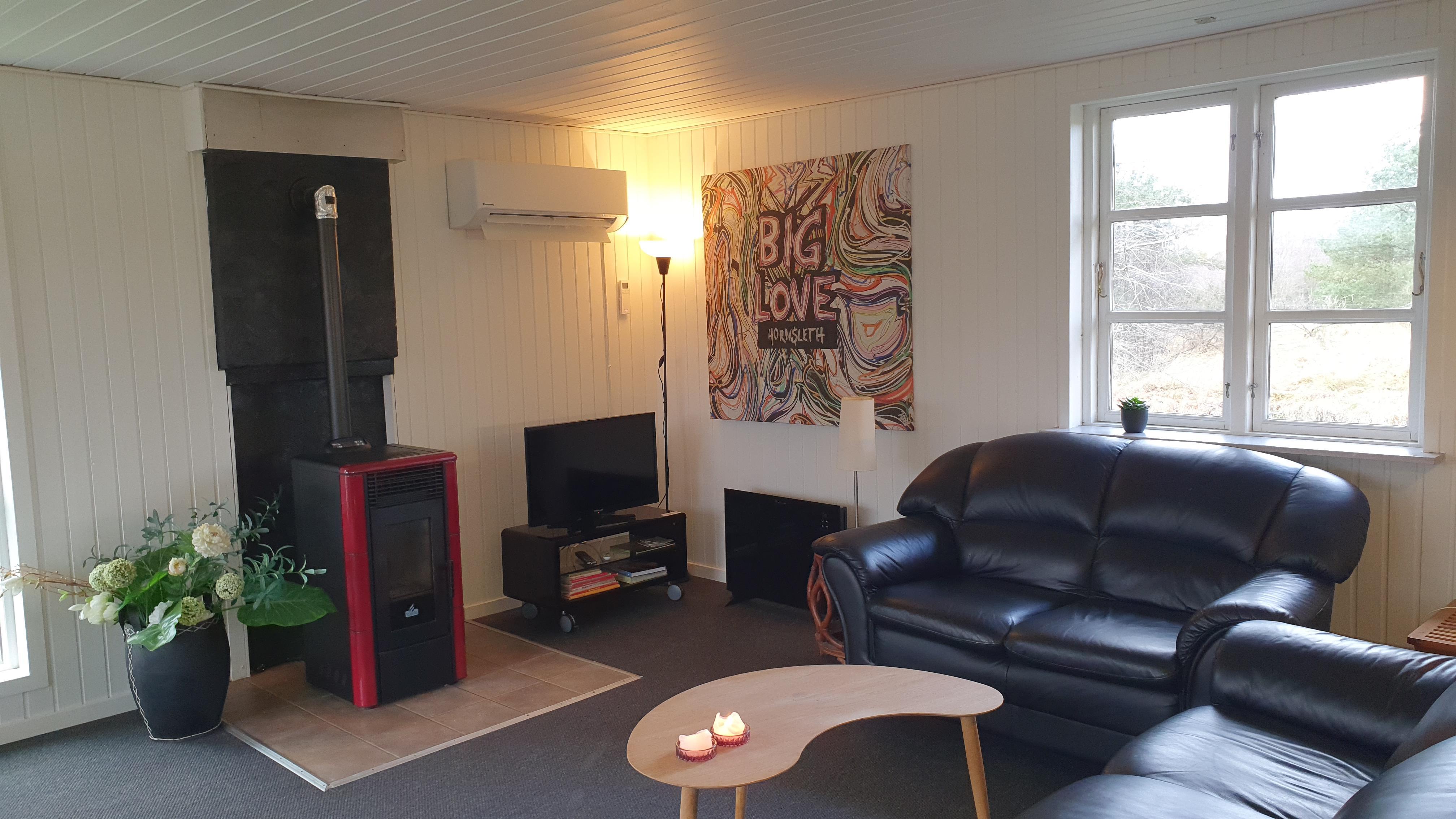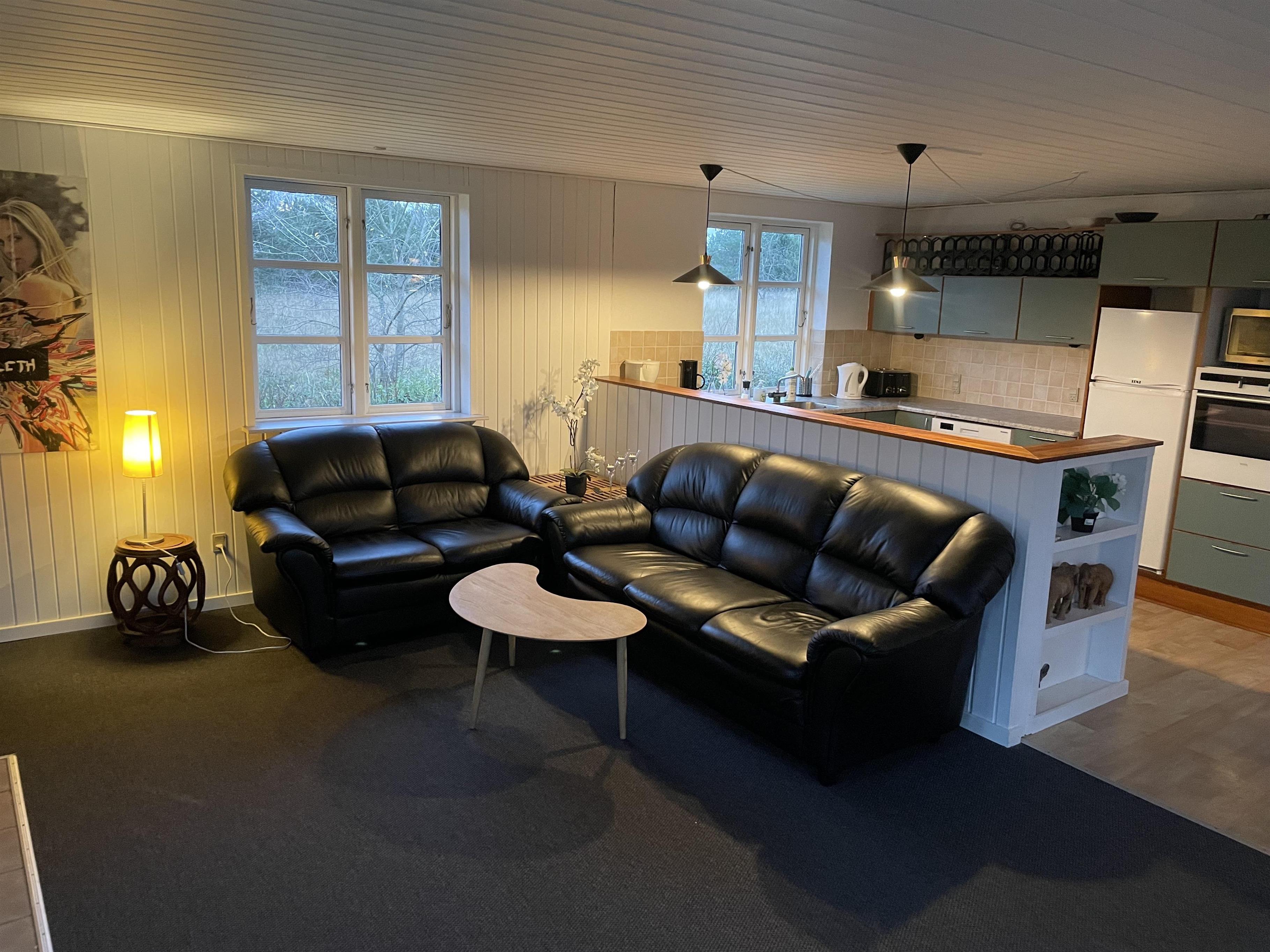 Sommerhus med åbent køkken i forbindelse med stor stue og 1 stort badeværelse.
