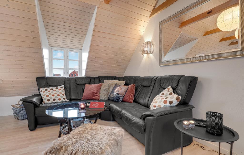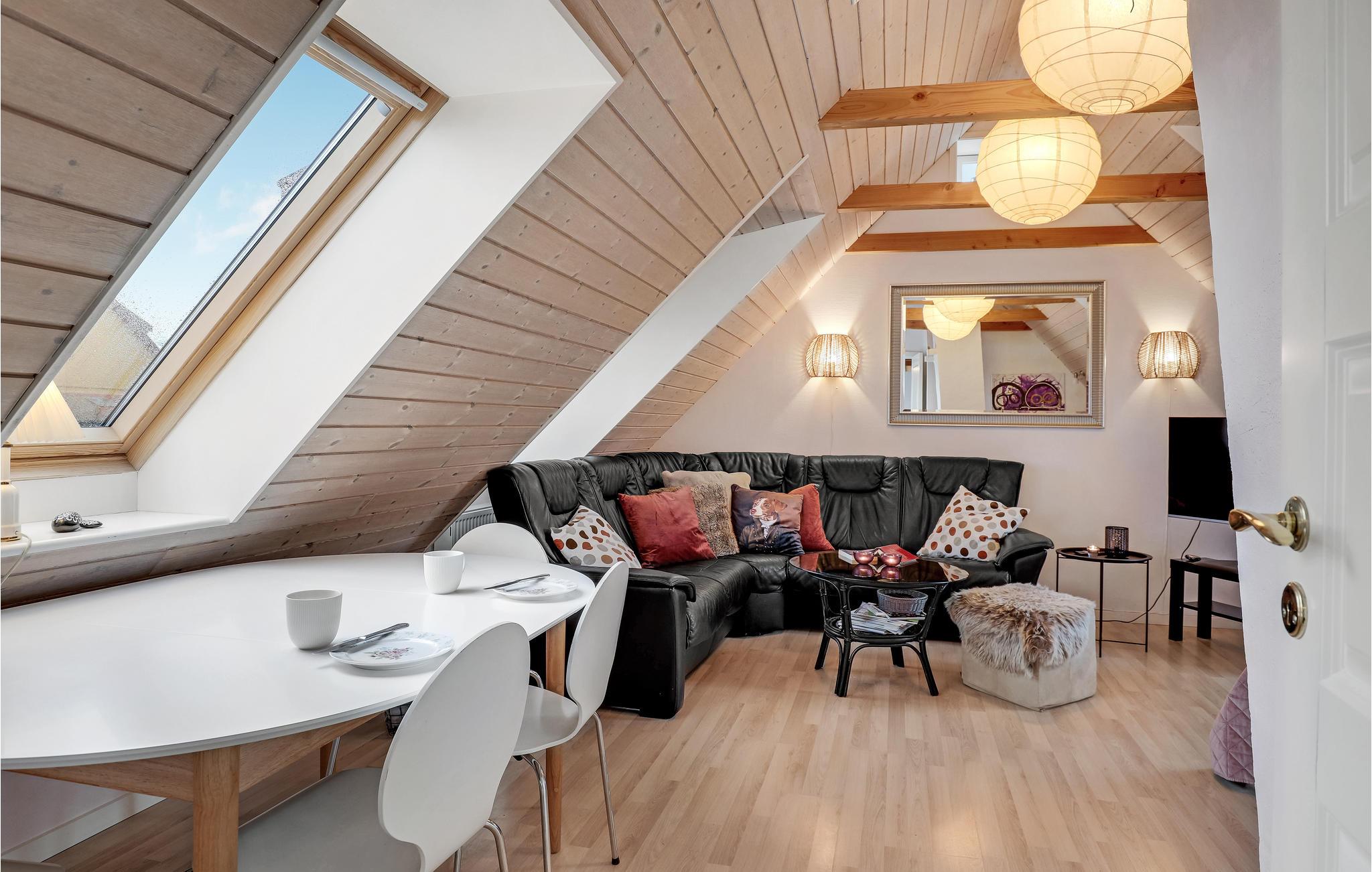 Der er lagt op til en skøn ferie på Bornholm, hvor I kan få jeres base i denne hyggelige loftslejlighed, som ligger centralt i Tejn. Her kan I snildt holde jeres familieferie, for lejligheden har god plads og nem adgang til byens tilbud. Læn jer tilbage i sofaen, sæt jer med en god film eller et spil kort. Når I har sammensat dagens menu i køkkenet, kan I dække op på den store tagterrasse og nyde retterne med udsigt til havnen. Her har I også et skønt sted til at sætte jer med en kop kaffe og snakke om, hvad I skal ud at se næste gang.