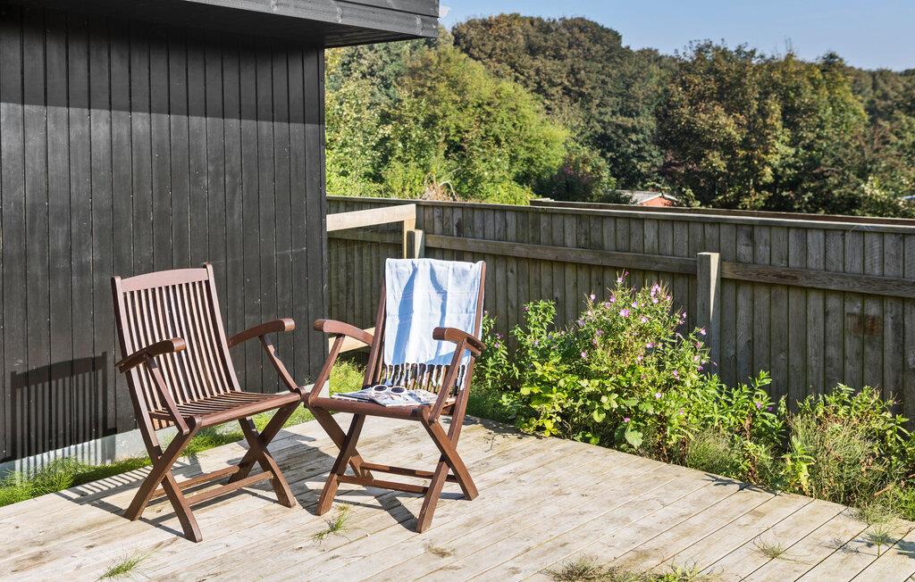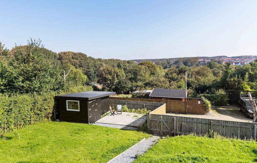 Grunden er let skrånende, så I får en dejlig udsigt til trækronerne fra haven. Sæt jer på terrasserne med kaffe eller dagens måltider og nyd de smukke omgivelser på en lun sommerdag.