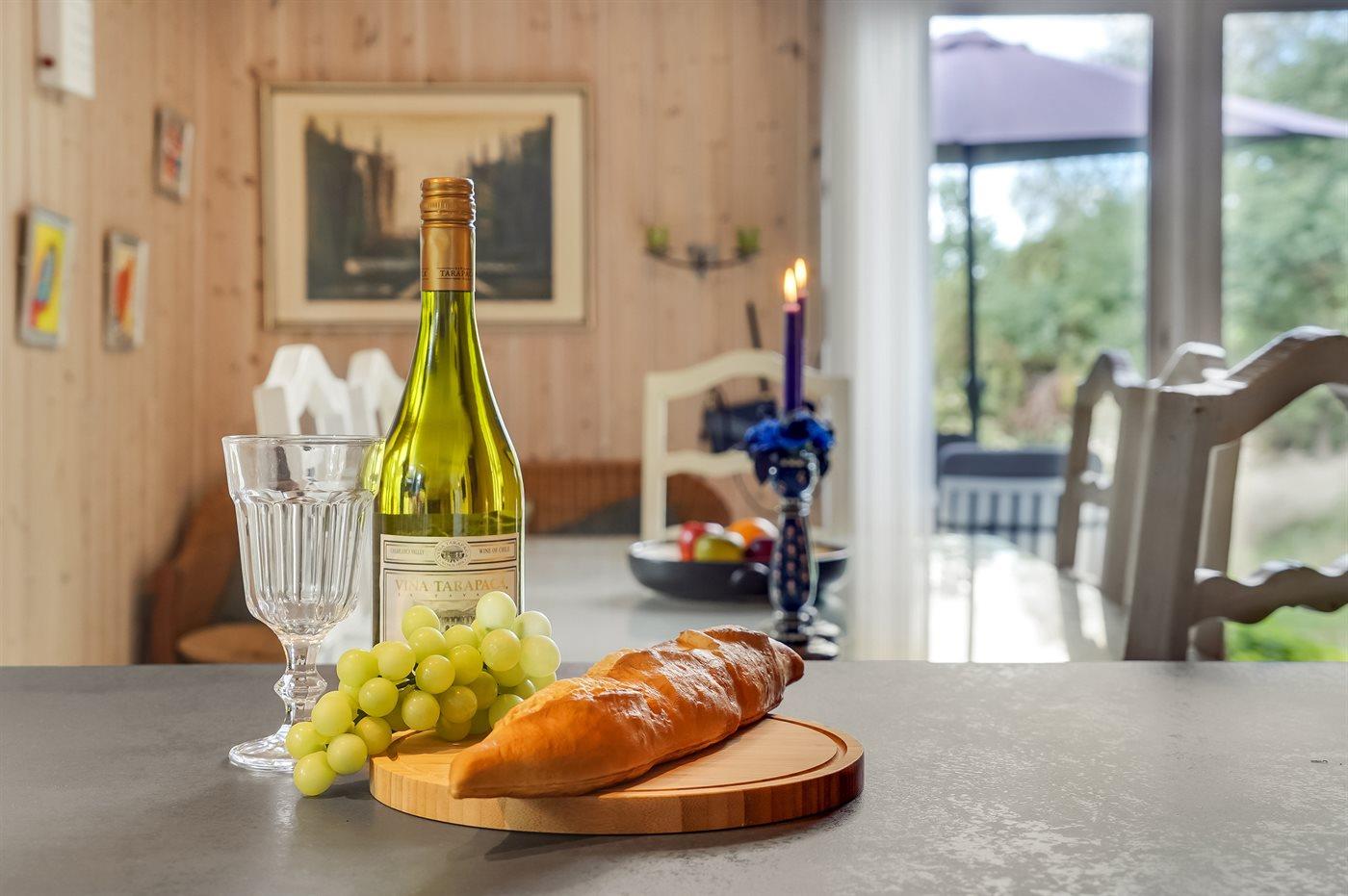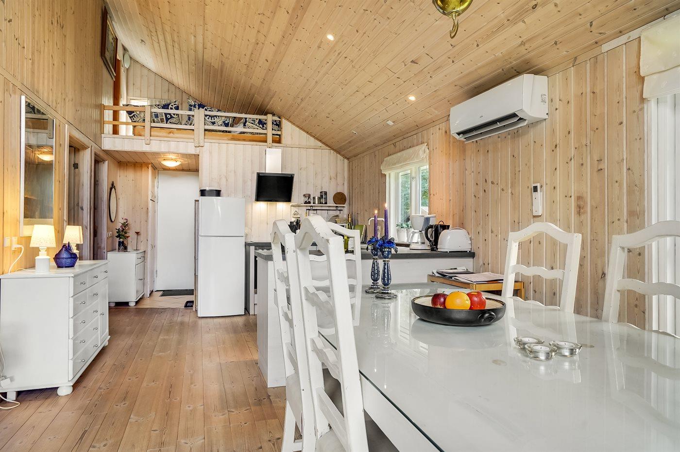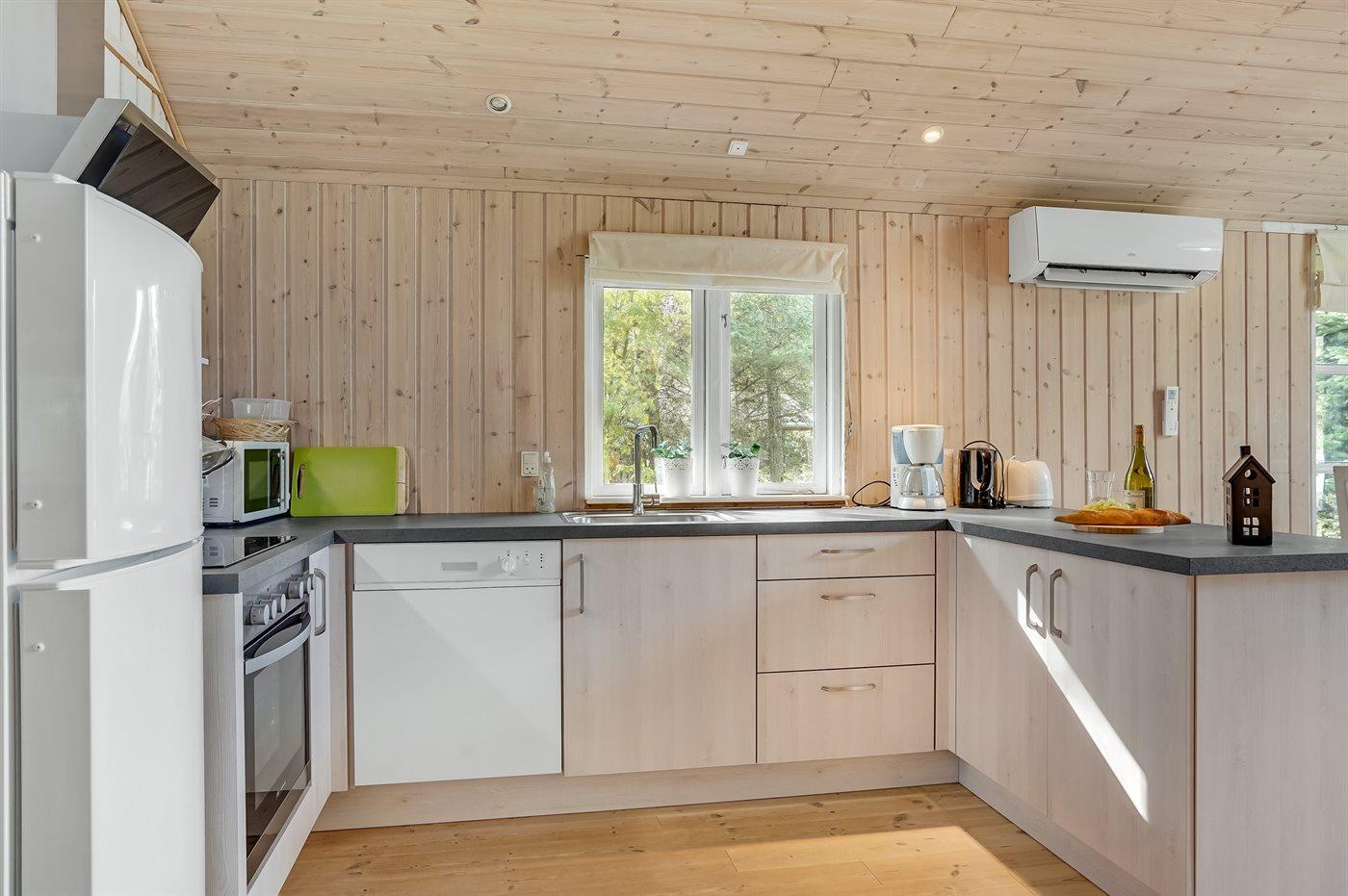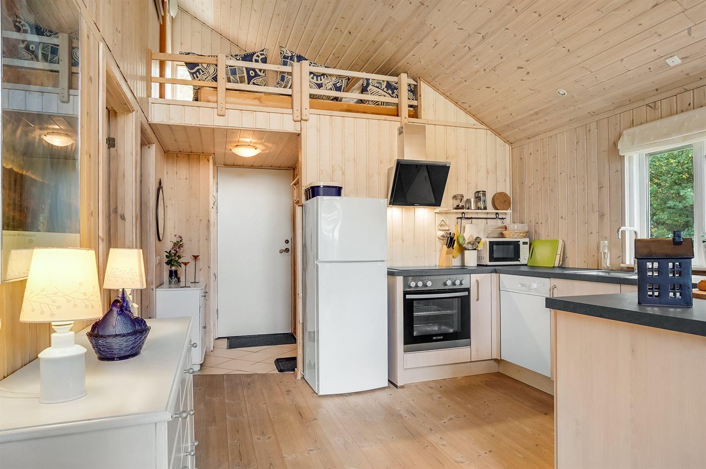 Køkkenet er udstyret med 1 køleskab. Der er 4 keramiske kogeplader, varmluftovn, mikrobølgeovn samt opvaskemaskine.