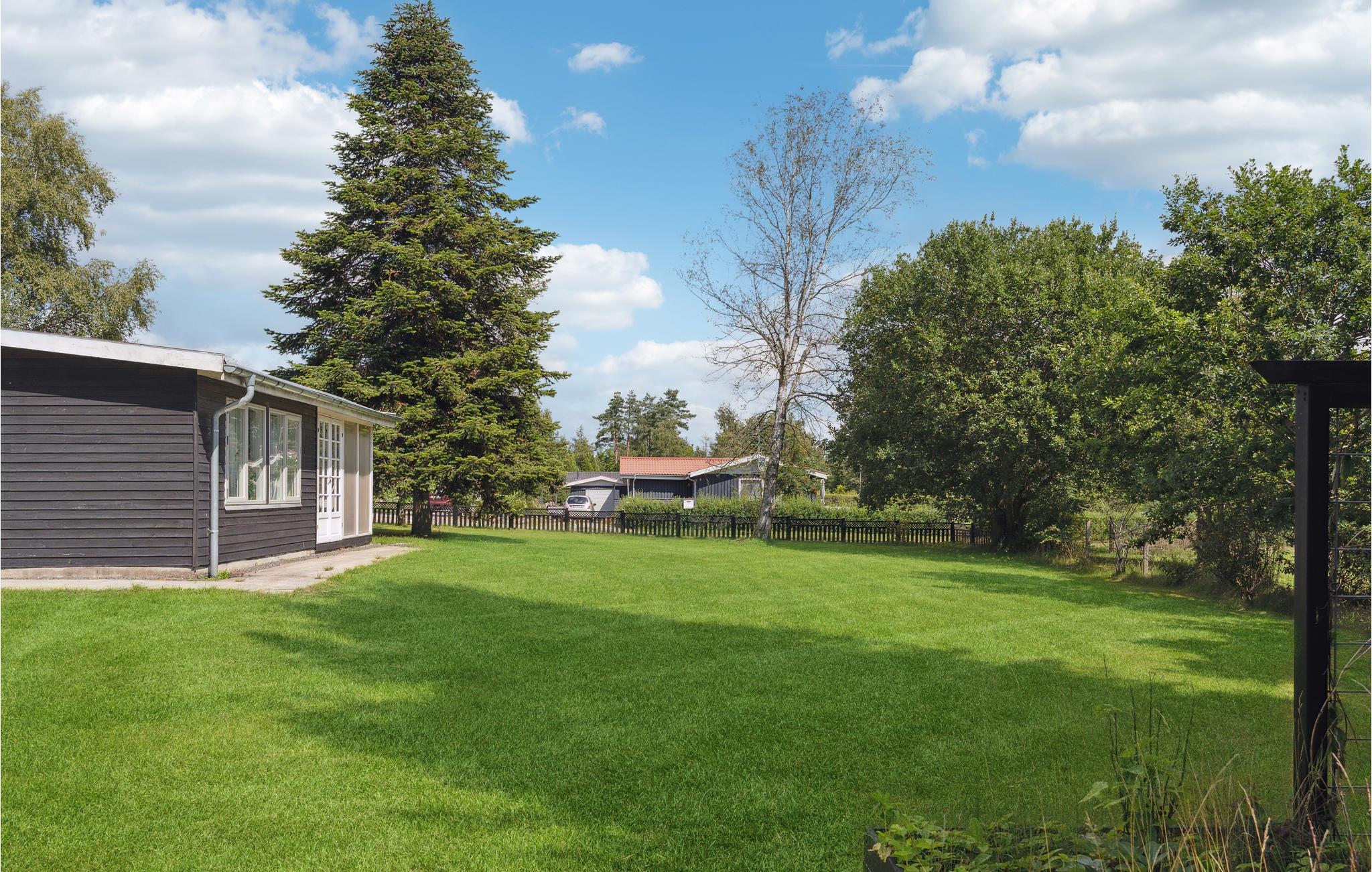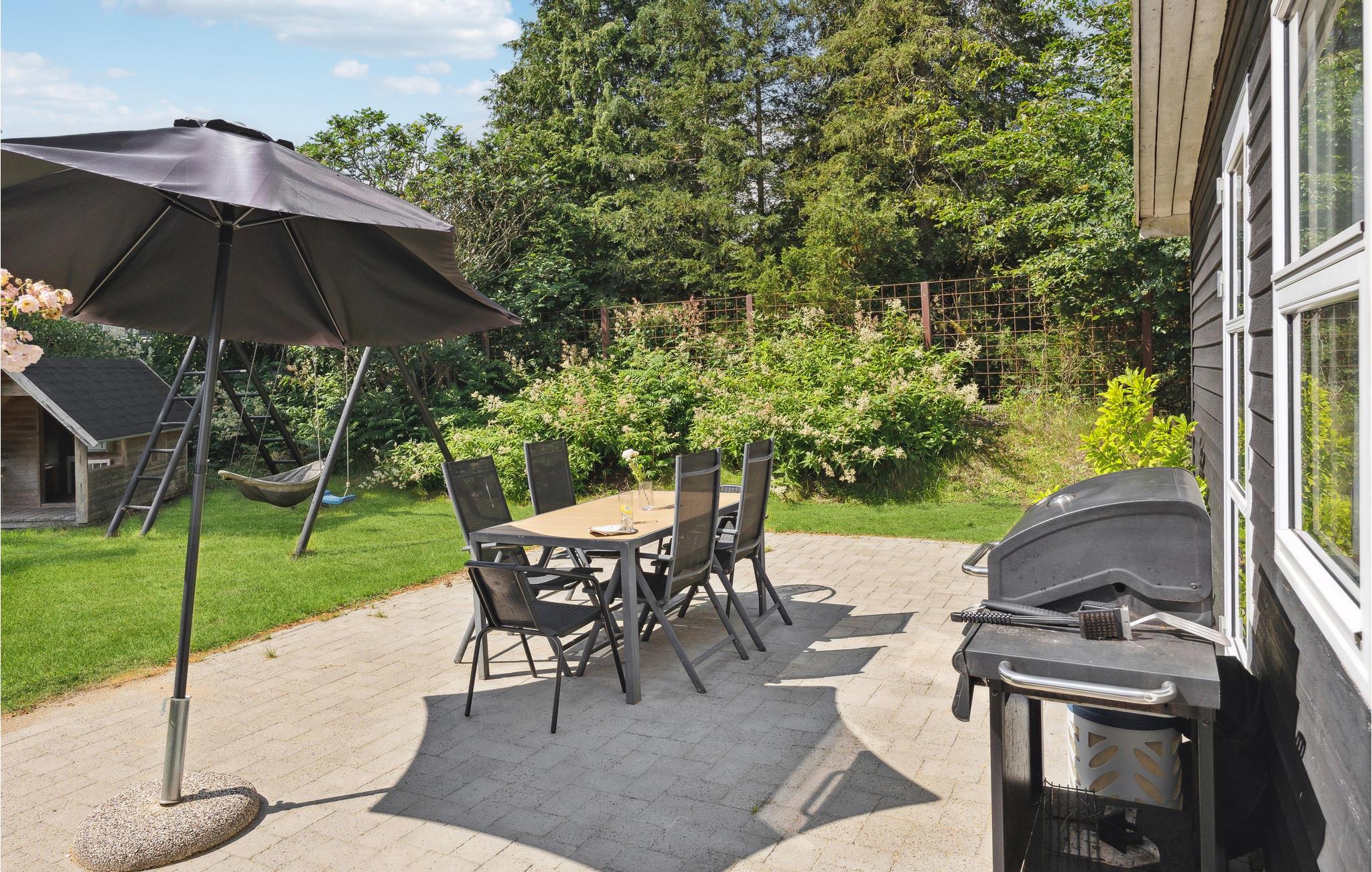 Det attraktive hus byder jer velkommen på en idyllisk grund omgivet af træer. Husets trævægge, de lyse møbler og de store vinduer bidrager til en dejlig atmosfære nær naturen. Fra sofaen har I udsigt til den dejlige have. Om aftenen vil brændeovnens stille knitrende flammer sprede hygge, mens I nyder den tiltrængte kvalitetstid.
