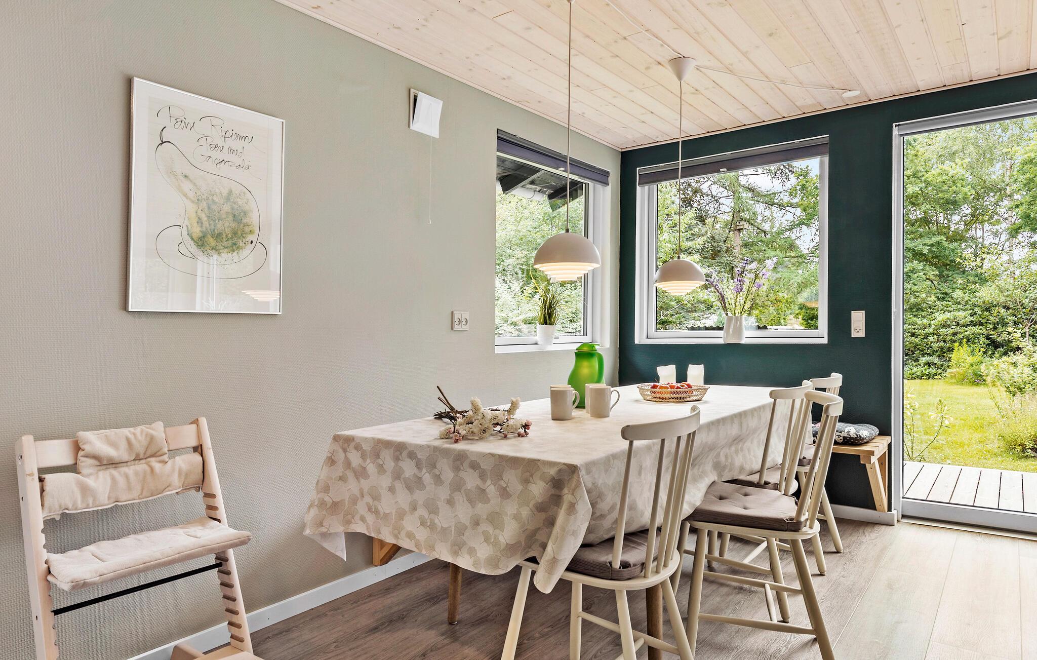 Begynd dagene stille og roligt og nyd en skøn morgenmad ved det lange spisebord, som har plads til hele familien. Viser vejret sig fra sin gode side, kan I tage maden med ud på terrassen, mens I kan nyde udsigten over den grønne have. De bløde sofaer i stuen med brændeovn er det oplagte sted at lade sine batterier op og blive klar til ferien.