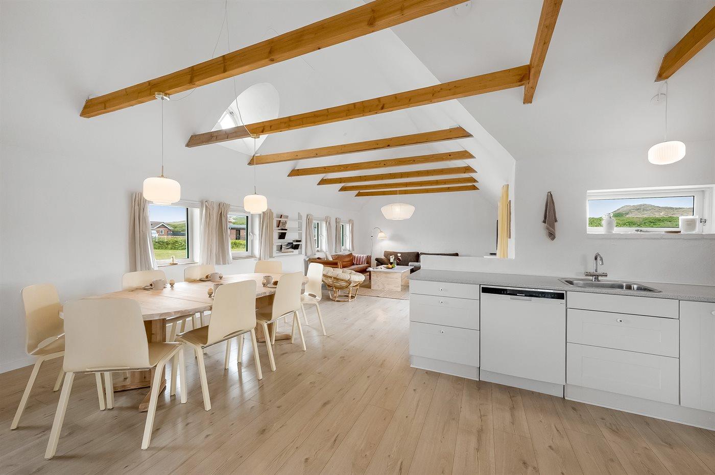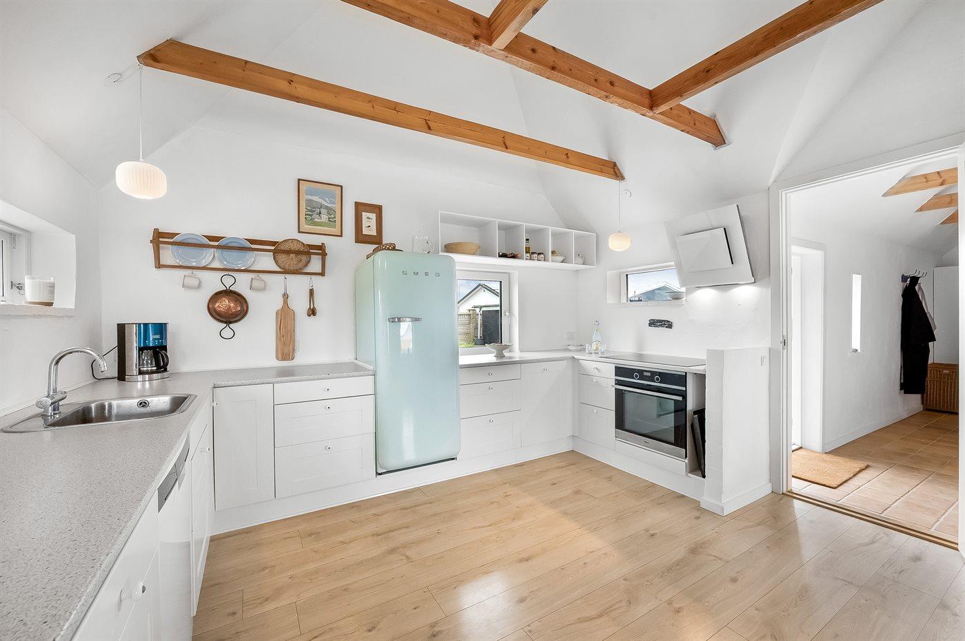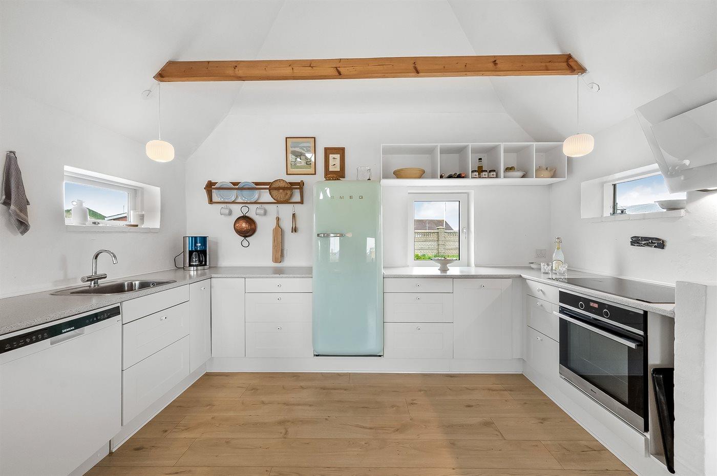 Køkkenet er udstyret med 2 køleskabe. Der er 4 induktionskogeplader, varmluftovn, mikrobølgeovn samt opvaskemaskine.
