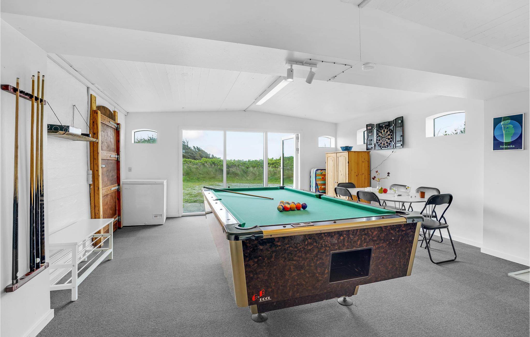 Her er virkelig tale om et sommerhus med en ganske unik beliggenhed. Huset ligger på en stor naturgrund hvor størstedelen er et smukt udgravet område. Tidligere lå her en grusgrav, hvor bl.a. kråsegrus til ænder og gæs blev gravet op, men med tiden slap gruset op og med sin placering ud til Nissum Fjord fyldtes de store huller langsomt med vand, og resultatet er det, I ser i dag. Rundt i det 25 ha store område er der stier, som I frit kan benytte, og som noget ganske specielt, har I under opholdet eneretten til at fiske med stang i søerne (uden fisketegn), hvor I kan fange ørreder, skrubber eller ål (se venligst opslag i huset ang. priser pr. fanget fisk - skal afregnes i huset). Husejer sætter fisk ud i området for pengene, så der vil altid være noget at fange.