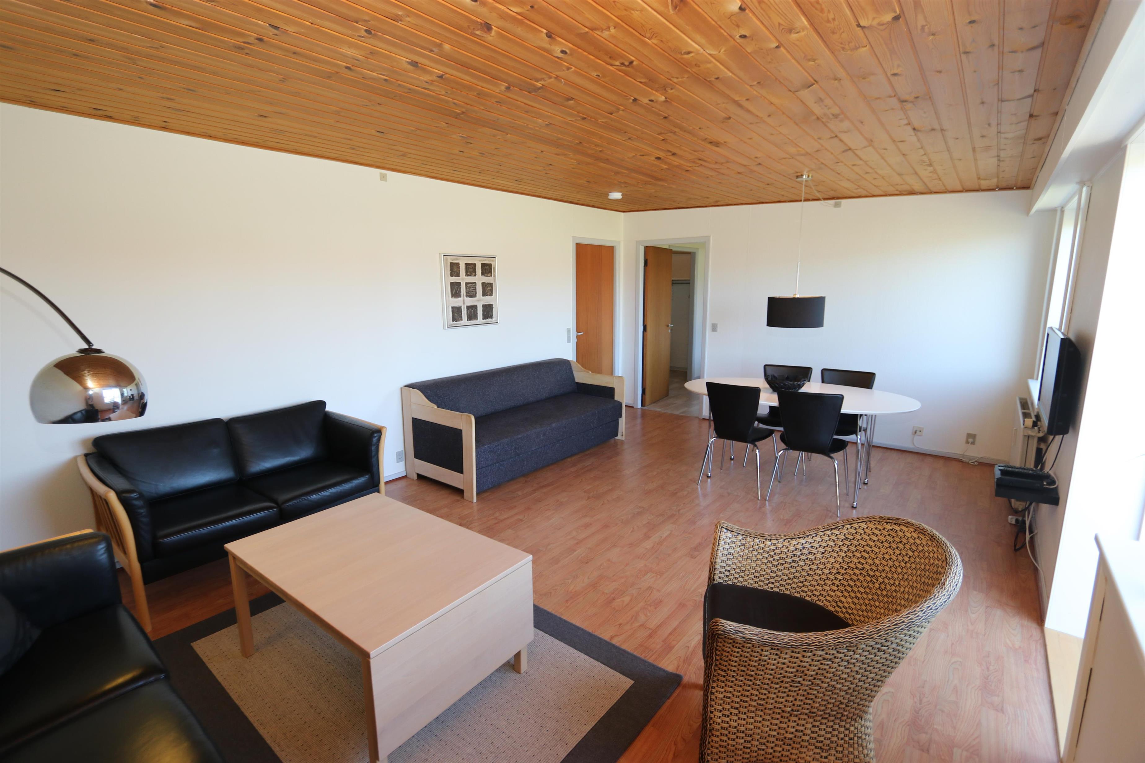 Godt indrettet lejlighed på 72 m2 med 1 soveværelse (1DS). I forbindelse med soveværelset er der Walk in closet . Opholdsstue med sofa / dobbelt sovesofa, spiseplads, TV med danske og tyske kanaler, Radio. Veludstyret køkken med Glaskeramisk komfur, emhætte, opvaskemaskine og køleskab med fryseboks. Brygges med ekstra håndvask og ekstra fryser. Det perfekte rum til ekstra opbevaring og nedfrysning af fisk eller frysevarer. Stort badeværelse med toilet, håndvask og bruser. Der er trægulv i opholdsstuen, linoleum i køkken og på badeværelse og gulvtæppe i soverummet. F Barnestol og barneseng til de mindste. Ikke ryger lejlighed. 1 husdyr tilladt.