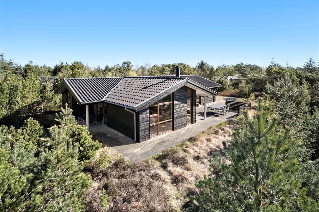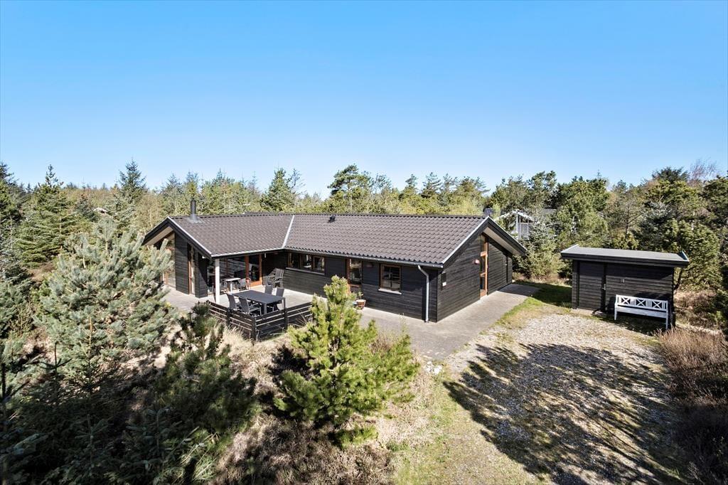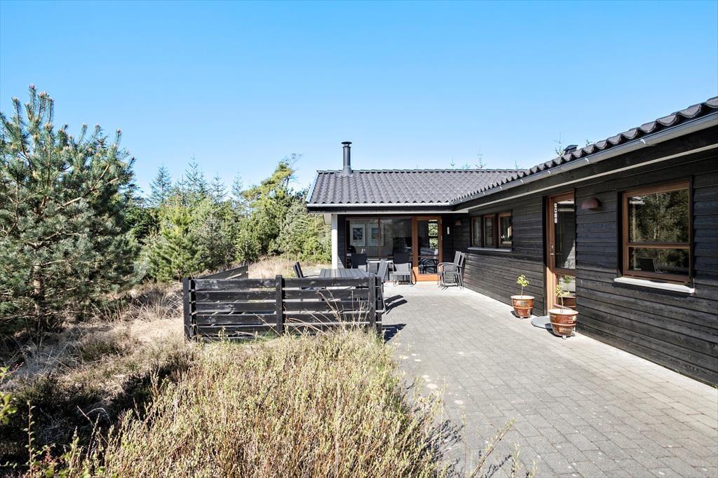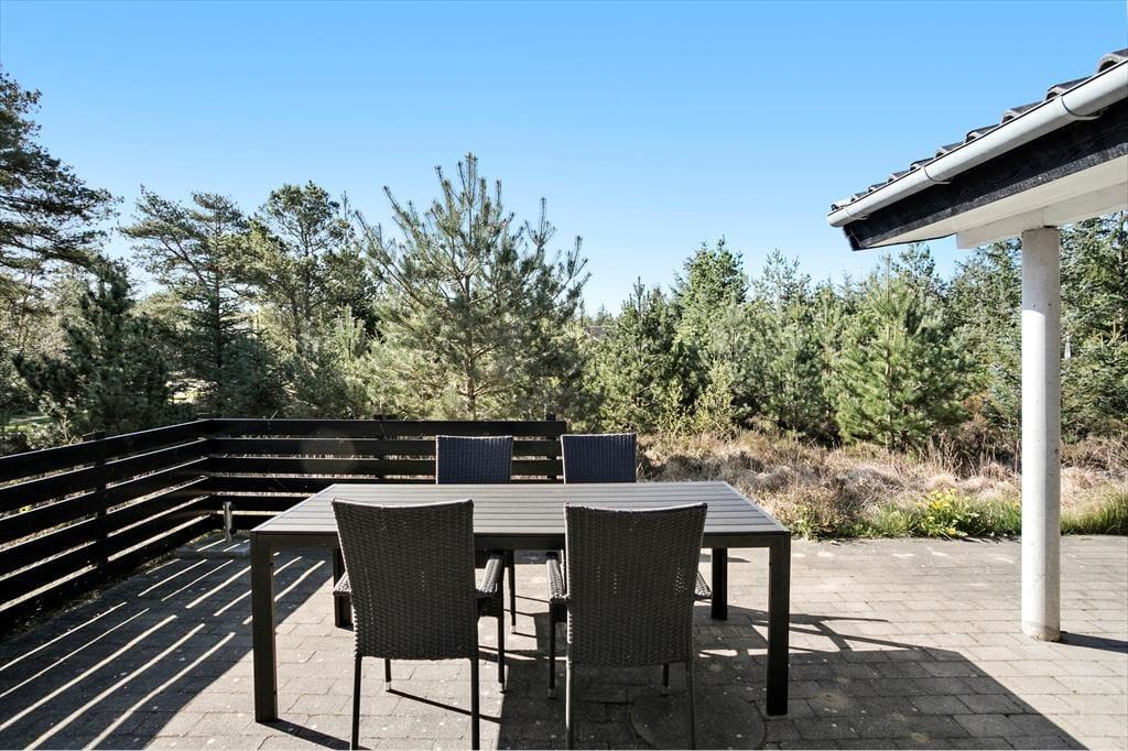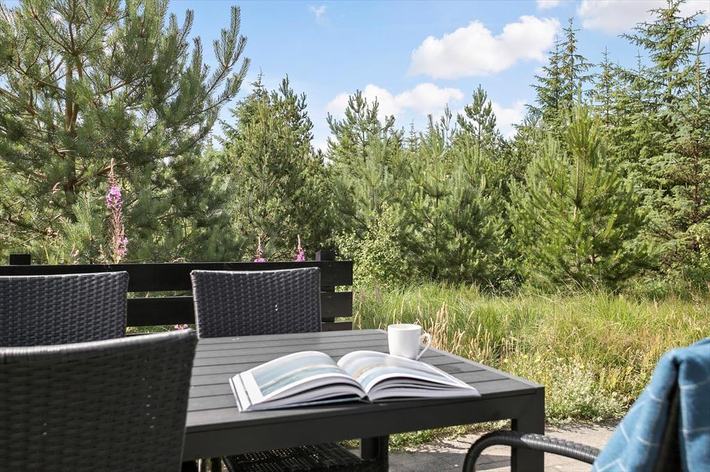 Udearealerne er dejligt rolige og ugenerede, for sommerhuset ligger på en 1269 m2 stor naturgrund med skærmende beplantning. Det føles nærmest som at bo midt ude i naturen – dog er der åbnet op omkring sommerhuset, hvor der er anlagt en stor, solrig og delvist overdækket fliseterrasse. Her er der havemøbler og en parasol til rådighed, og hvis I kan lide at grille, er det oplagt at tilberede flere af feriemåltiderne under åben himmel.