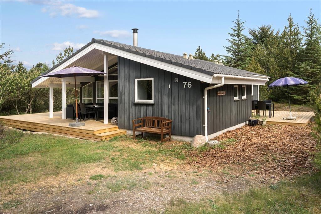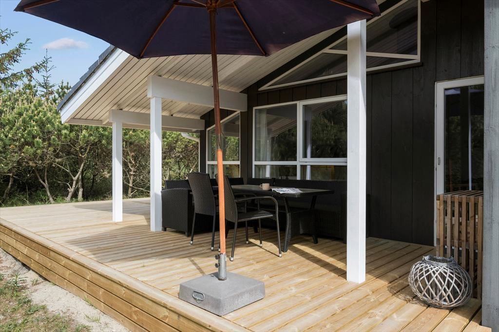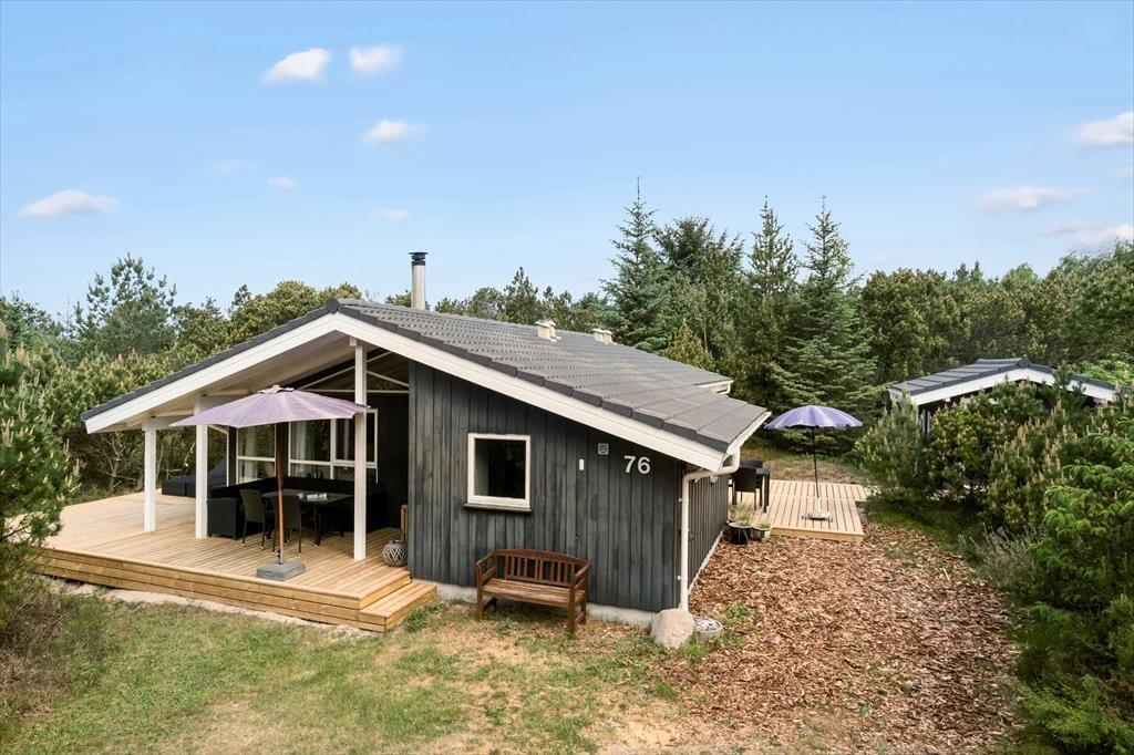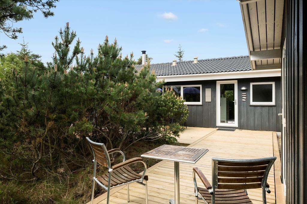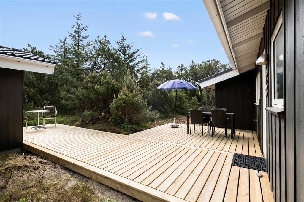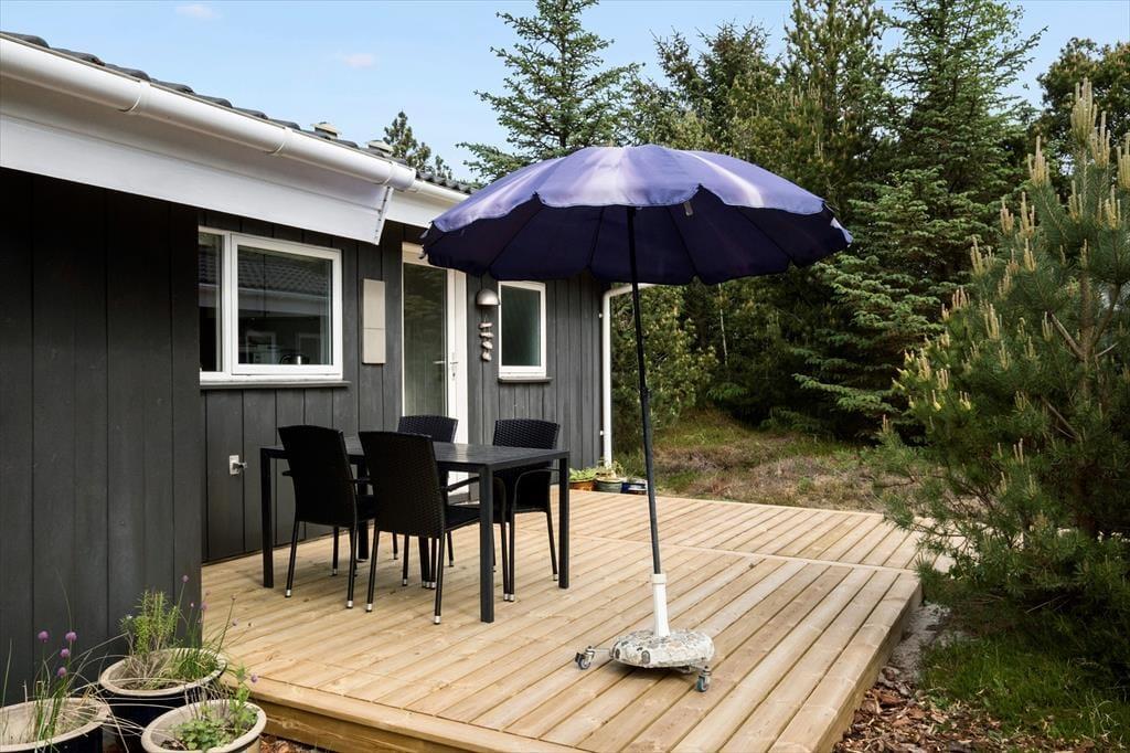 Sommerhusets 1.260 m2 store grund rammes på smukkeste vis ind af grantræer og lyng, så terrasseafslapning og leg på græsplænen kommer til at foregå i flotte og fredelige rammer. Ved huset er der to terrasser at vælge imellem og både åbne og overdækkede områder, så I kan frit vælge mellem sol og skygge, inden I sætter jer i havestolene eller begynder at tænde op i grillen.