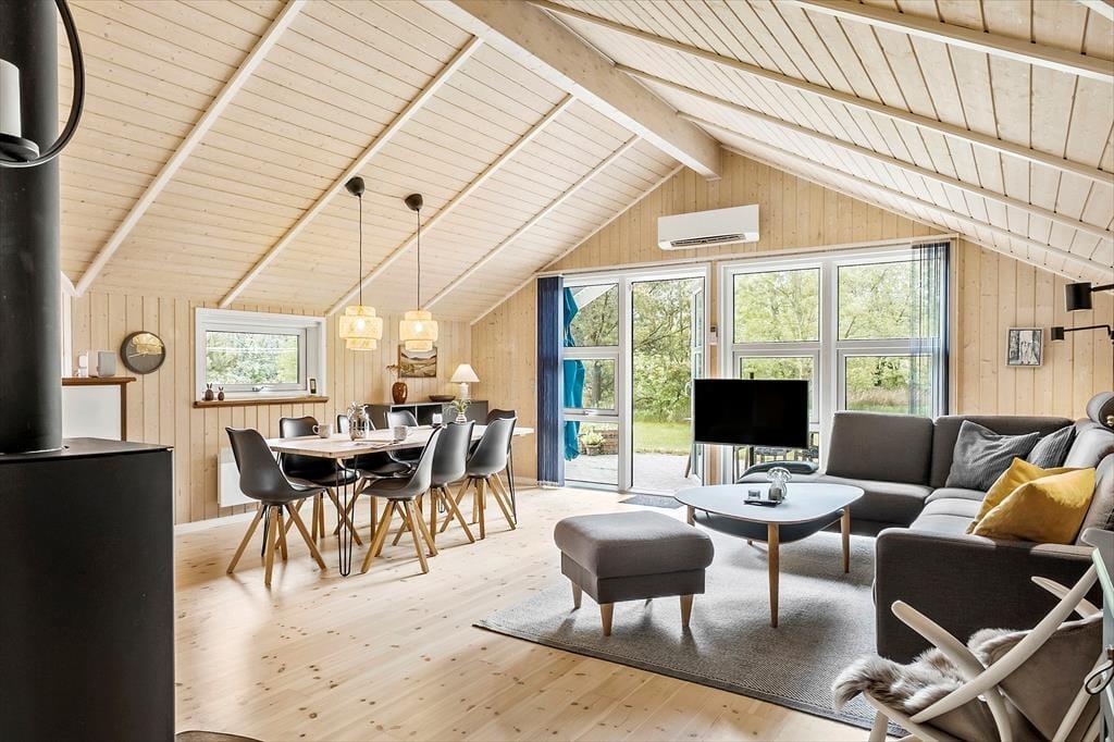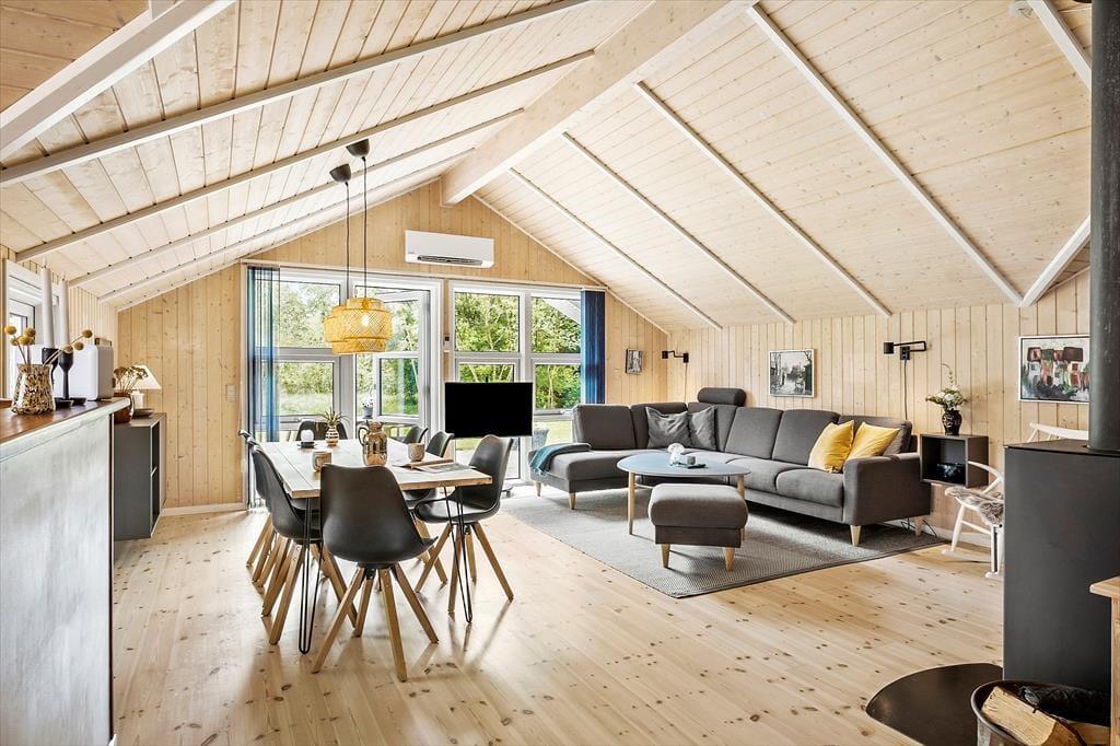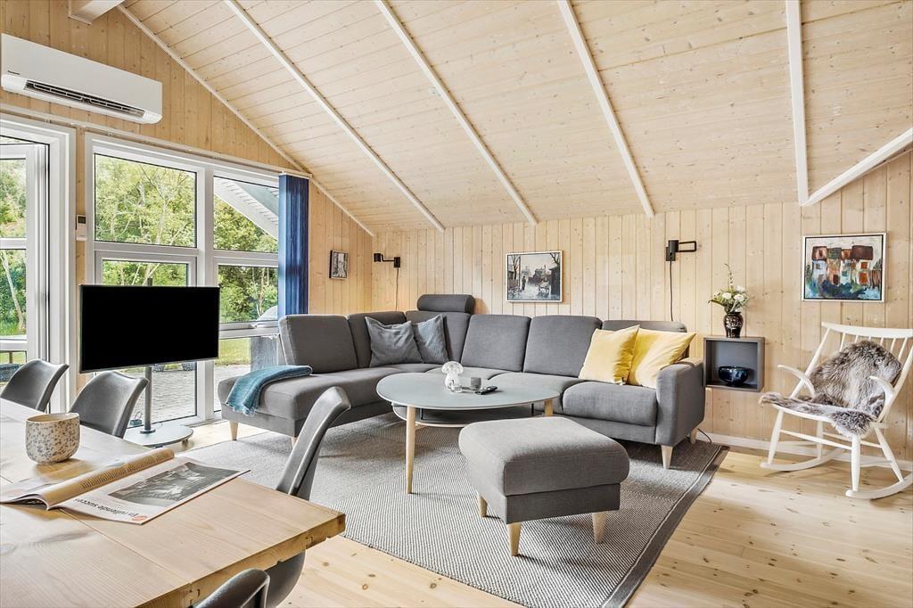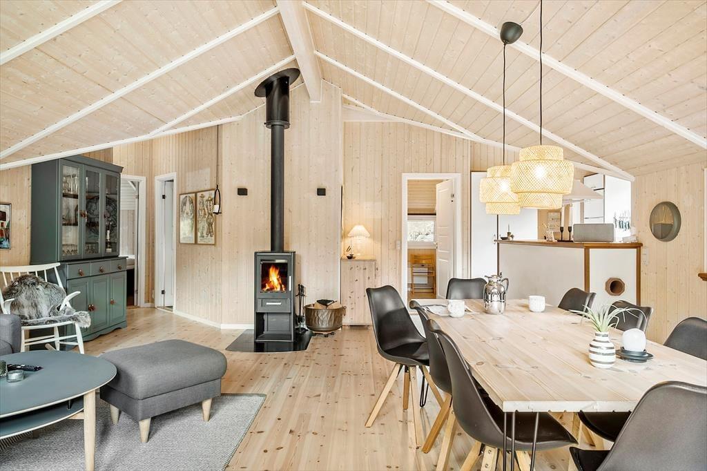 Inde bag husets charmerende blå facade får du rig mulighed for at koble af og nyde livet med dine kære. Stuen, som har loft til kip, lys træbeklædning og kønt møblement, er et dejligt opholdssted – for eksempel på en kølig dag, når der er ild i brændeovnen, og det dufter af nybagte boller fra det åbne køkken. Spabadet og saunaen vil sikkert vække lykke, hvis du har været ude i naturen hele dagen og trænger til at slappe af i krop og sind, og når det er ved at være sengetid, har du og familien tre gode soveværelser at fordele jer på.