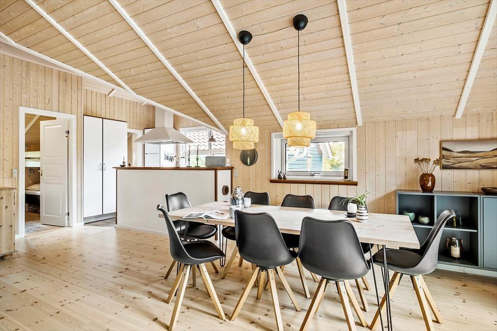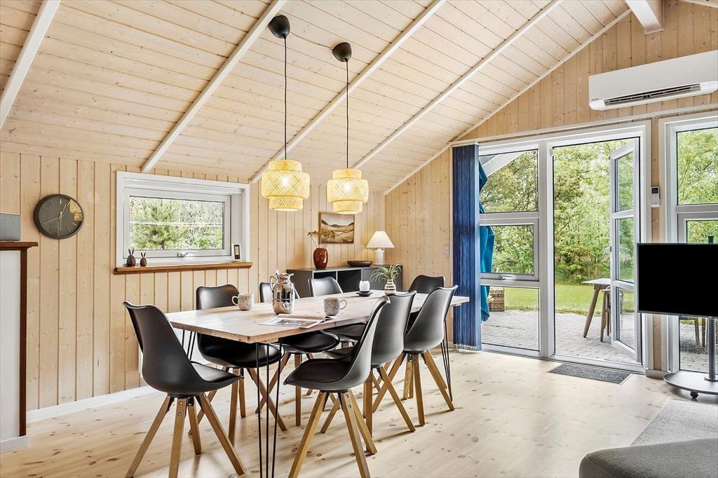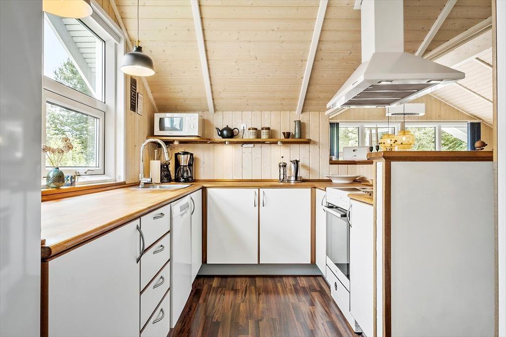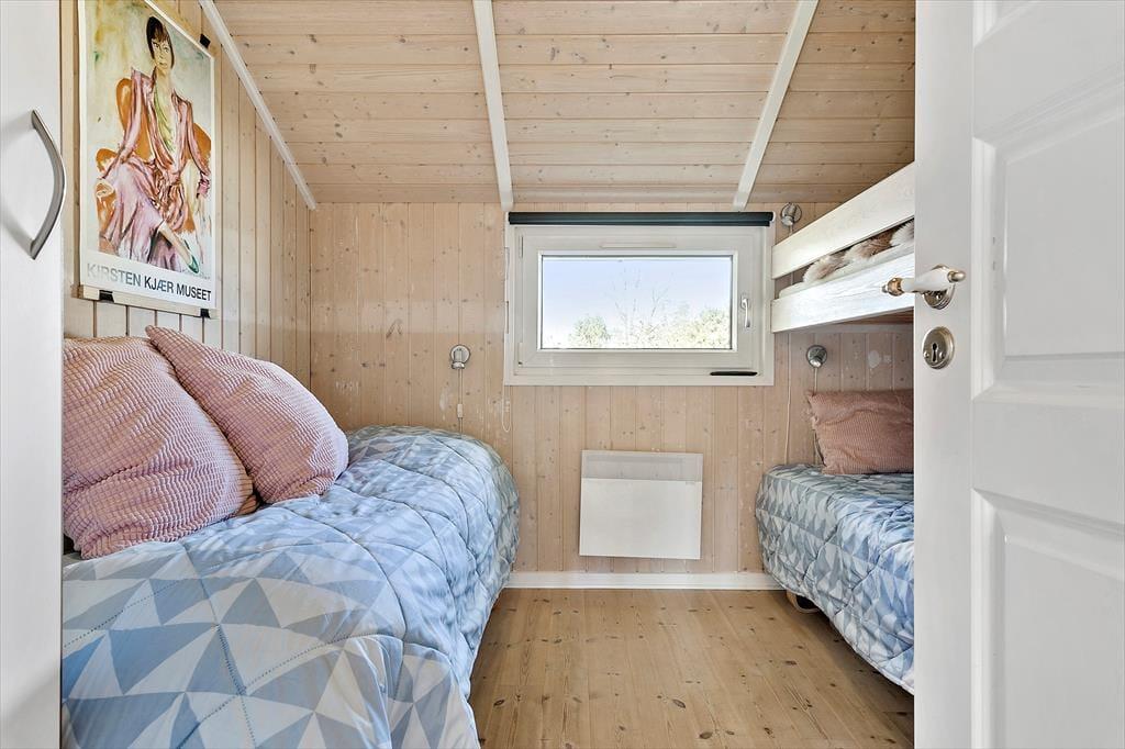 Sommerhuset ligger roligt placeret på Tyttebærstien, der er en lukket vej med små sideveje og et godt stisystem tilknyttet. Det gør det nemt at komme rundt, for eksempel hvis hunden skal luftes, eller når du vil tage børnene med hen på den gode naturlegeplads i Vester Thorup Klitplantage. En daglig tur på stranden er selvfølgelig også oplagt, når I bor bare en kilometer fra Vesterhavet, og det er ligeledes fristende ofte at lægge vejen forbi Thorup Strands autentiske landingsplads – især fordi du her finder det lokale fiskehus, der sælger fiskefrikadeller og andre lækkerier lige ud til vandet.