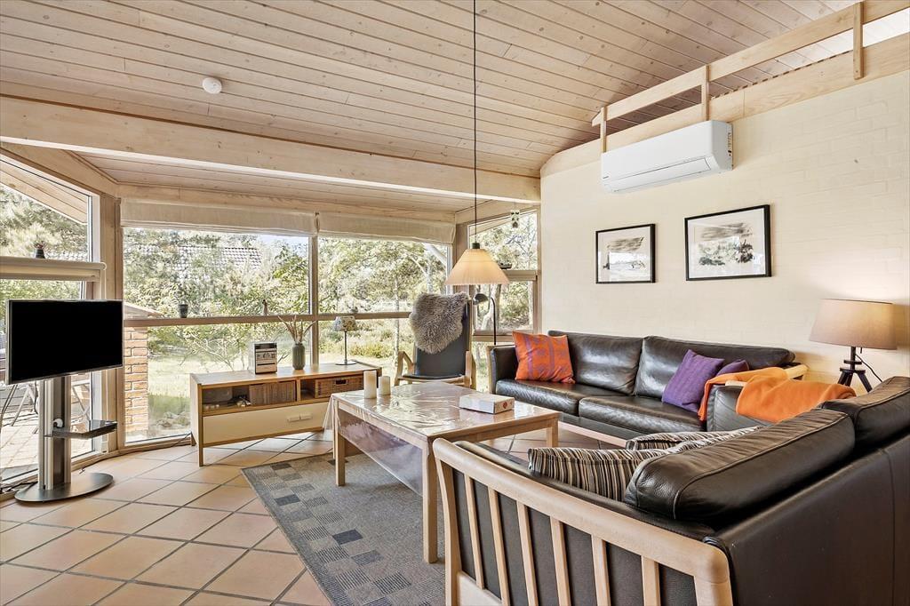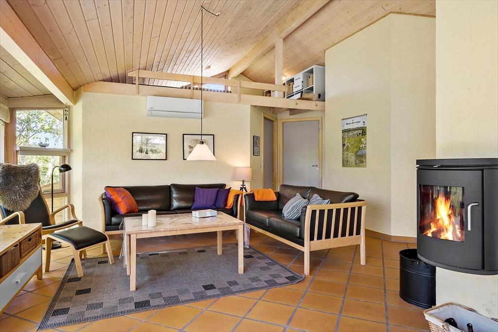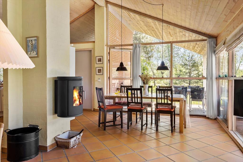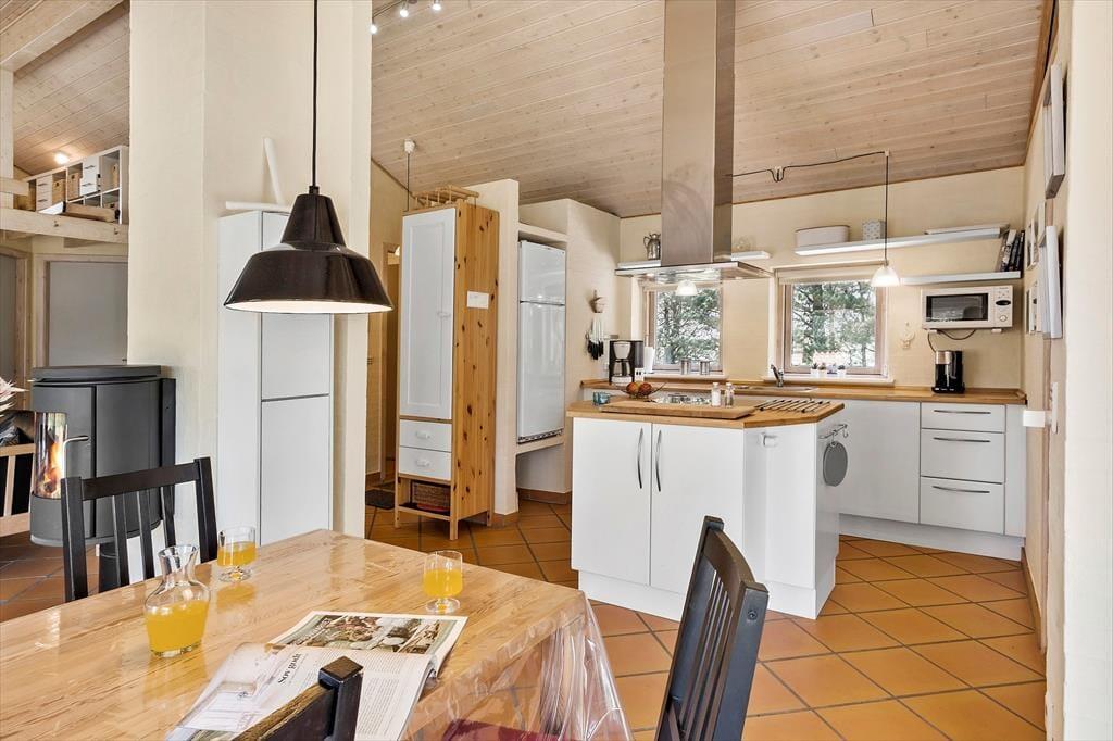Med så velindrettet og gedigent et hus som dette kan ferien foregå på alle tider af året. Har I mest lyst til at hygge jer indenfor, kan I tænde op i stuens brændeovn, inden I finder jeres medbragte brætspil frem eller går i gang med at strikke eller læse bøger. I det åbne køkken har I gode arbejdsforhold, og hvis I har børn med, vil de måske synes, at det er sjovt at kravle op på hemsen for at lege, mens de voksne hyggesnakker og laver mad. Fra den lyse stue har I adgang til tre gode soveværelser, og der er også et brusebadeværelse, der har indlagt gulvvarme ligesom entréen og opholdsafdelingen.