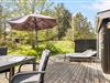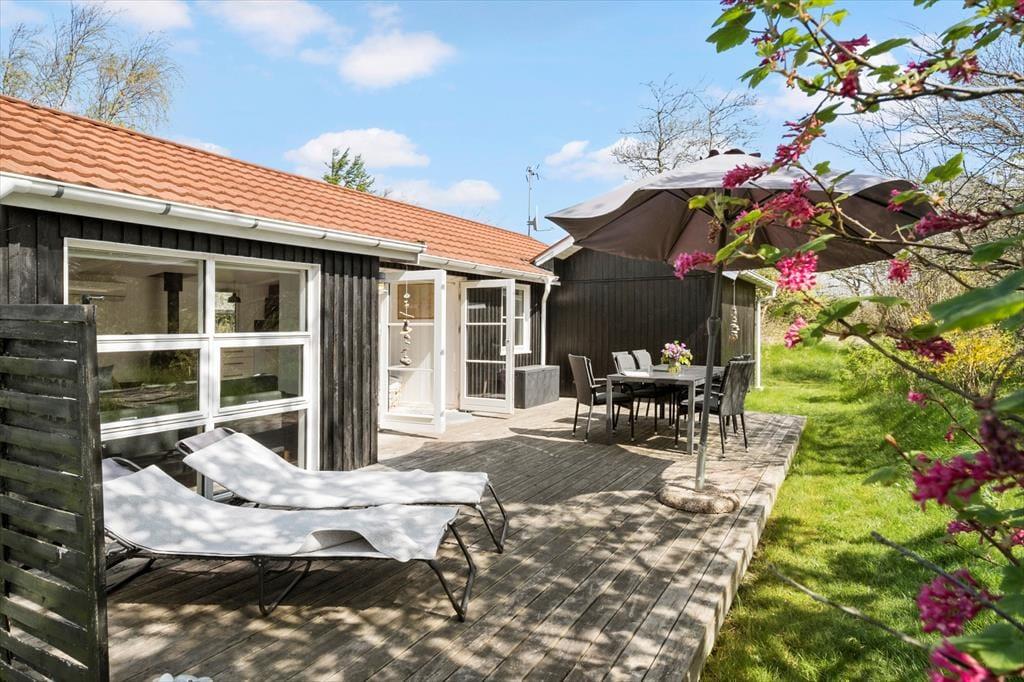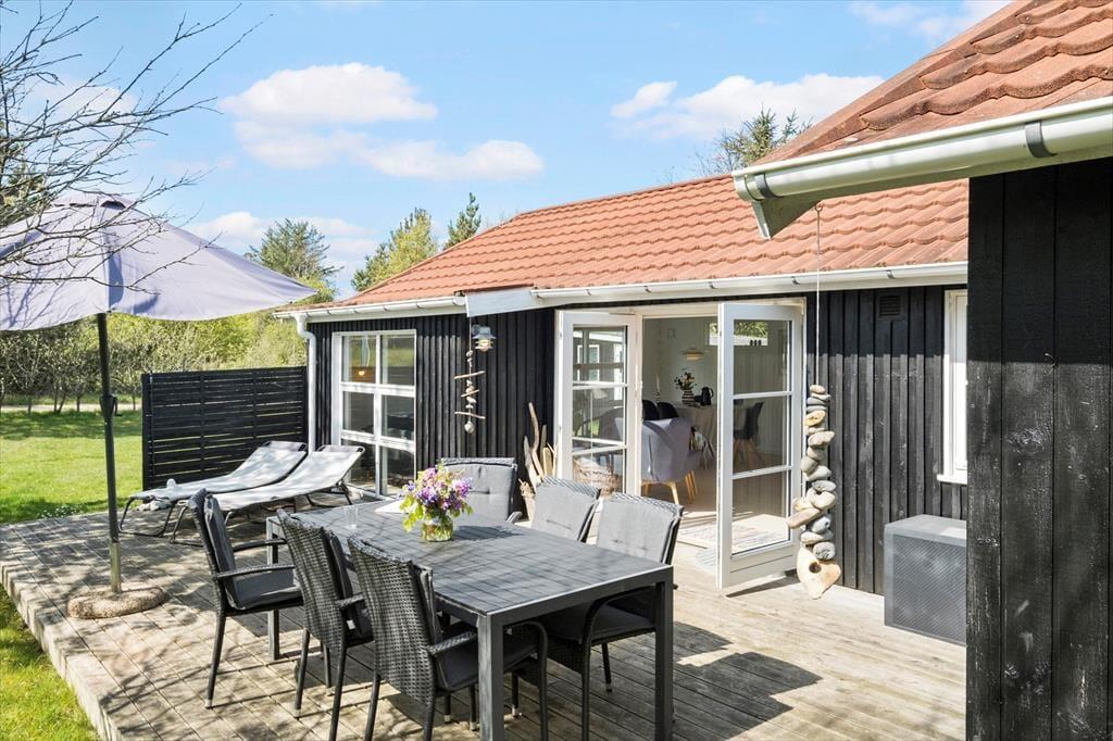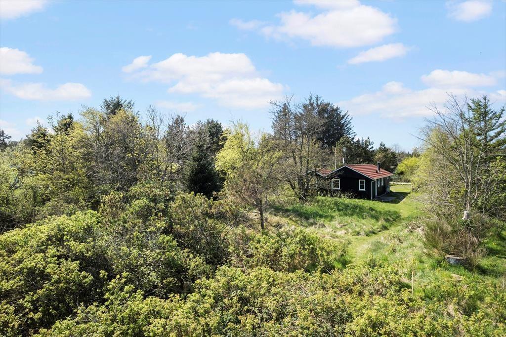 Sommerhuset ligger på en stor naturgrund, hvor de høje træer og mange buske sikrer, at man kan opholde sig helt ugeneret udenfor. På sydsiden ligger en dejlig stor træterrasse og ved indgangen til huset på nordsiden er også et mindre areal, som er god til en kop eftermiddagskaffe. I det sydvestlige hjørne af haven er også en skøn plet med havemøbler, her kan man rigtig nyde naturen oppe fra den lille høj.