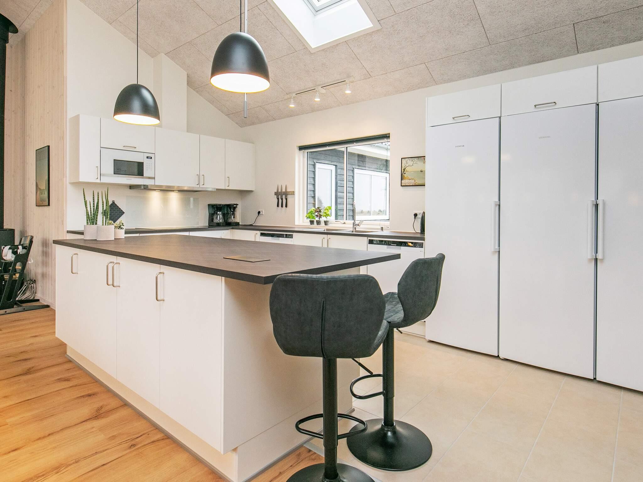 Når I alle skal kokkerere sammen er der god plads til dette i sommerhusets store køkken/alrum, som udover at være hyggeligt indrettet også er veludstyret med to ovne, to opvaskemaskiner og to store køleskabe. Afslutningsvist kan den gode mad nydes ved rummets lange spisebord, hvor hele familien kan samles.