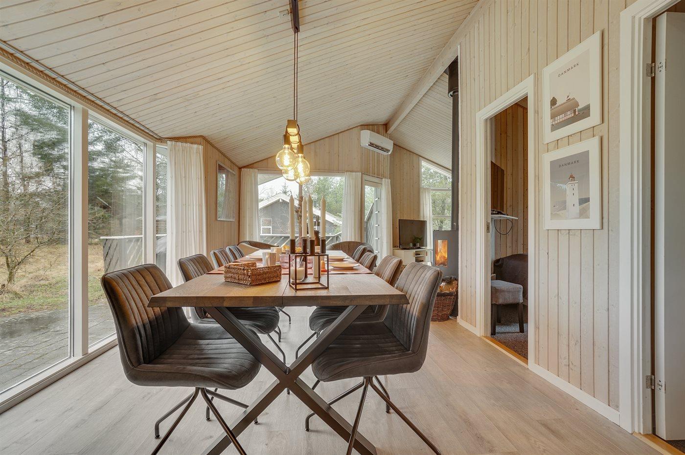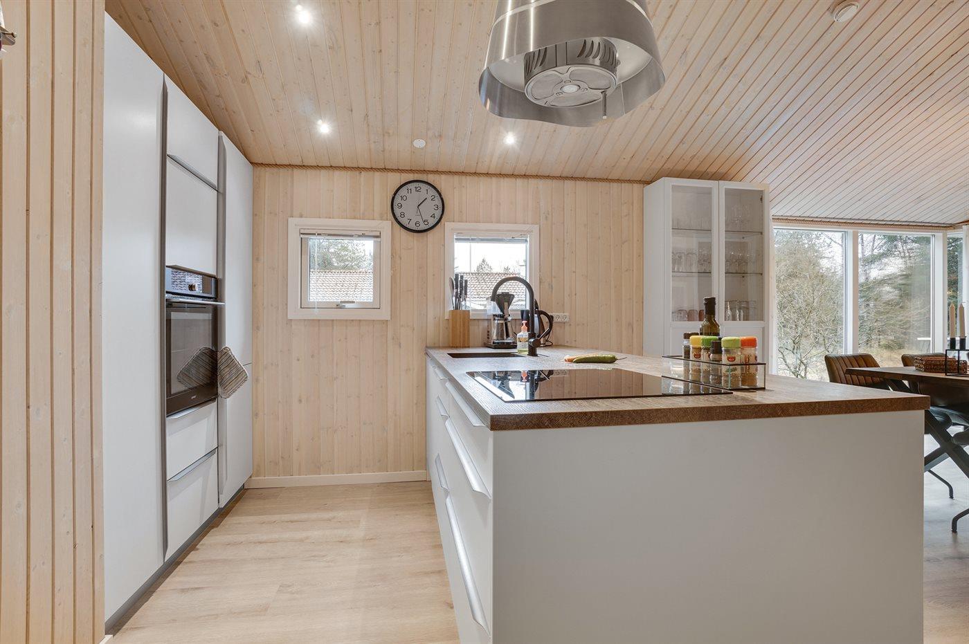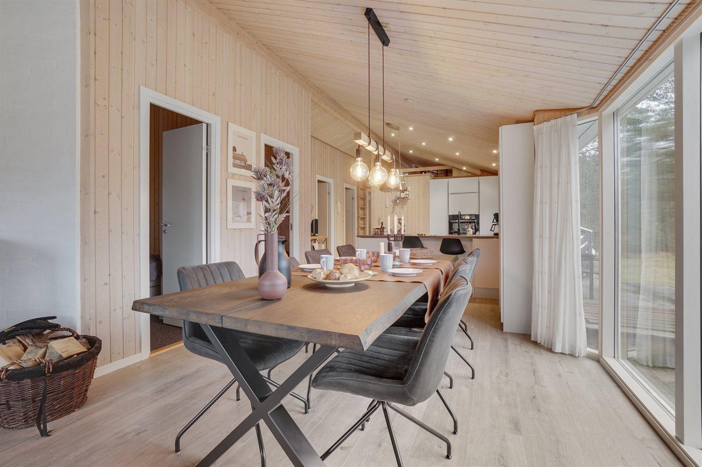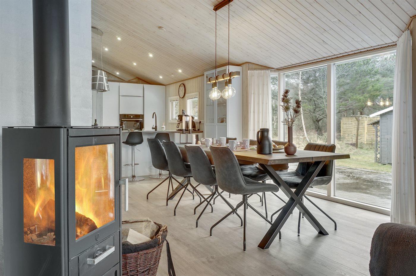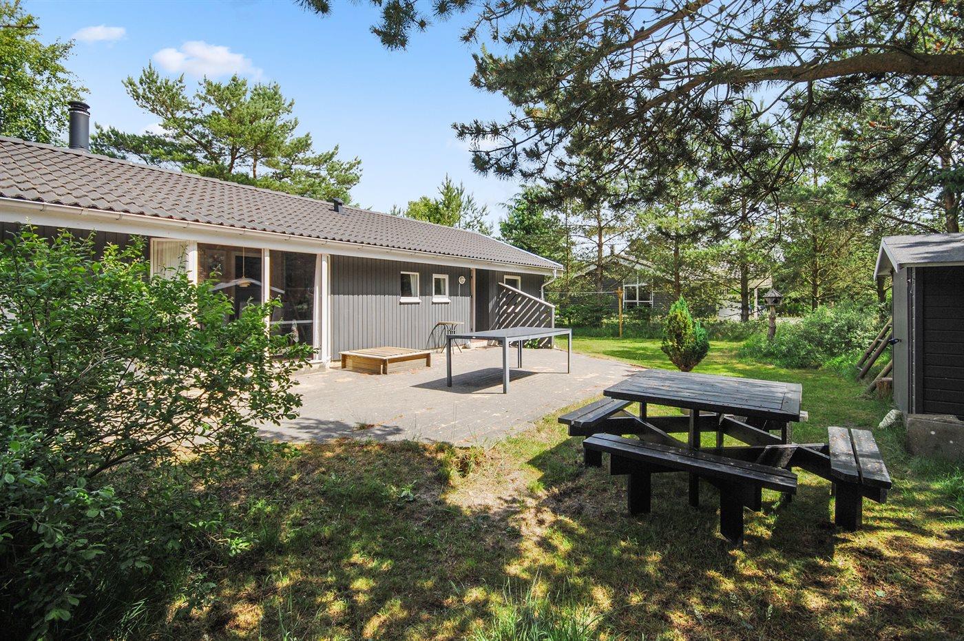 Et virkelig dejligt, veludstyret sommerhus, bygget i træ 2000 og løbende vedligeholdt. Åben såvel som overdækket terrasse med pæne havemøbler. Indvendigt er vægge og lofter beklædt med lyst træ, trægulv i stue og tæpper på værelser. 2 pæne badeværelser med bruseniche og gulvvarme; det ene har ligeledes lækker 2-pers. spa og adgang til sauna. Køkkenet er i åben forbindelse med stuen og indeholder bl.a. komfur med keramiske kogeplader, varmluftovn, fryser, mikrobølgeovn og opvaskemaskine. Dejlig, stor stue med bl. a. brændeovn, TV med parabol (digital), video, DVD-afspiller og stereoanlæg med CD-afspiller. Gratis ADSL-internetforbindelse (egen computer skal medbringes). Hems med TV til spil. Huset er indrettet med 4 soveværelser: 2 med dobbeltseng og 2 med hver 2 enkeltsenge. Desuden findes der 2 sovepladser på madrasser på husets hems. Af yderligere udstyr kan vaskemaskine, tørretumbler og 2 ekstra TV nævnes. Til de mindste feriegæster er der gynge, sandkasse, barneseng og høj barnestol til rådighed. Huset fremstår som et særdeles lækkert sommerhus for såvel 1 som 2 familier, der ønsker en ferie i et naturskønt område med mulighed for mange spændende ture i den storslåede natur enten i skovområdet eller ved havet, hvor man om aftenen kan se fiskerne trække deres både på land. Der er særdeles gode bade- og fiskemuligheder i gåafstand fra huset. I den nærliggende by Fjerritslev er der masser af aktivitetsmuligheder, bl. a. svømmehal, bowling eller shopping.