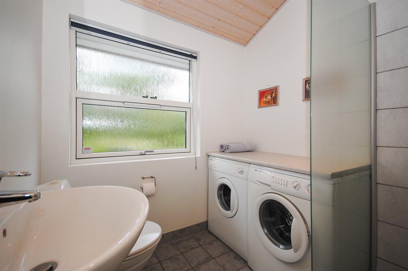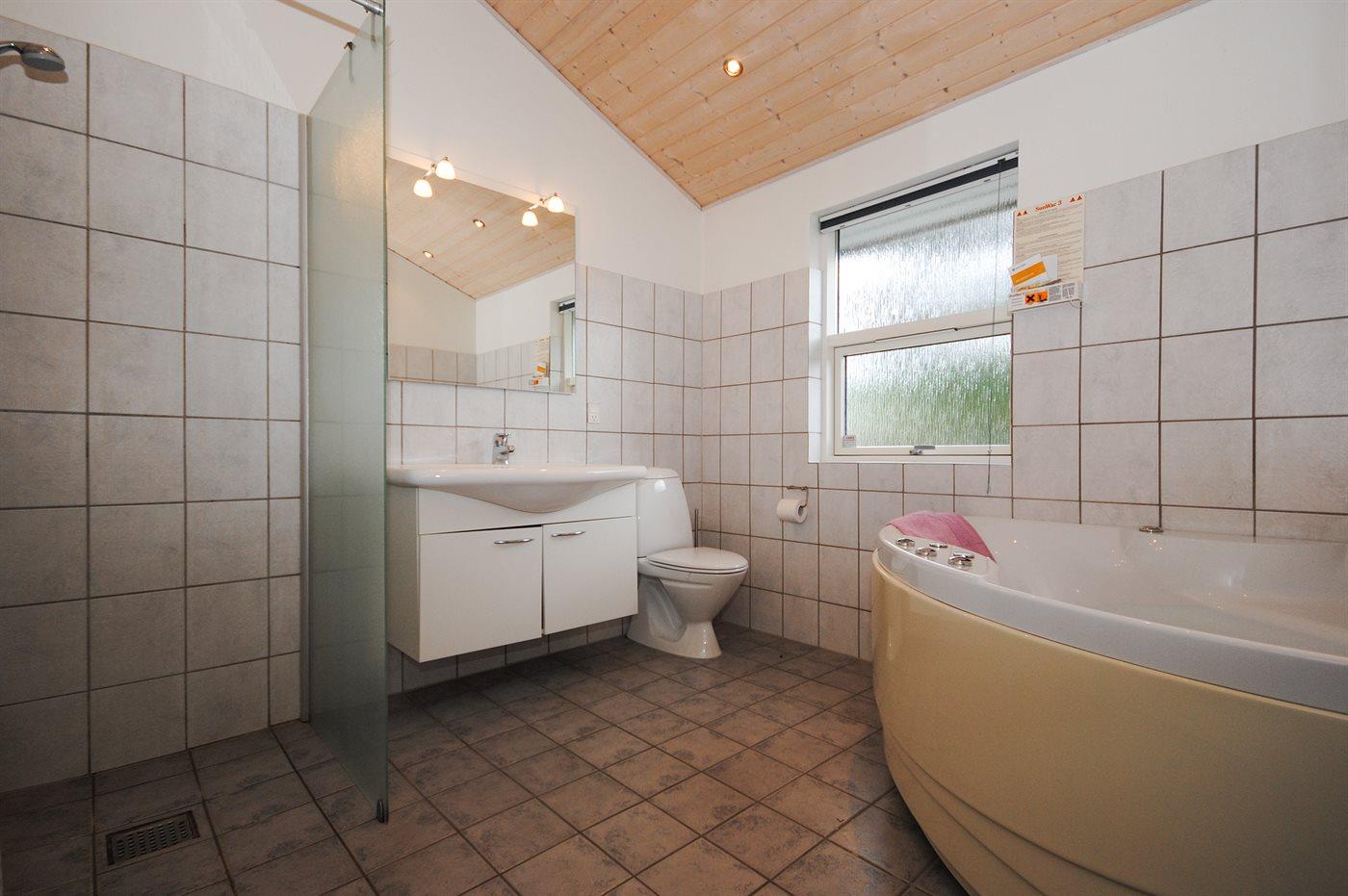 Der er 2 badeværelser med bruseniche og 2 toiletter. Der er gulvvarme på 1 badeværelse. I saunaen er der mulighed for afslapning.