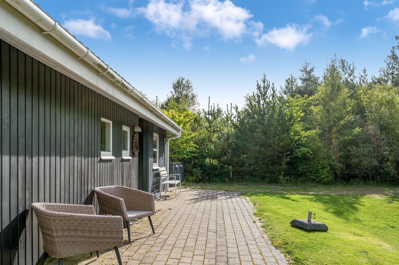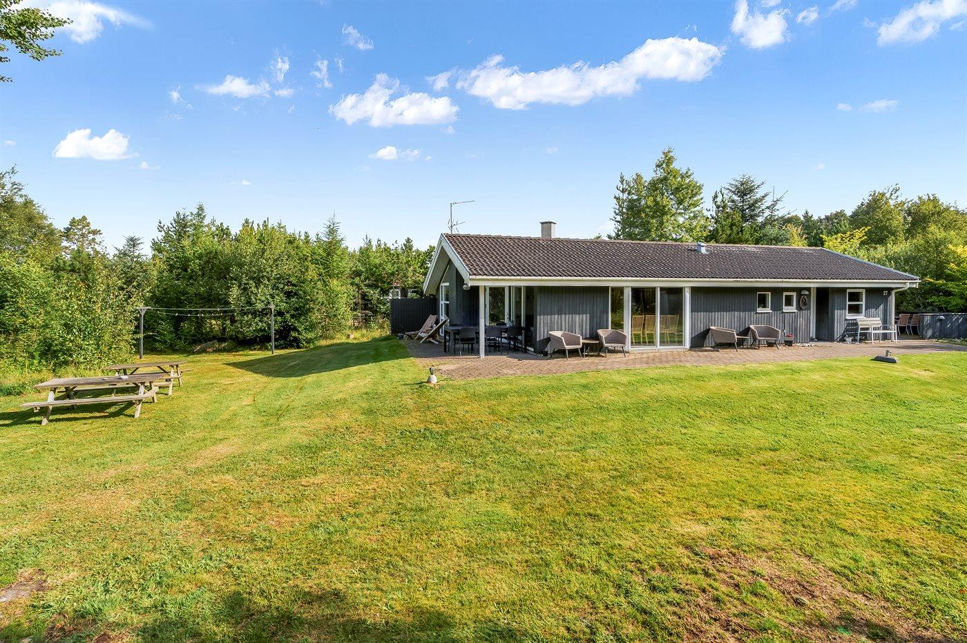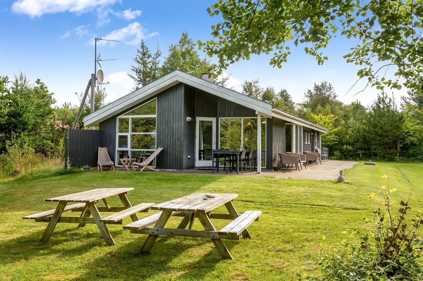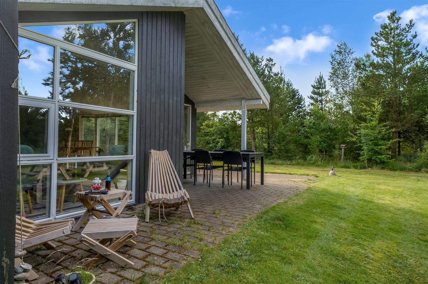 Et stort og flot sommerhus beliggende på en skov-/naturgrund i rolige og ugenerte omgivelser. Til huset hører såvel åbent som overdækket terrasseareal med havemøbler – hvor man kan nyde timer i det fri med en god bog eller en kryds og tværs. Der findes et redskabsrum til opbevaring af cykler o.l.