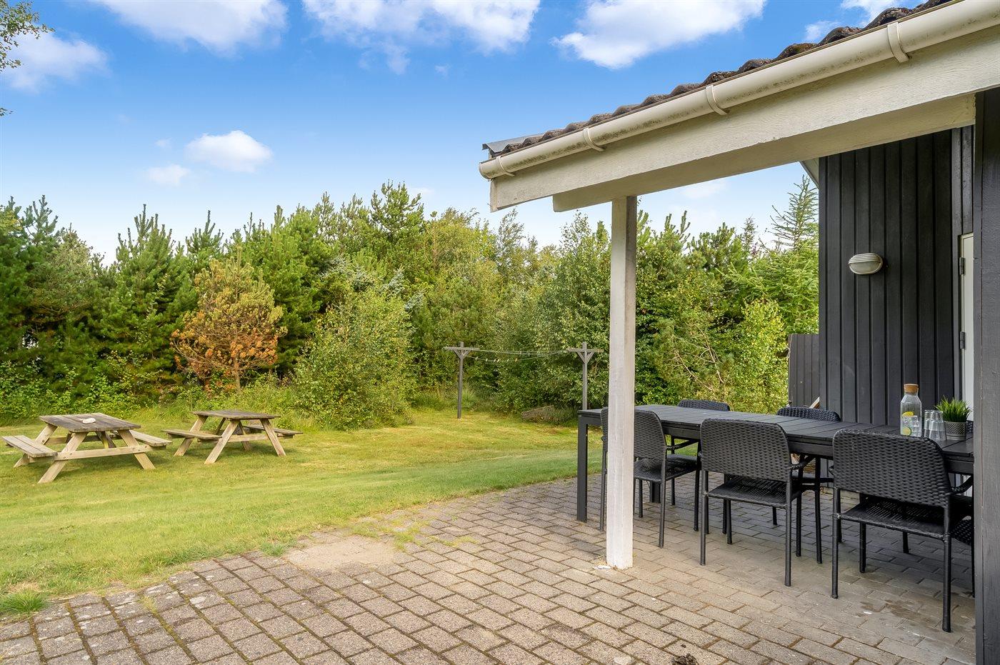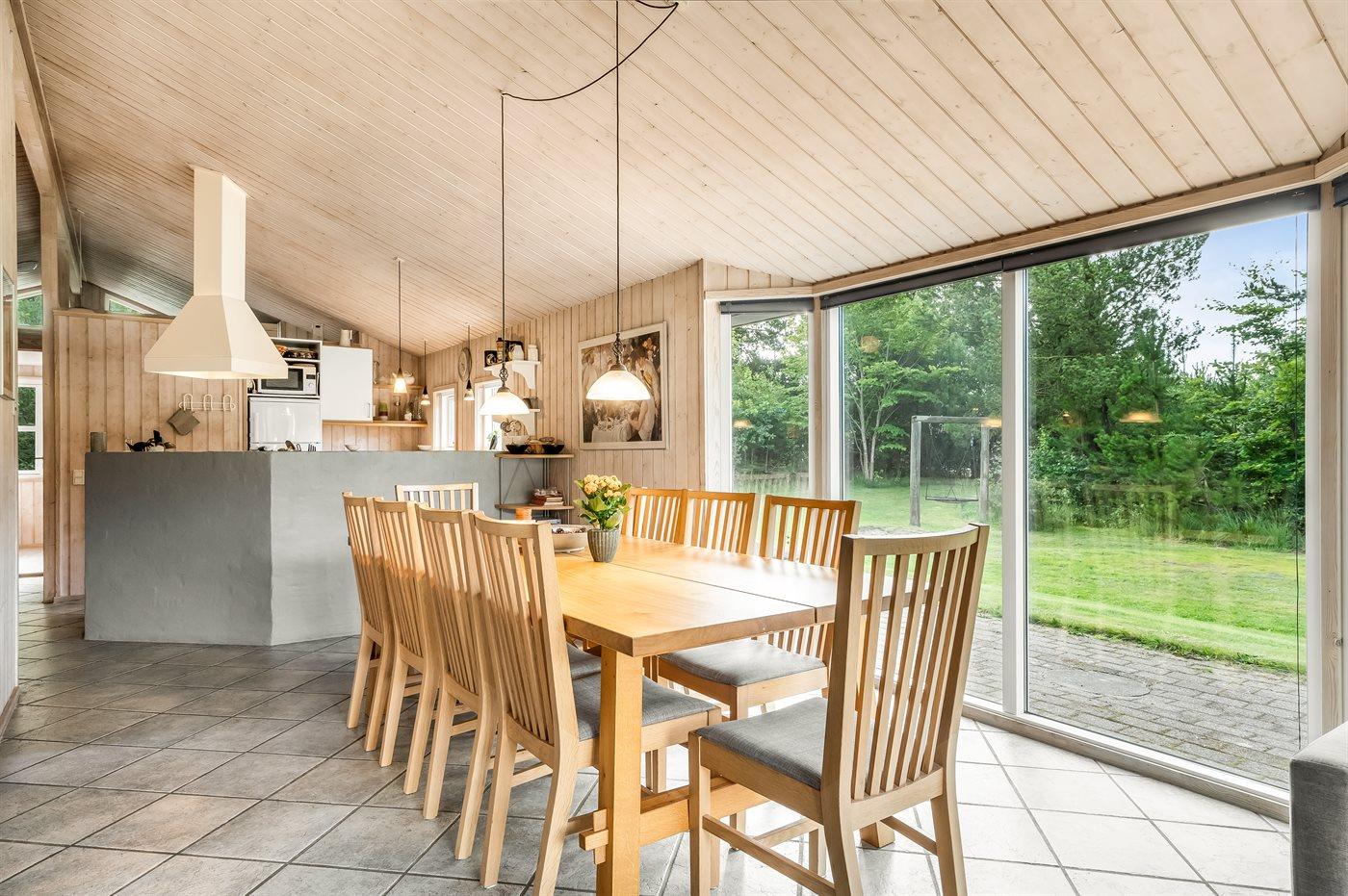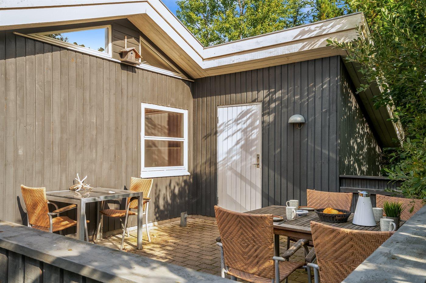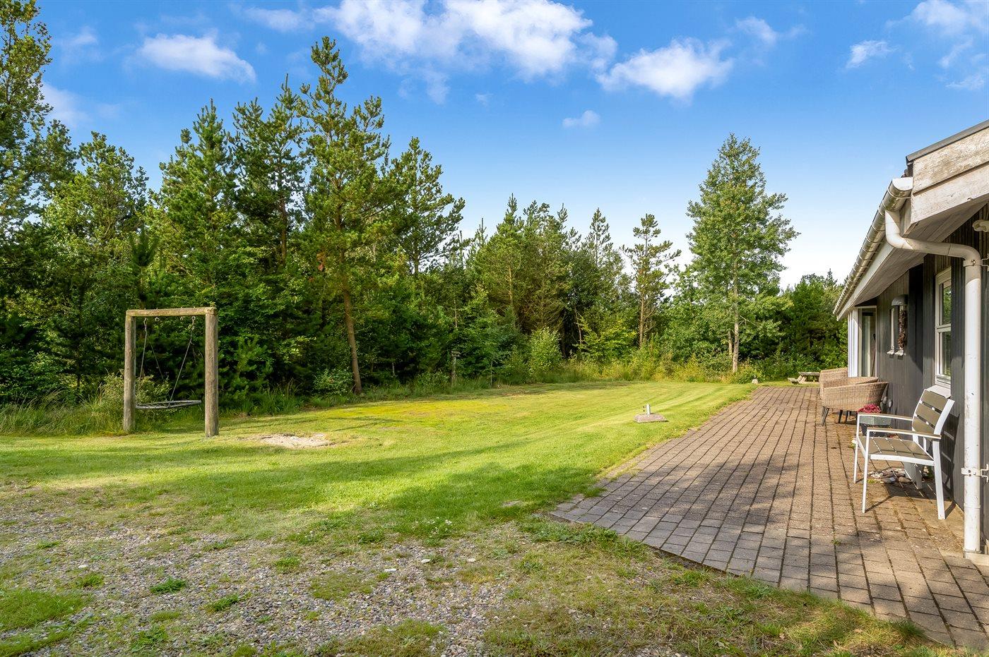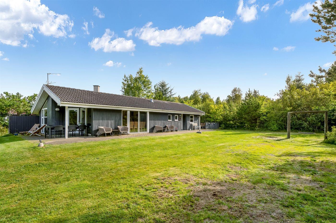 Et stort og flot sommerhus beliggende på en skov-/naturgrund i rolige og ugenerte omgivelser. Til huset hører såvel åbent som overdækket terrasseareal med havemøbler – hvor man kan nyde timer i det fri med en god bog eller en kryds og tværs. Der findes et redskabsrum til opbevaring af cykler o.l.