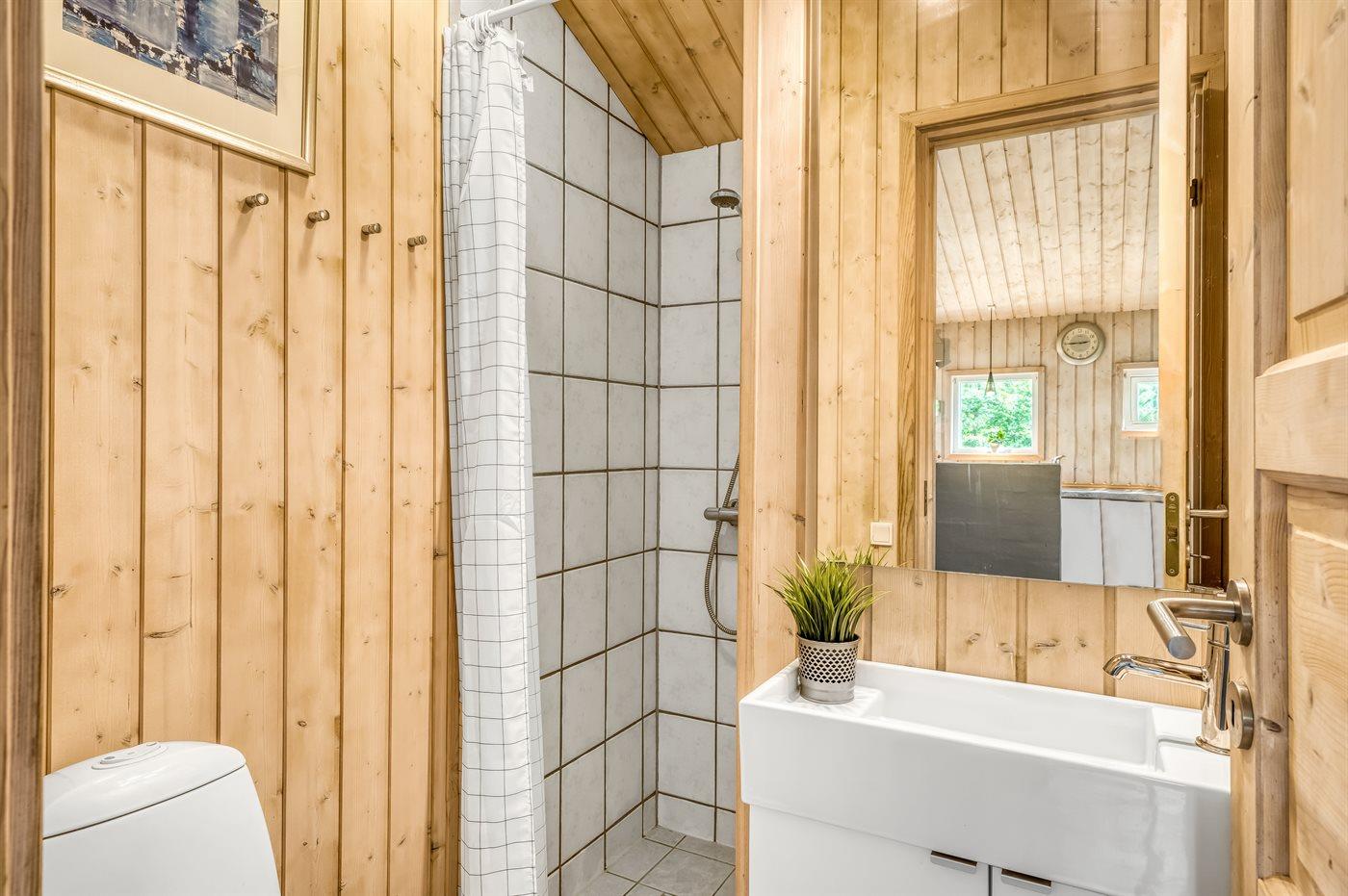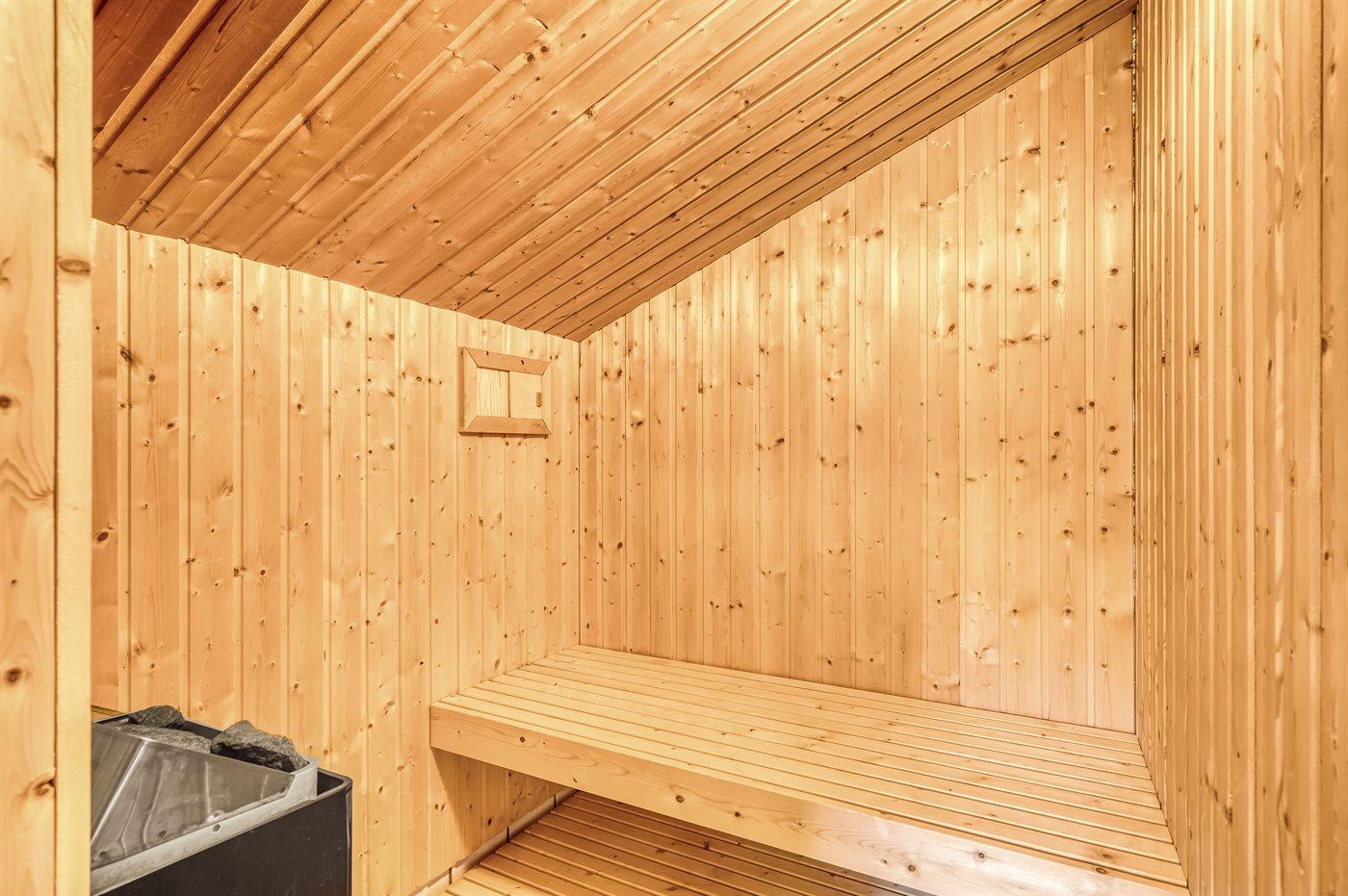Der er 2 badeværelser med bruseniche og 2 toiletter. Der er gulvvarme på 2 badeværelser. I saunaen er der mulighed for afslapning.