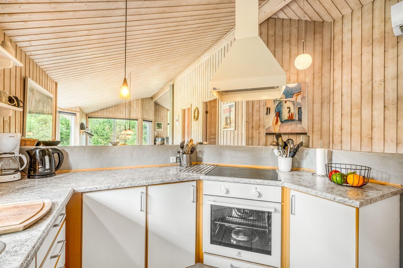 Køkkenet er udstyret med 1 køleskab. Der er 4 keramiske kogeplader, varmluftovn, mikrobølgeovn samt opvaskemaskine.