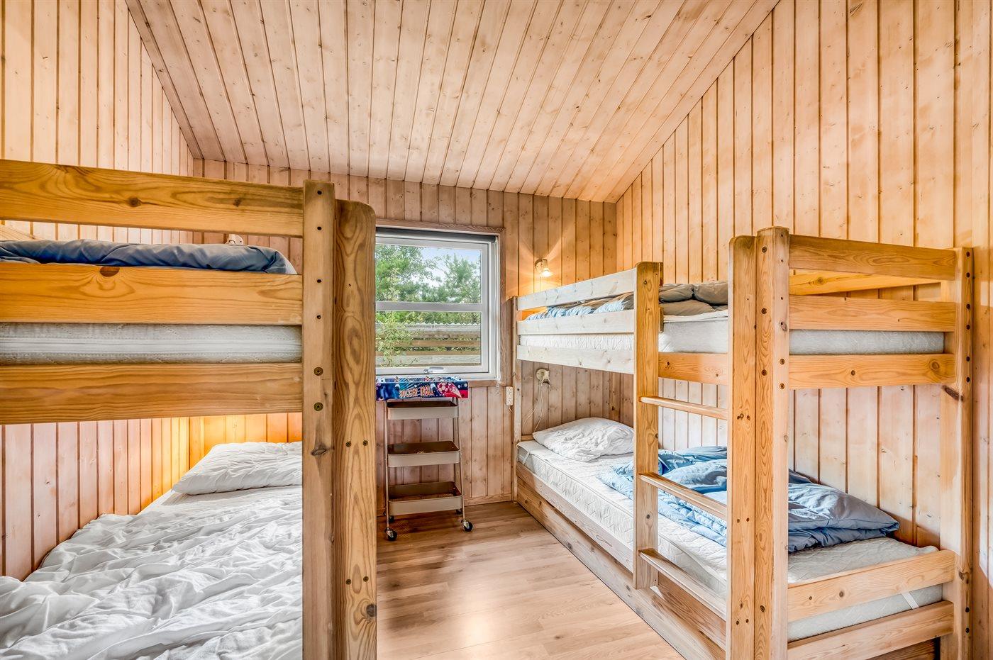 Der er i alt 4 soveværelser. Sovepladserne fordeler sig på: 4 sovepladser i dobbeltsenge. 2 sovepladser i enkeltsenge. 4 sovepladser i køjesenge. Derudover er der 1 stk. barneseng.