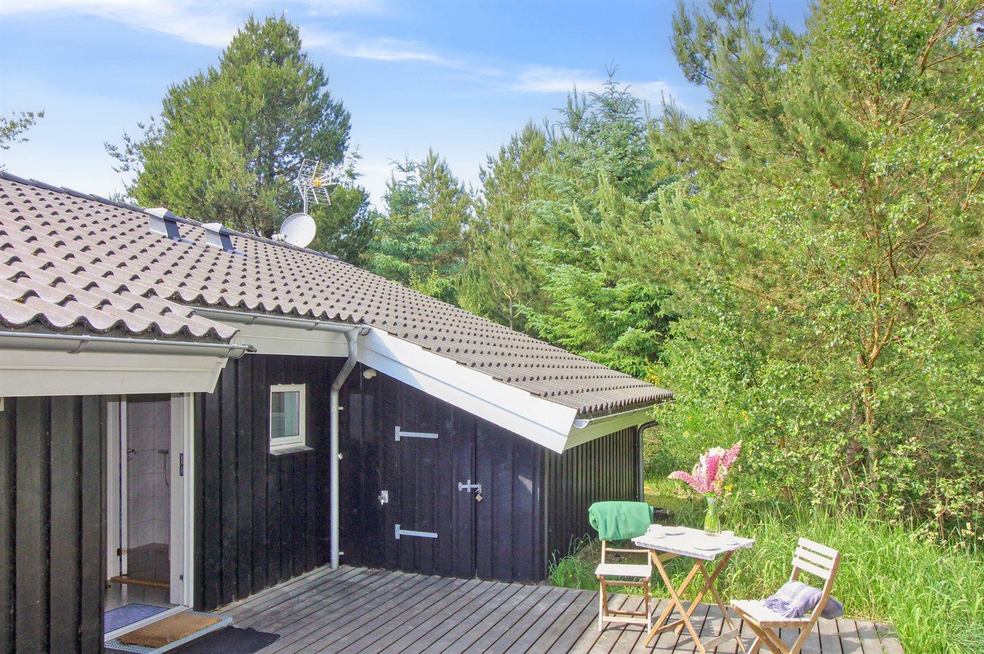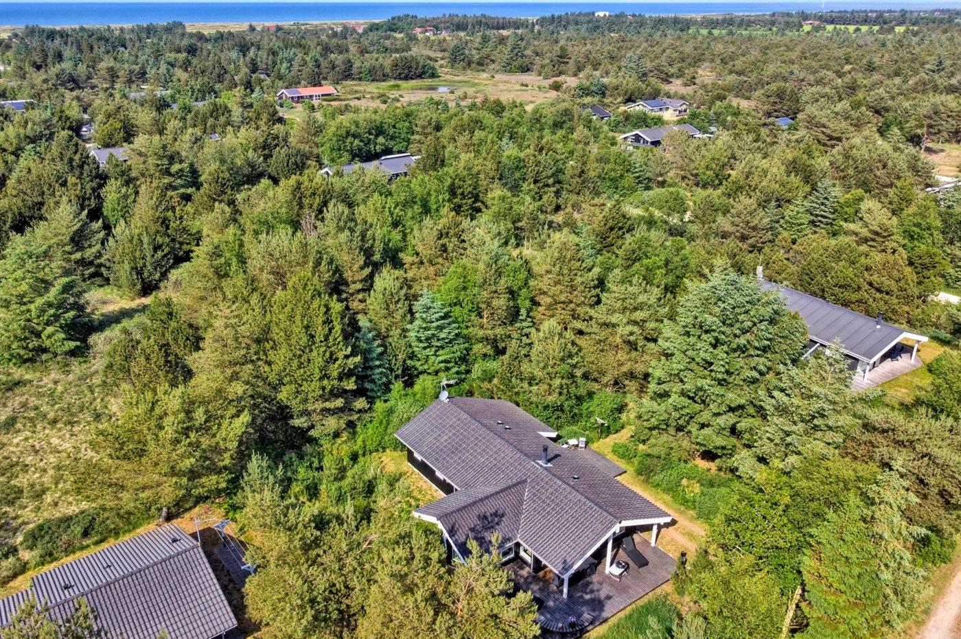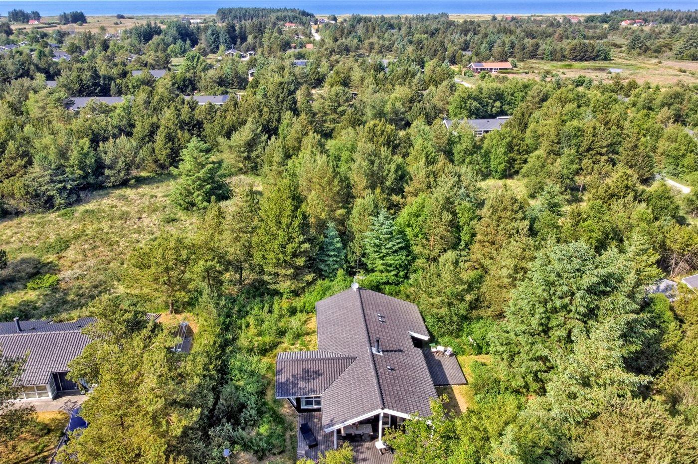 Ferieboligen er beliggende på en 1000 m² stor naturgrund. Der er 950 m til havet. Nærmeste forretning er beliggende i en afstand af 4000 m. Der er en golfbane i en afstand af 8000 m. Til ferieboligen hører 70 m² terrasseareal. Desuden er der 20 m² overdækket terrasse. Der er redskabsrum. Gynge. Sandkasse. Grill til rådighed. Parkering ved ferieboligen.
