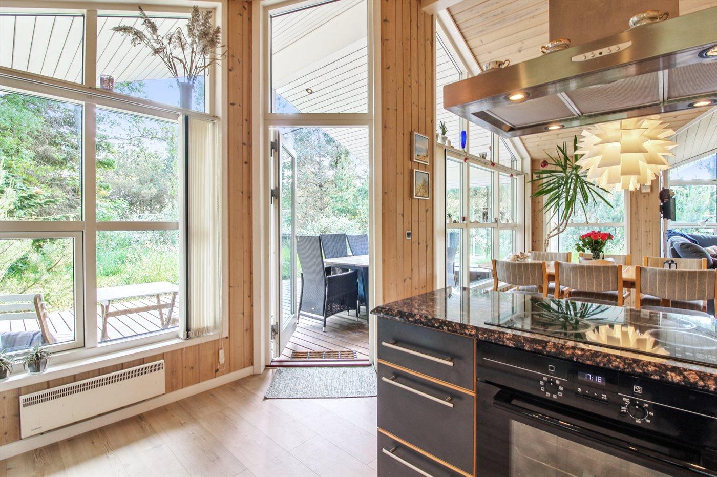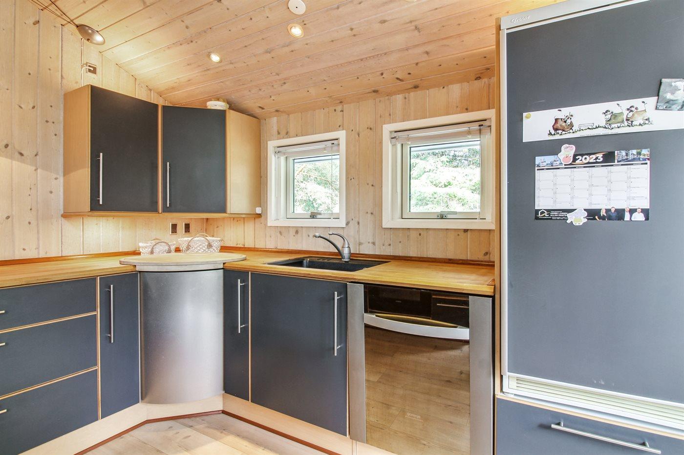 Køkkenet er udstyret med 1 køleskab. Der er 4 keramiske kogeplader, varmluftovn, mikrobølgeovn samt opvaskemaskine Der er gulvvarme i køkkenet.
