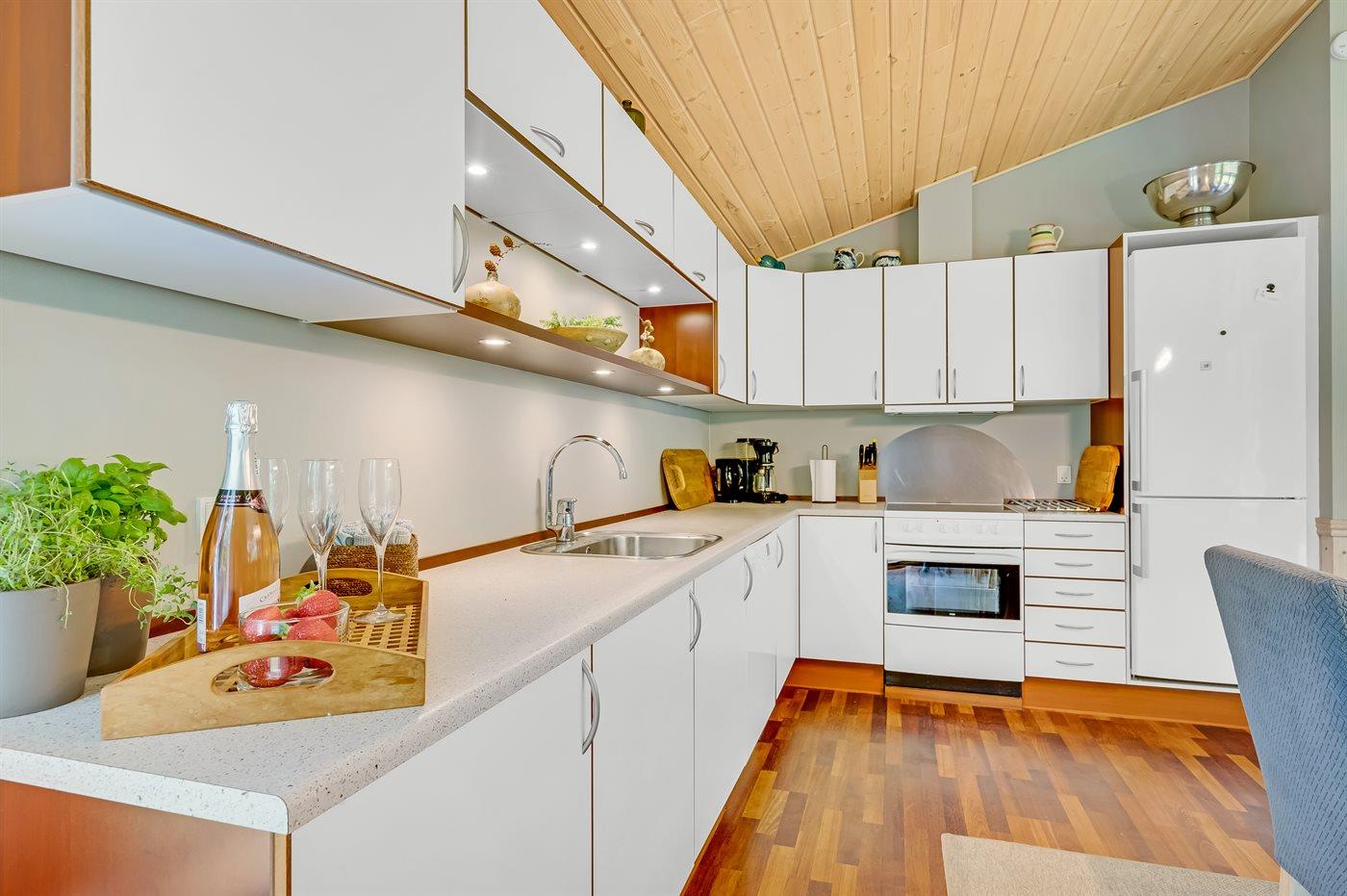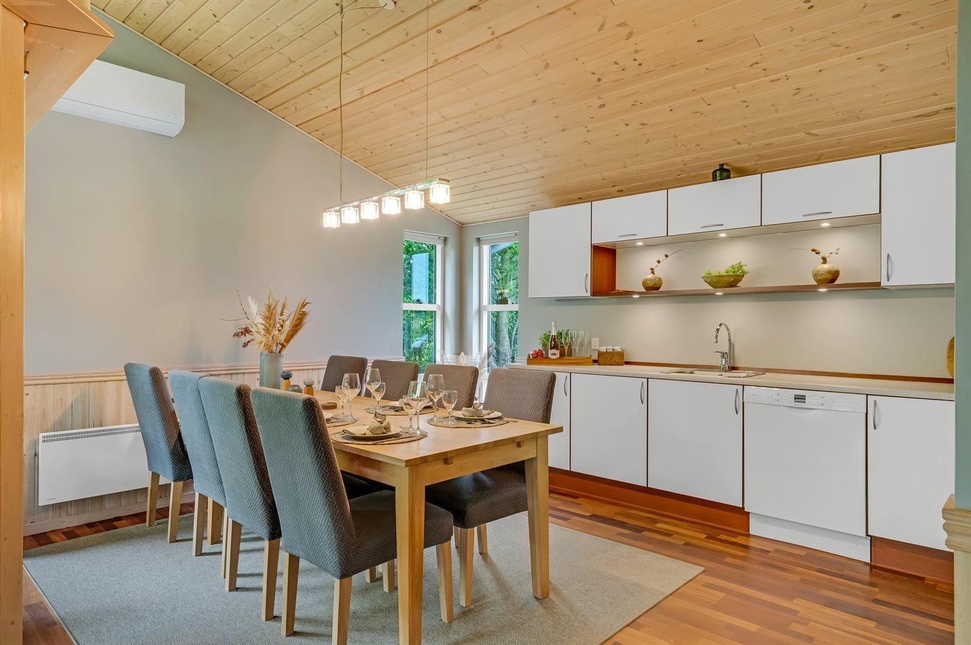 Køkkenet er udstyret med 1 køleskab, varmluftovn, mikrobølgeovn samt opvaskemaskine. Der findes desuden ekstra køleskab og stor fryser i redskabsrummet.