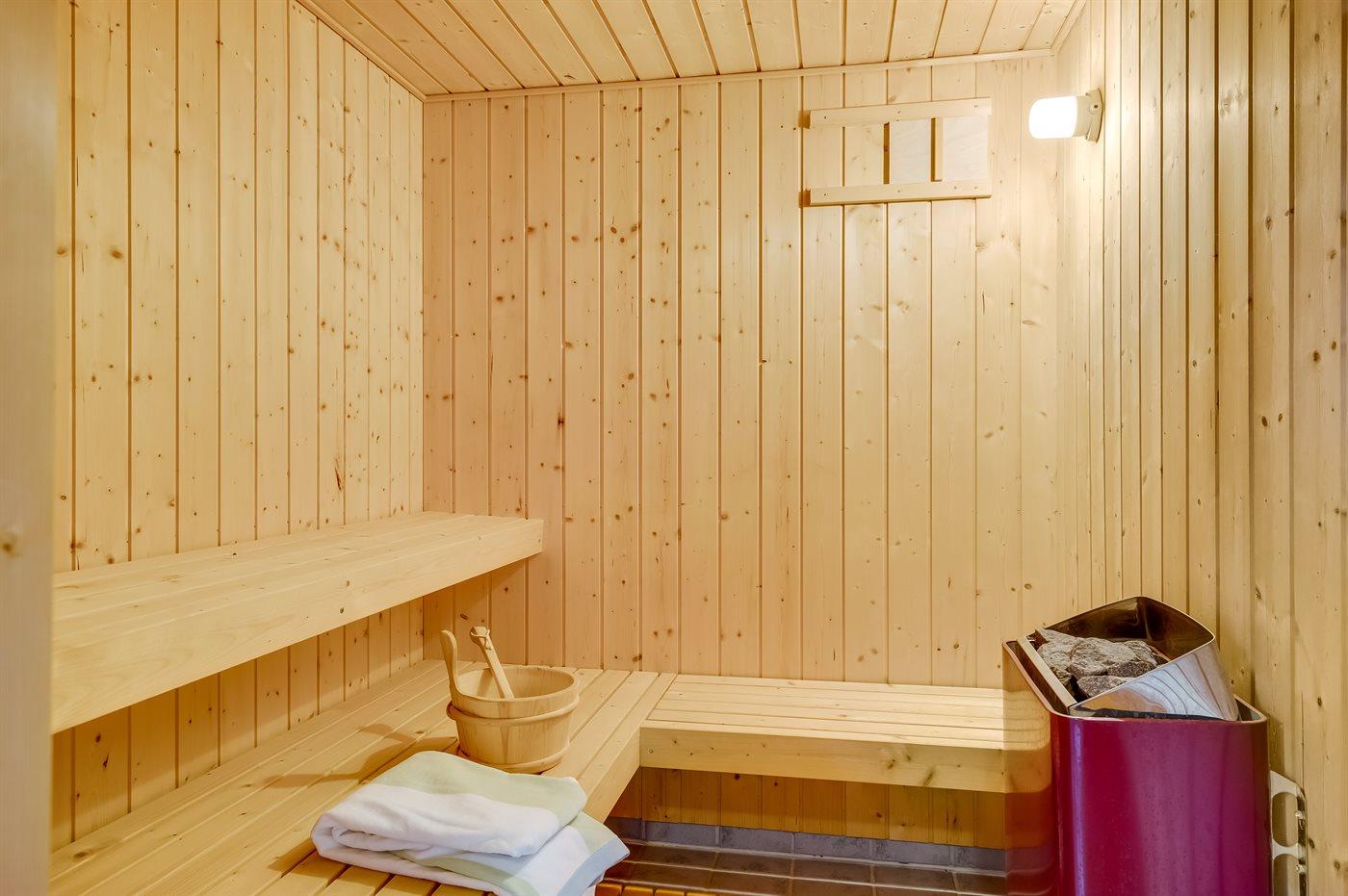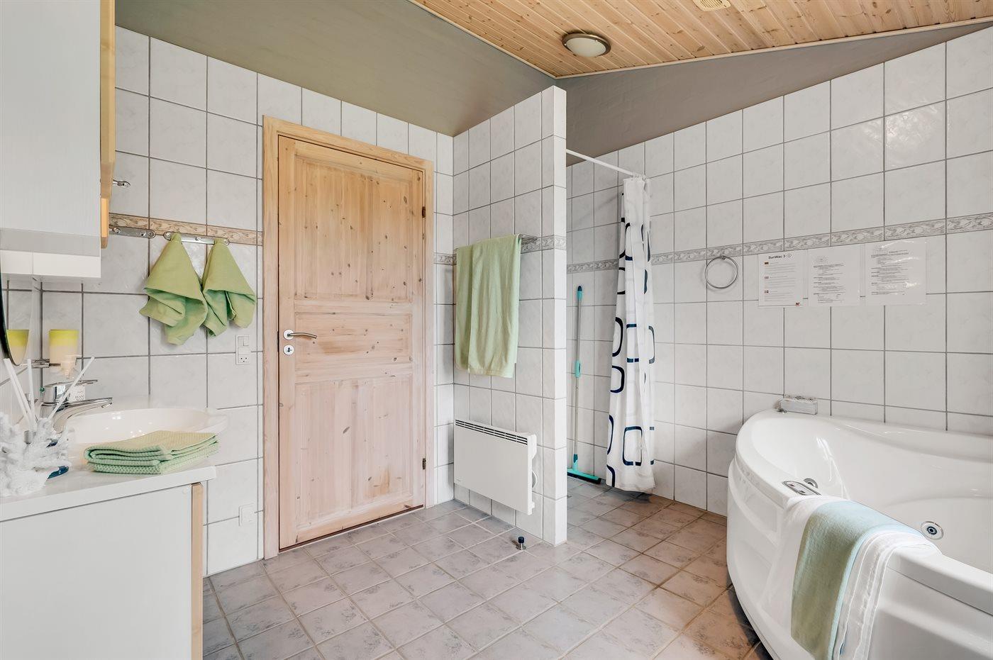 Der er 2 badeværelser med bruseniche og 2 toiletter. Der er gulvvarme på 2 badeværelser. I saunaen er der mulighed for afslapning.