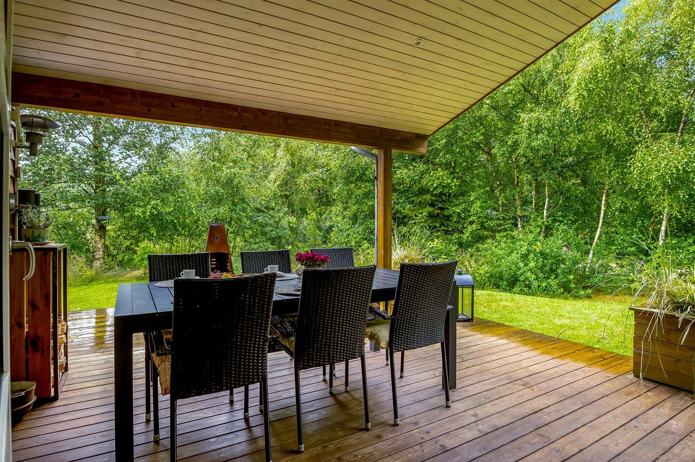 Dette sommerhus har plads til den store familie eller flere familier, der holder ferie sammen. Her kan der både hygges udendørs med grill på den delvist overdækkede terrasse eller indendørs med brændeovn og filmaften eller wellness i spa og sauna.