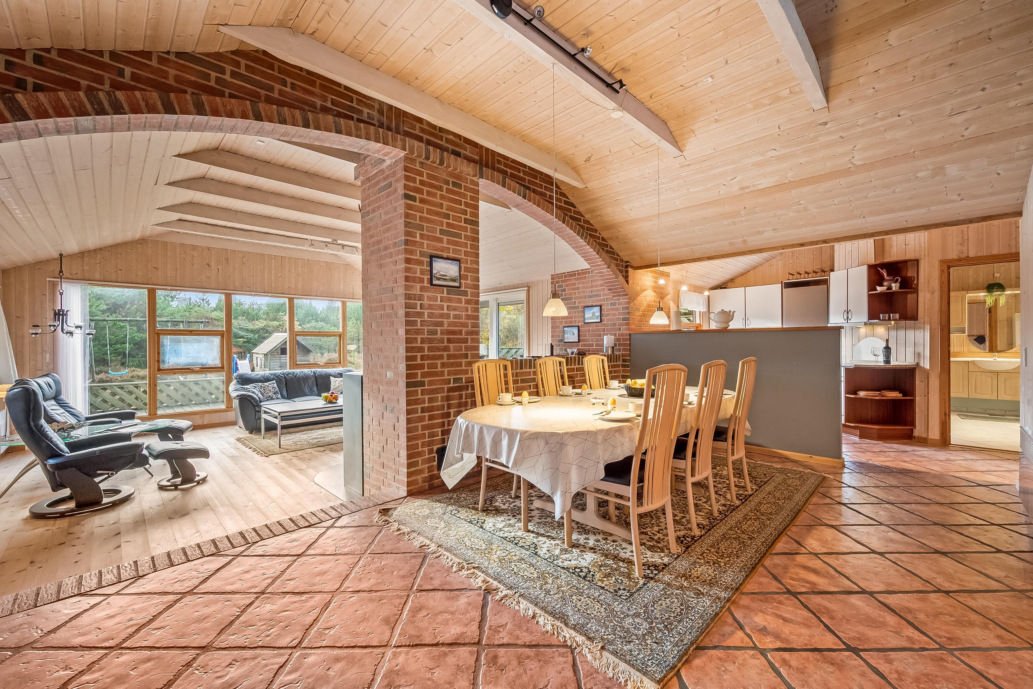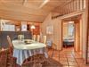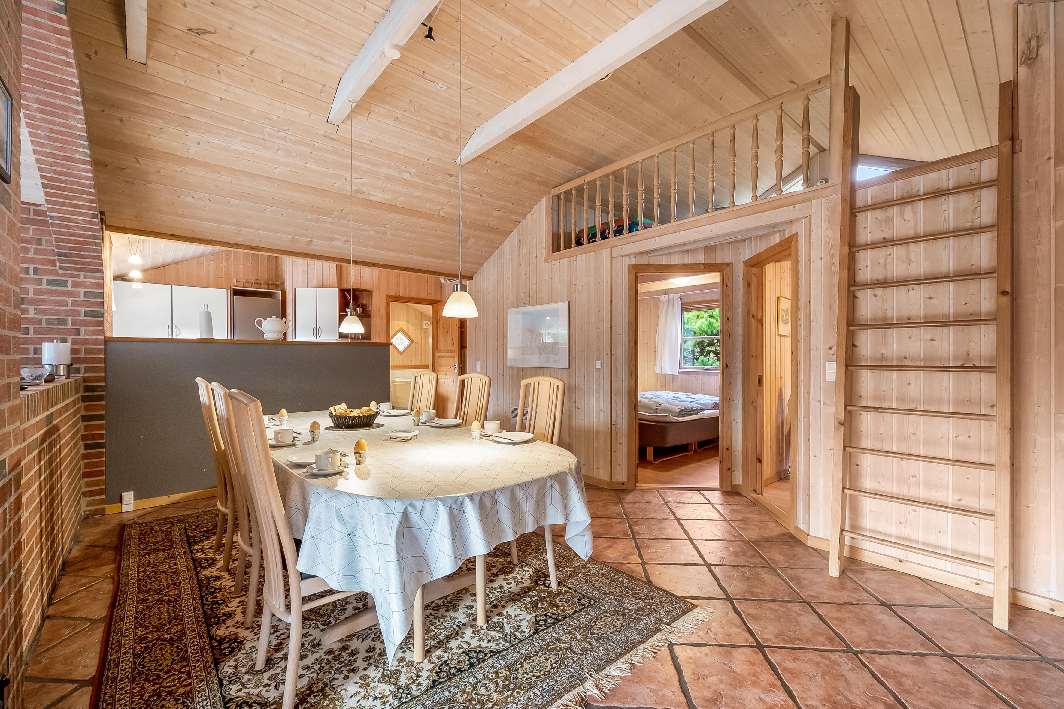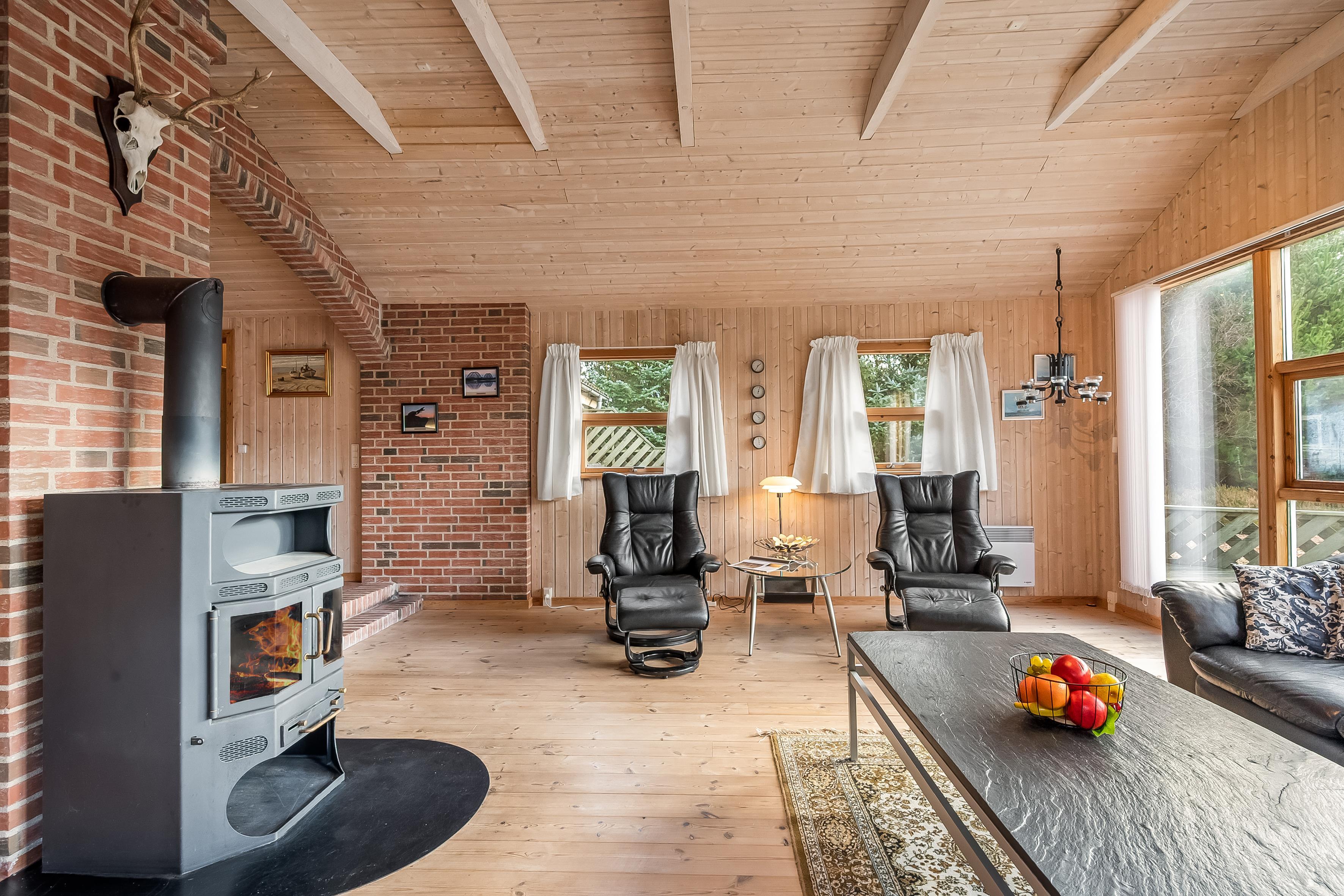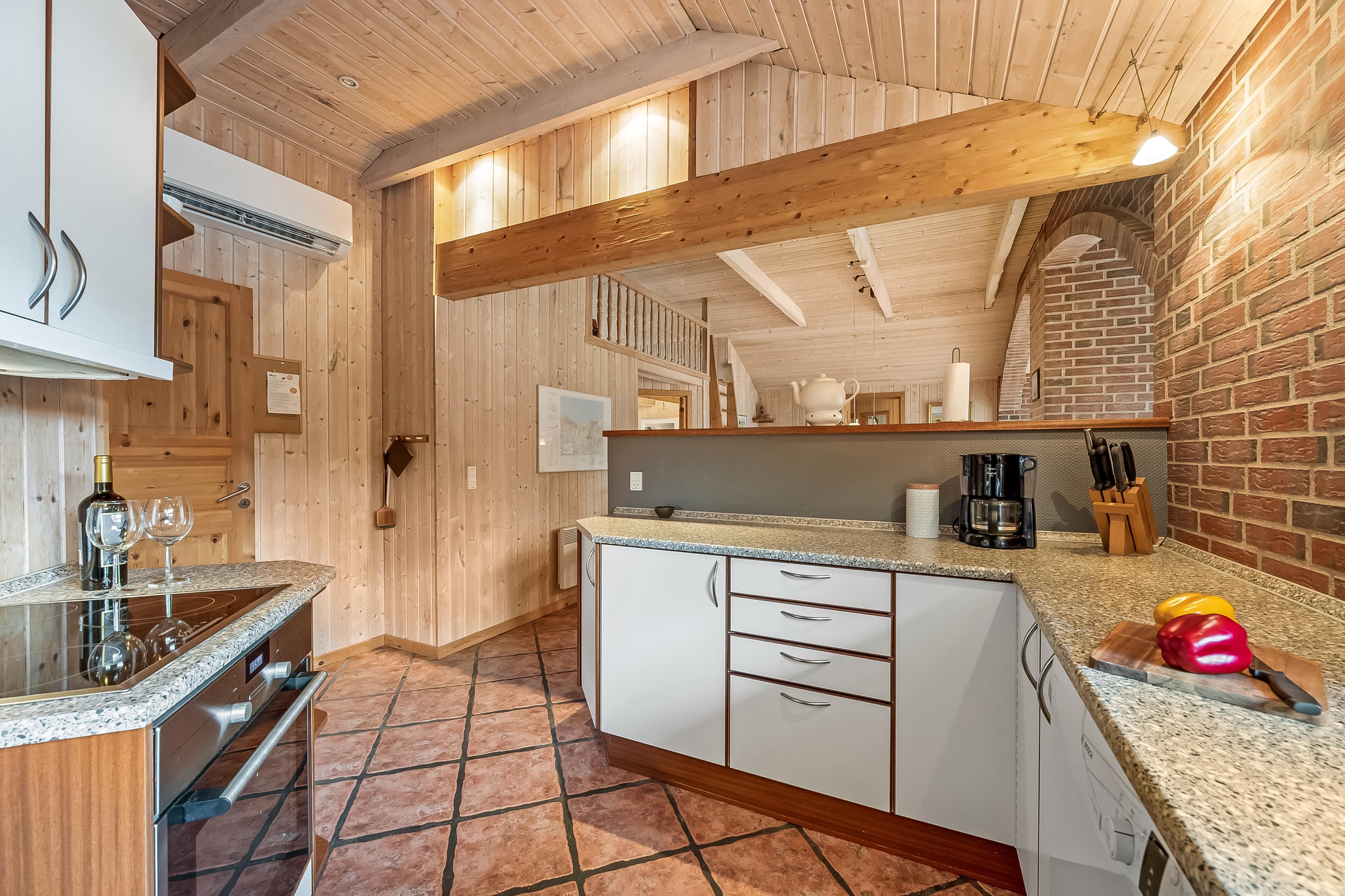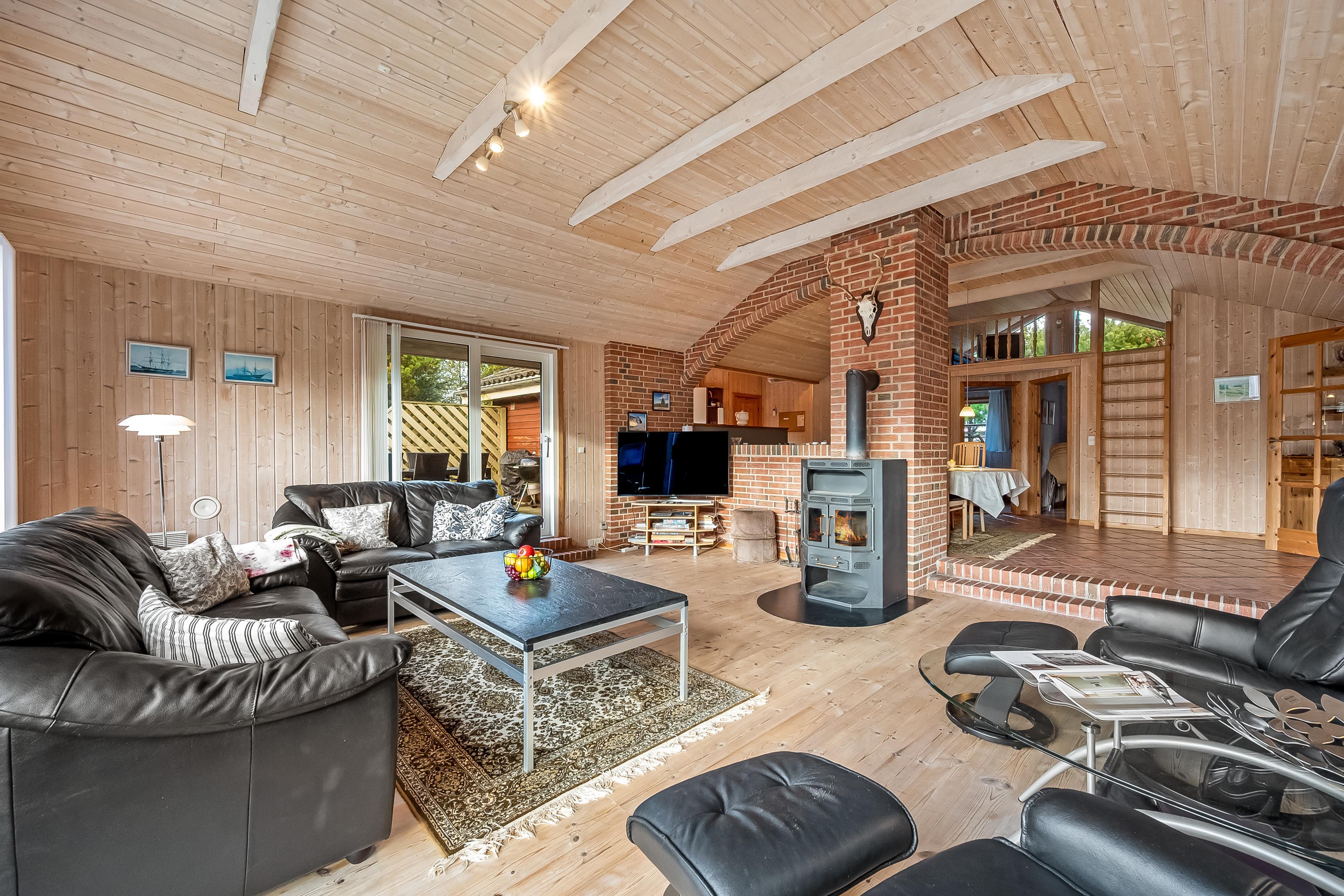 Det stilfulde køkken er integreret med spisestuen og udstyret med alt, hvad I behøver: opvaskemaskine, mikrobølgeovn, varmluftovn og et komfur med keramiske kogeplader. Opholdsstuen ligger i forskudt plan og er indrettet med et stort vinduesparti, der giver et smukt lysindfald. Her kan I nyde hyggelige aftener ved brændeovnen eller se TV via parabol til tyske kanaler. Fra stuen er der direkte udgang til en afskærmet terrasse med komfortable havemøbler, hvor I kan slappe af og nyde naturen omkring jer.
