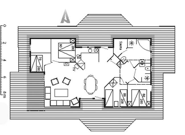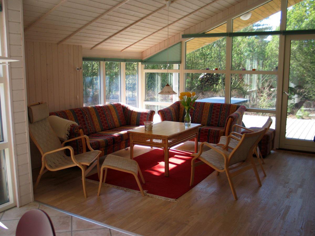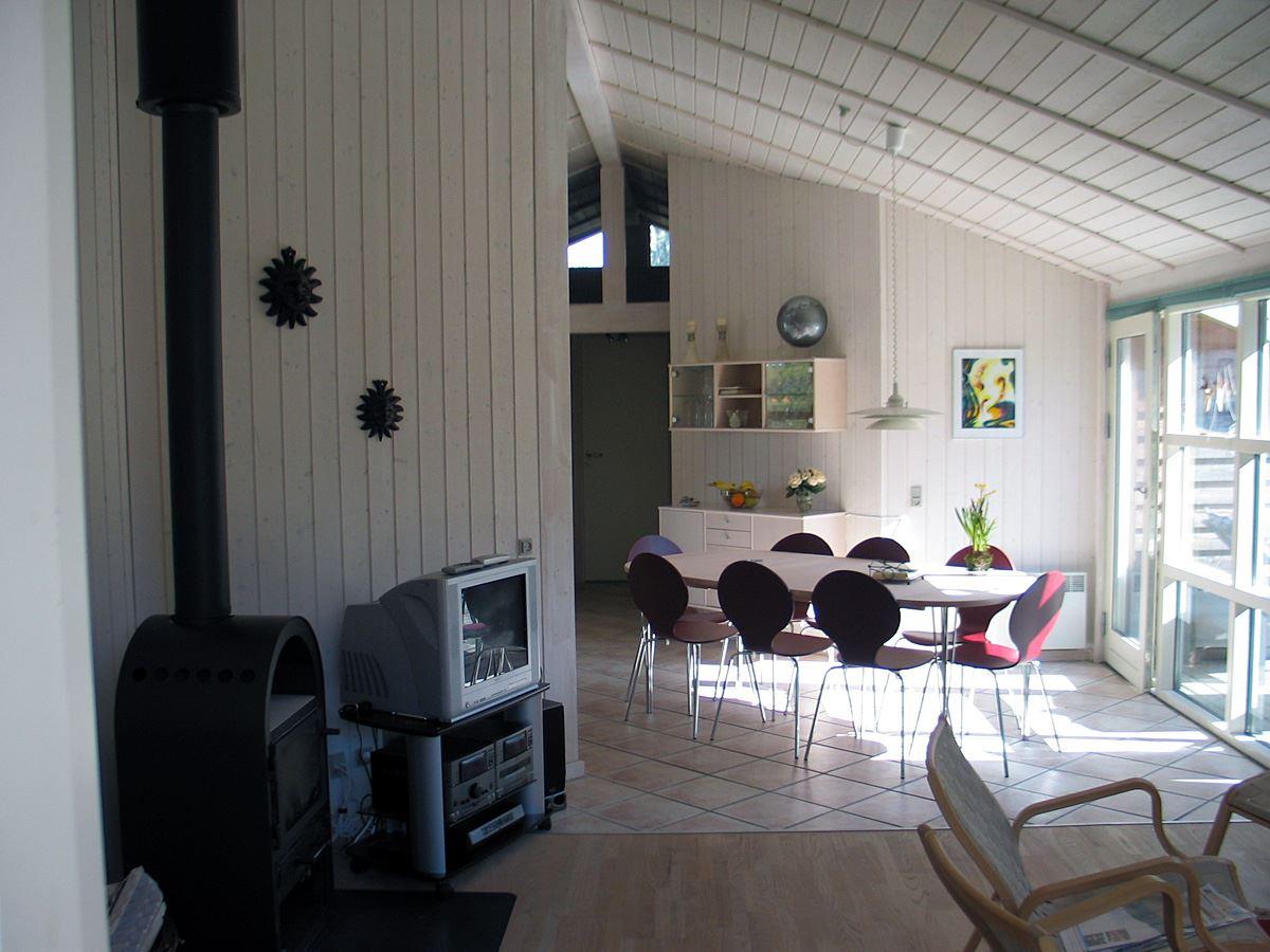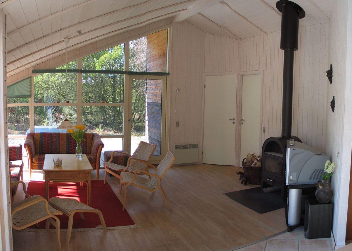 Huset har en dejlig lys indretning med lyst træbeklædning, store vinduespartier og loft som går op i kip. Huset har et stort fint køkken, som har alt hvad et køkken måtte have. Endvidere er her et rigtig flot spisebord, som har plads til at hele familien kan nyde sin mad sammen. I stueafdelingen er her nogle bløde farverige sofaer, hvorfra man kan nyde varm fra brændeovnen eller en hyggelig film i tv'et. Her er der også plads til at hele familien kan sidde ved sofabordet og spille et spil kort.