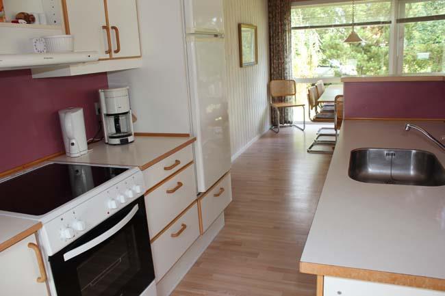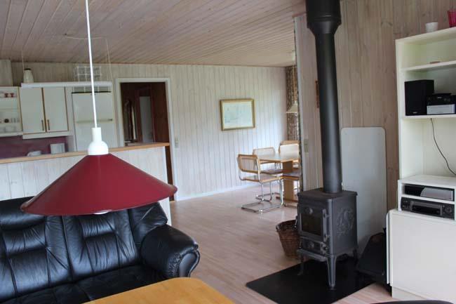 Køkkenet i dette hus er placeret i et stort køkken alrum, hvor der godt med plads til hele familien. Det er delt op i tre afdelinger: køkkenet som har alt der måtte være i et køkken, spisebordet, hvor der er plads til familien samt gæster, og til sidst afdelingen med de bløde møbler, hvor familien kan slappe af i den store hjørnesofa, med et spil kort på sofabordet, se tv eller bare nyde hinanden nærvær i brændeovnens skær. Dette rum har nogle store gode vinduer, som giver en masse lys ind i rummet.
