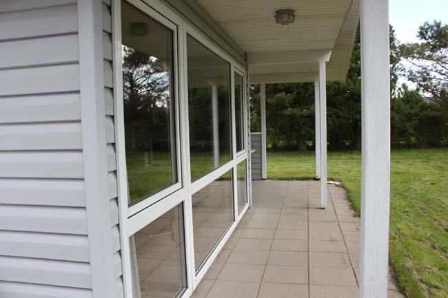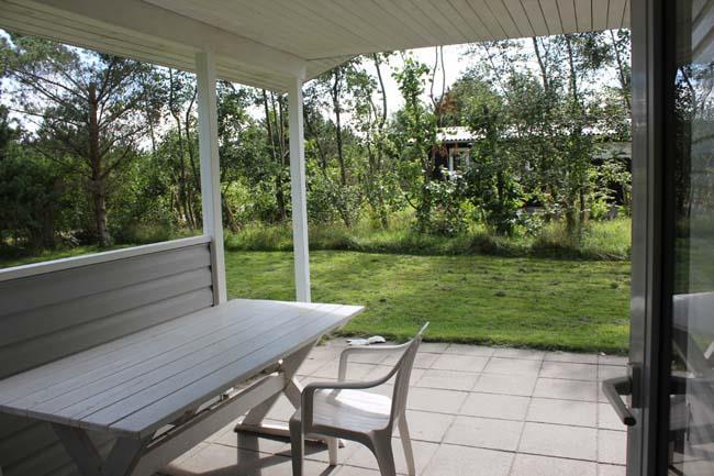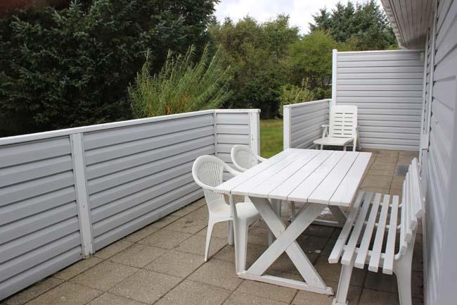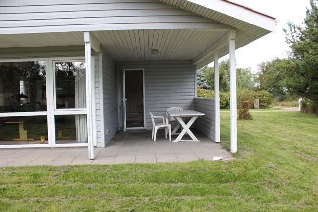 Huset har to terrasser, den ene ved fordøren, som er overdækket, og den anden store terrasse, som er på tre sider af huset, hvilket betyder at familien kan nyde solen hele dagen. Her er cirka halvdelen af terrassen overdækket.