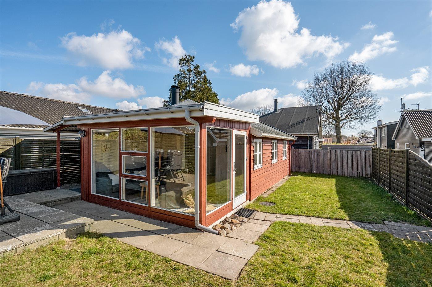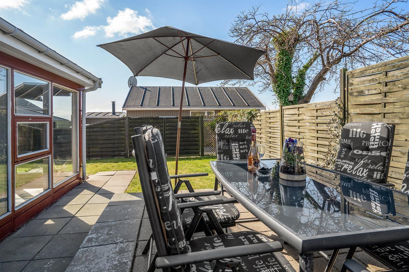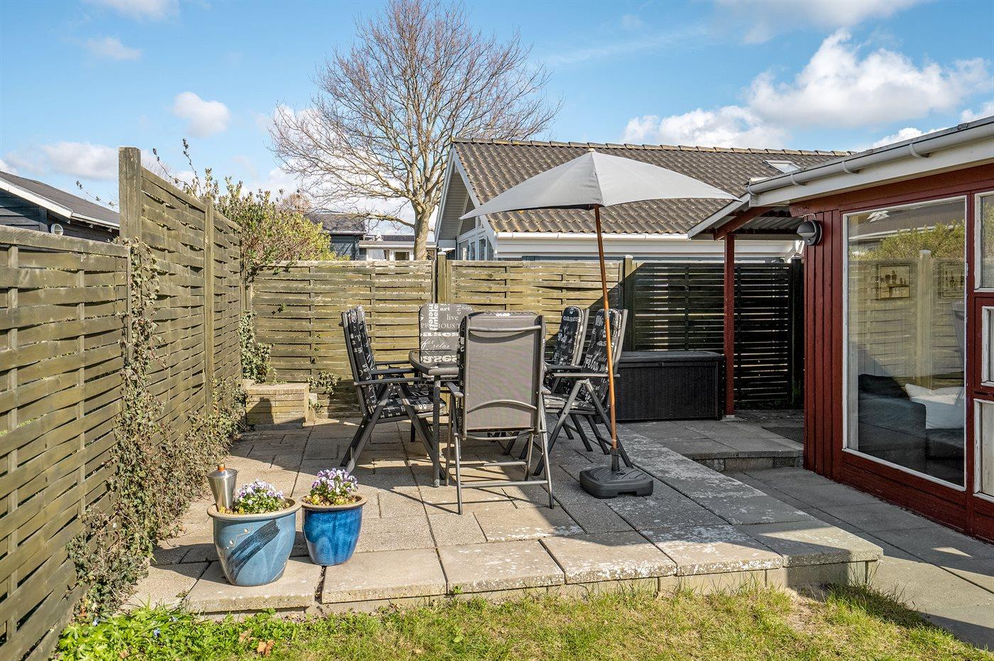 På den 149 m² fuldt indhegnede havegrund findes et 20 m² åbent terrasseareal med gasgrill. Der er kun 50 m til en fælles parkeringsplads.
