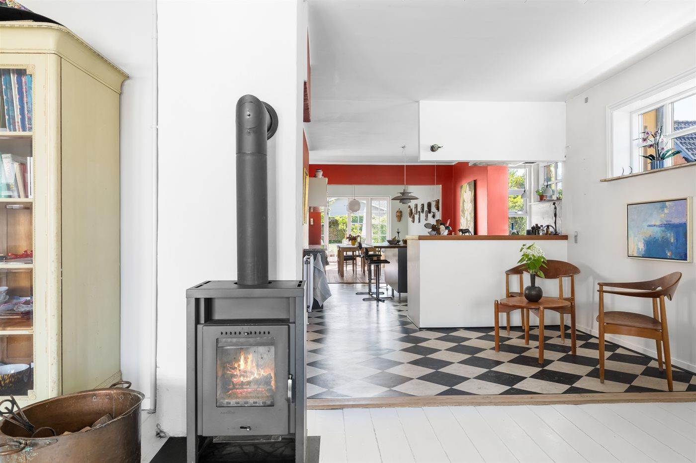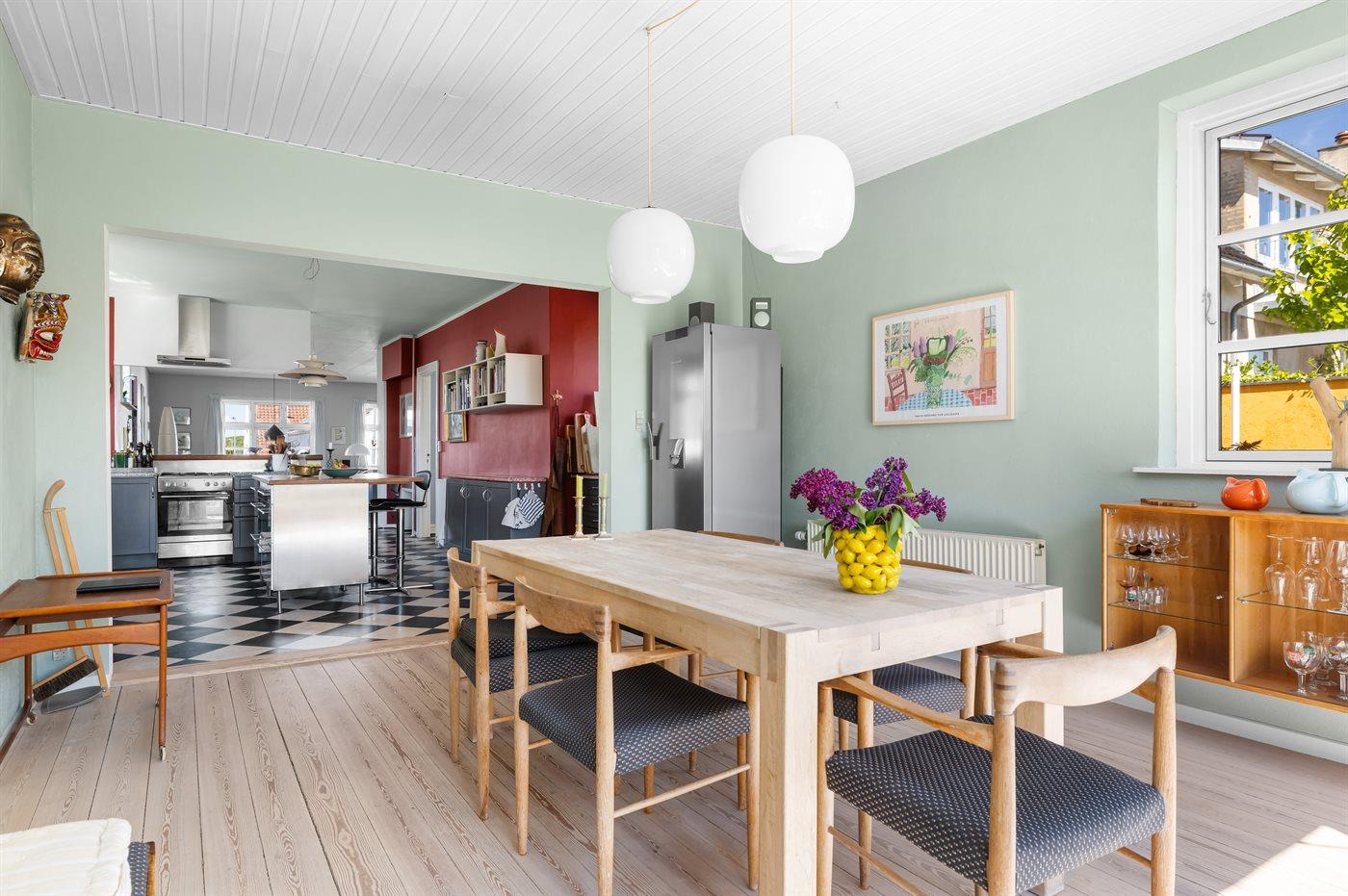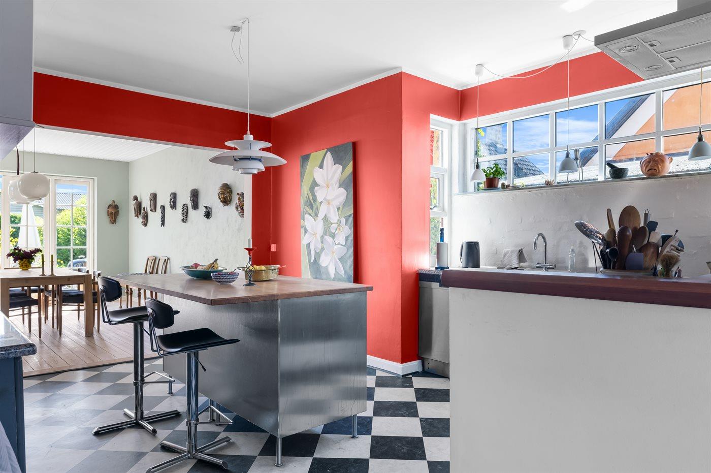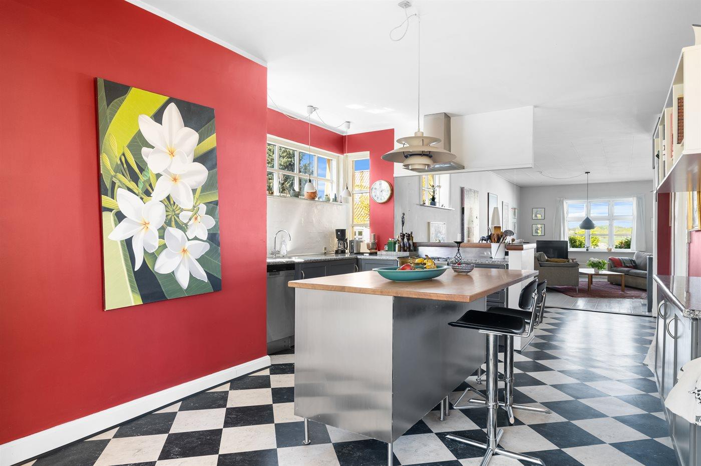 Køkkenet er udstyret med 1 køleskab. Der er 4 gasblus, varmluftovn samt opvaskemaskine.