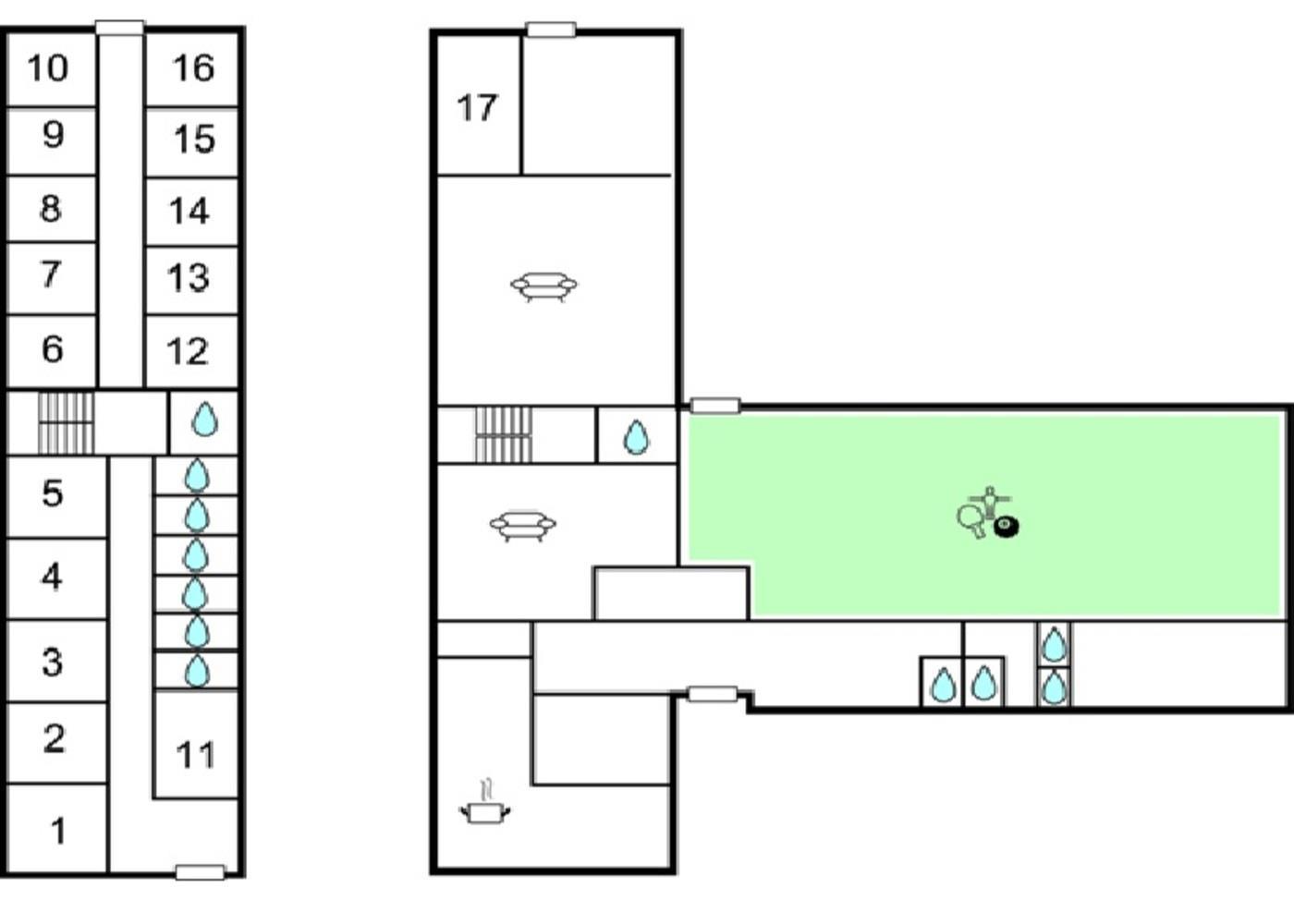 17 Soveværelser: (1DS)+(2S)+(2S)+(2S)+(2S)+(2S)+(2S)+(2S)+(2S)+(2S)+(2S)+(2S)+(2S)+(2S)+(2S)+(2S)+(2S)