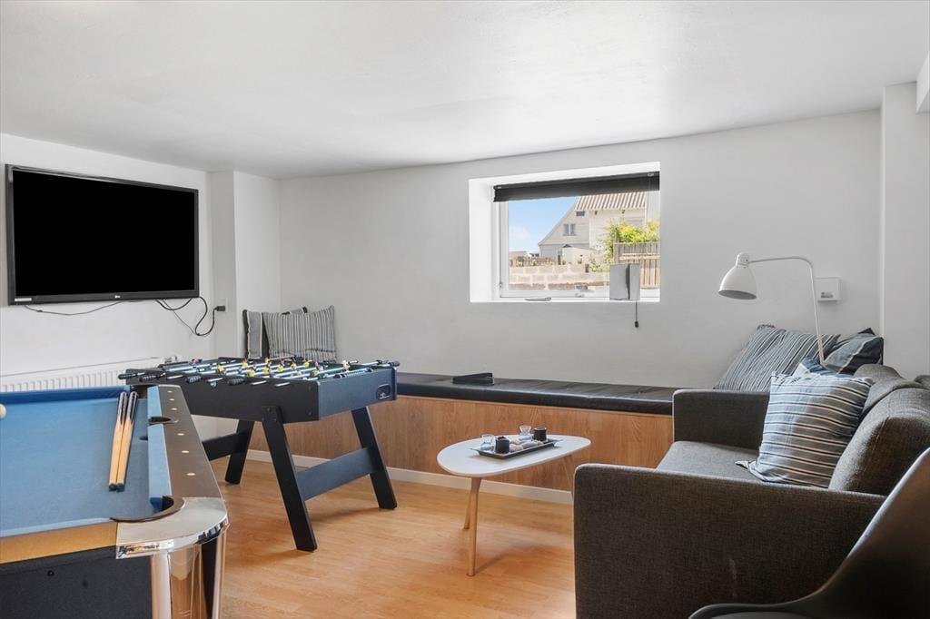 Det første, der møder dig, når du træder ind i sommerhuset, er den lyse og indbydende atmosfære. Huset er indrettet med sans for både æstetik og funktionalitet, og du mærker straks, at her er det nemt at føle sig hjemme. I stueplan finder du et dejligt køkken i åben forbindelse med opholdsstuen, hvor familien kan samles til madlavning, spil og hyggelige samtaler. Går turen op ad trappen til førstesalen, åbner der sig endnu flere muligheder – blandt andet et aktivitetsrum med både bordfodbold og poolbord, som med garanti vil vække begejstring hos både børn og voksne. Indretningen har en rolig og harmonisk stil, og her er god plads til, at alle kan finde hver sin krog – eller samles til fælles feriehygge.