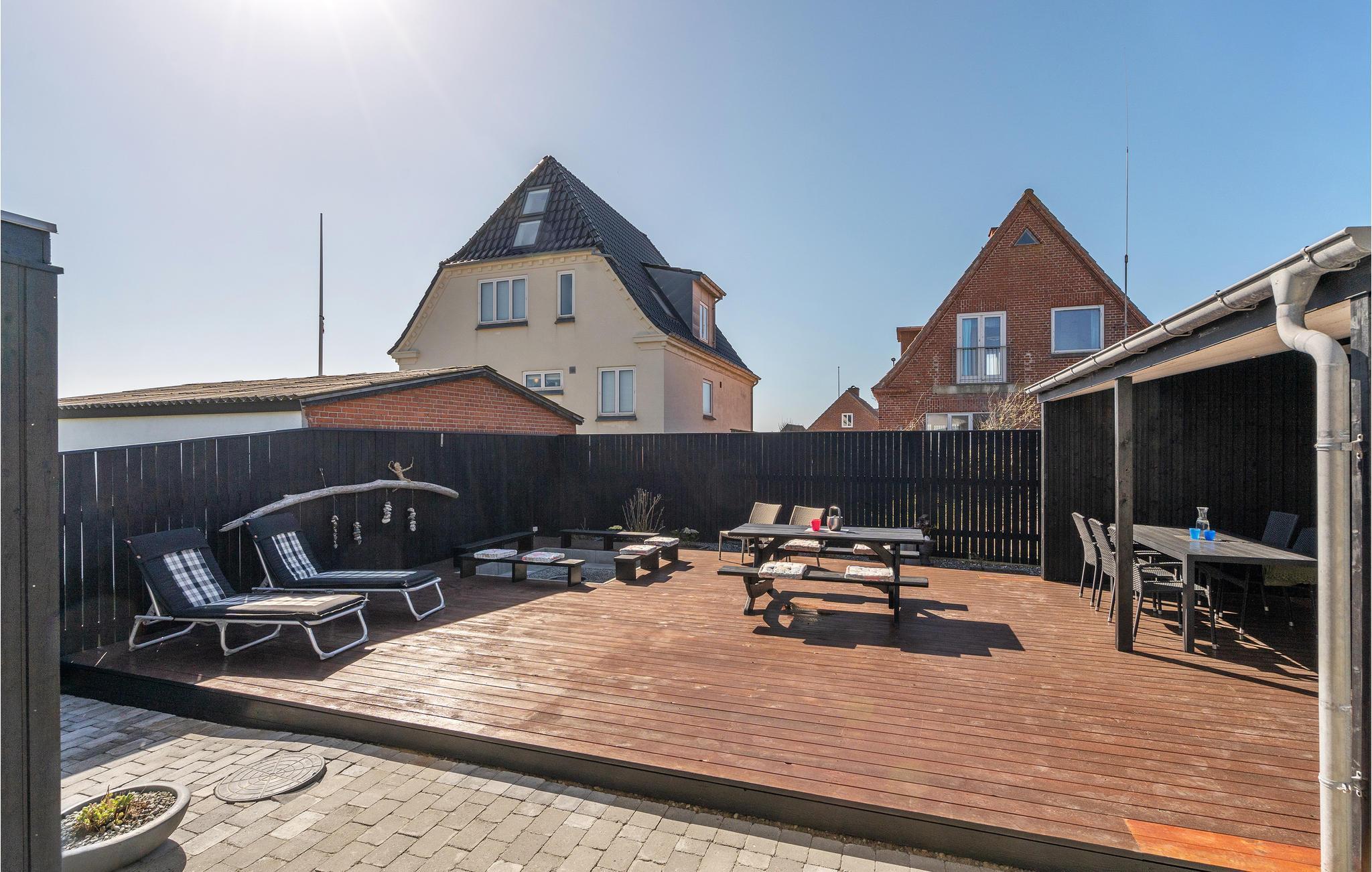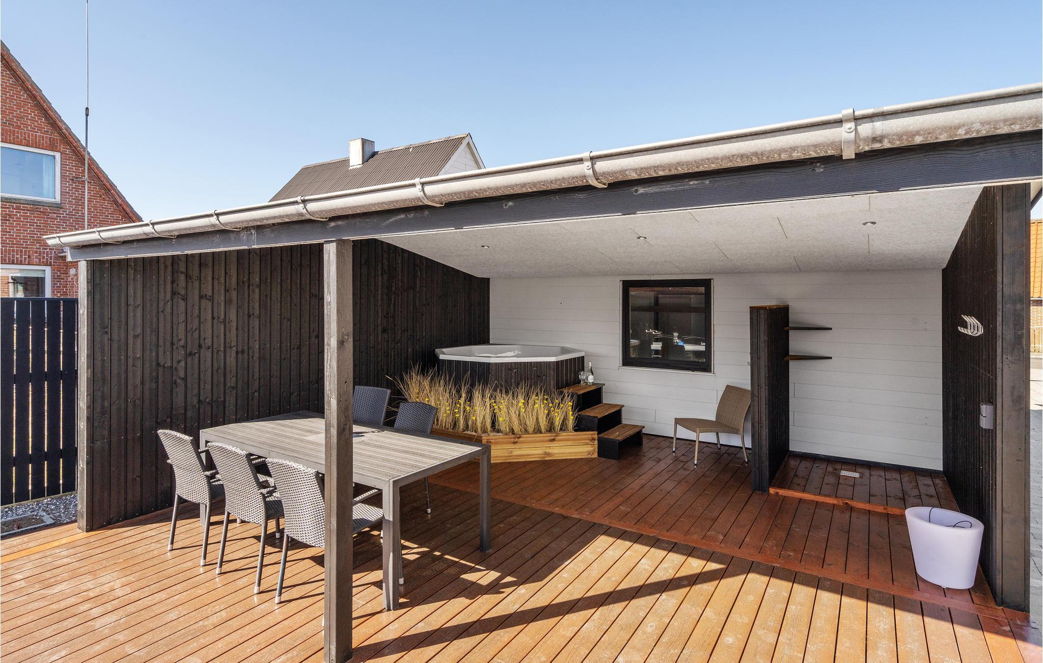 På den store træterrasse står havemøbler og grill til jeres rådighed, så I let kan samle familie eller venner til hyggelige grillmiddage. I kan også se frem til mange gode timer i det udendørs standvandsspa. Slap af og slik sol på liggestolene, mens I læser en god bog og lader ungerne lege i den indhegnede have, hvor I også finder en udendørsbruser til at skylle strandsandet af.