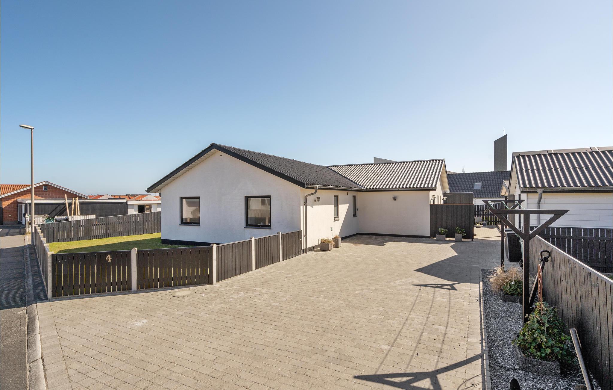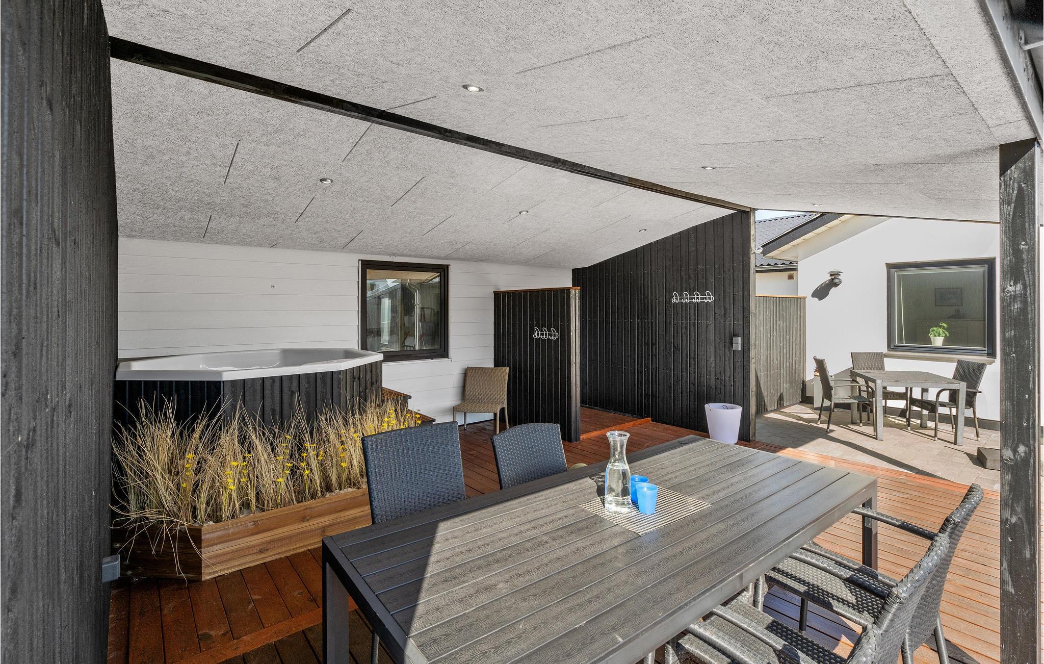 Moderne feriehus nær Vesterhavets strand med spa, terrasse og indhegnet have til afslapning og aktiviteter.
