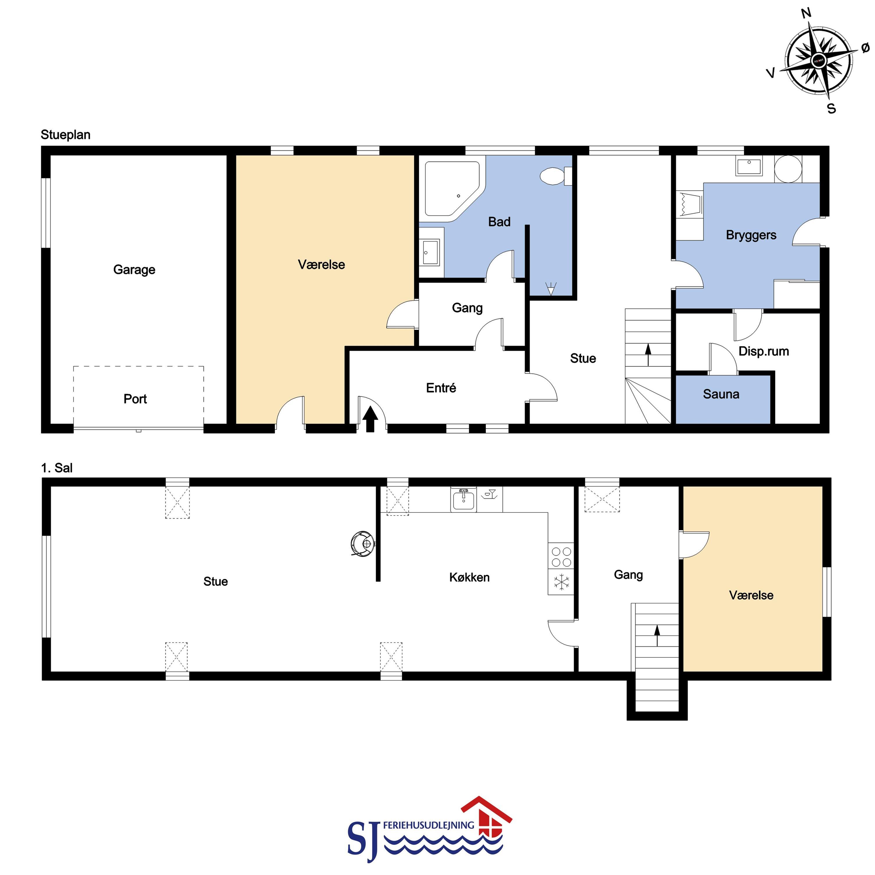 Indretningen af huset inkluderer et praktisk bryggers med vaskemaskine, tørretumbler og ekstra aflæggeplads samt en ekstra håndvask. Der er også en dejlig sauna i et separat rum fra bryggerset. Fra gangen har I adgang til et stort soveværelse med en dobbeltseng, en enkeltseng og en barneseng. Ved siden af dette soveværelse finder I et moderne badeværelse med toilet, håndvask, bruser og et 2-personers spabad med gulvvarme. Der er tilladt med ét husdyr, men rygning er ikke tilladt.