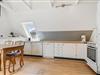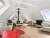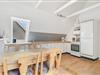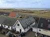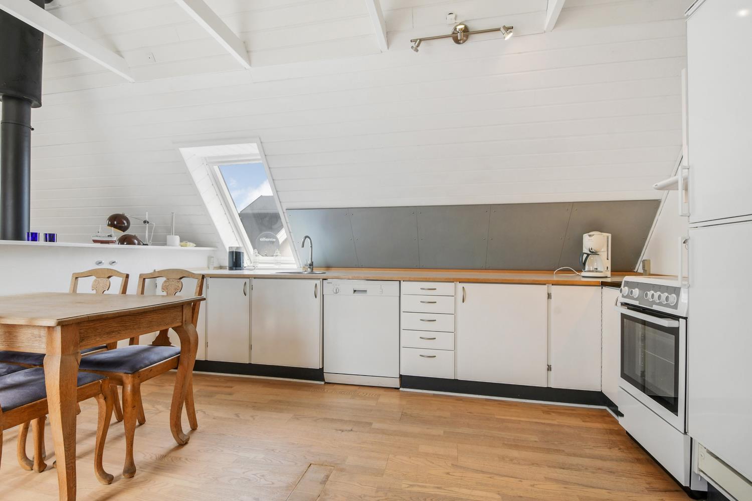På første sal, tilgået via trappen i mellemgangen, venter jer en lys og rummelig stue med åben planløsning. Her kan I nyde panoramaudsigten over klitlandskabet og kystsikringsvejen. Køkkenet er veludstyret med en glaskeramisk kogeplade, emhætte, mikrobølgeovn, køleskab med fryser og opvaskemaskine. I stuen er der et spisebord ved det store panoramavindue og en hyggelig sofagruppe med TV, der giver adgang til både danske og tyske TV-programmer. En brændeovn bidrager til den behagelige atmosfære. Derudover er der et ekstra soveværelse med dobbeltseng på første sal.