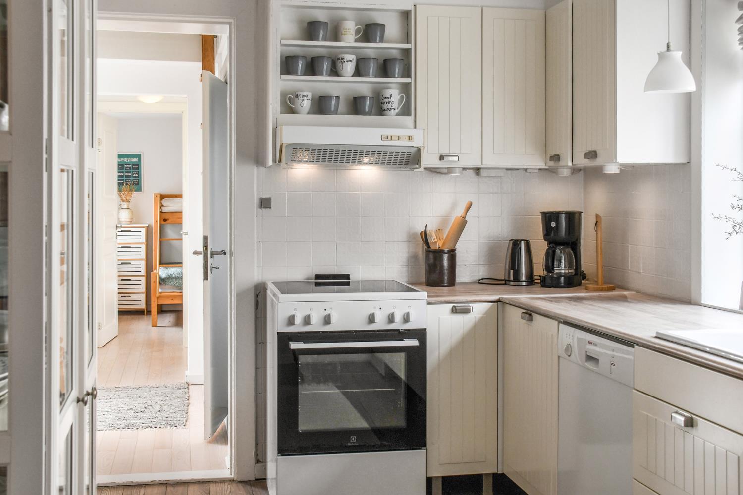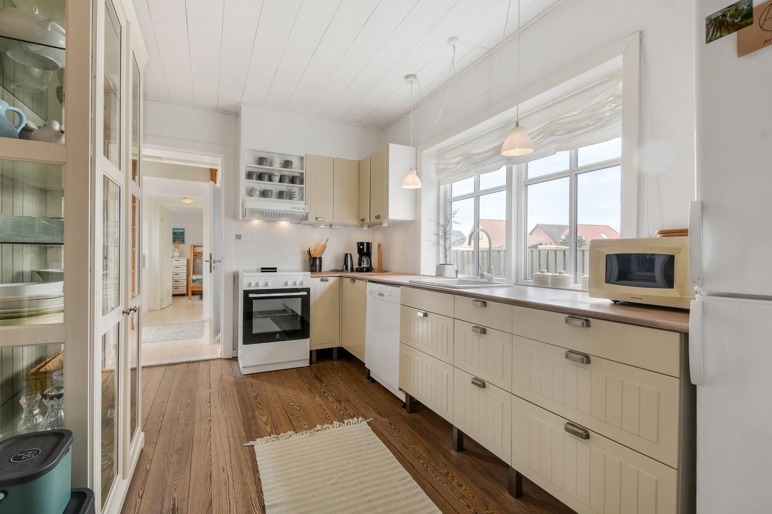 Dette 162 m2 store hus blev renoveret i 2013. 4 soveværelse (1DS, 1DS, 1DS, 1KS) fordelt på 2 plan. Entre med plads til overtøjet og trappe til første sal byder jer velkommen. Nyere køkken med opvaskemaskine, komfur med glaskeramiske kogeplader og køleskab med fryseboks. Hyggelig indrettet opholdsstue med siddehjørne, TV med danske og tyske programmer, apple-TV, DVD-afspiller, radio og CD-afspiller og spisebord. Mindre nyrenoveret badeværelse med toilet, håndvask, bruser og badekar. Ekstra badeværelse med toilet, håndvask, mini-vaskemaskine og bruser. Begge badeværelser har klinkegulv med gulvvarme. De 2 soveværelser med dobbeltseng er på 1. sal. Flotte rustikke trægulve i hele huset. Ikke rygerhus. 1 husdyr tilladt.