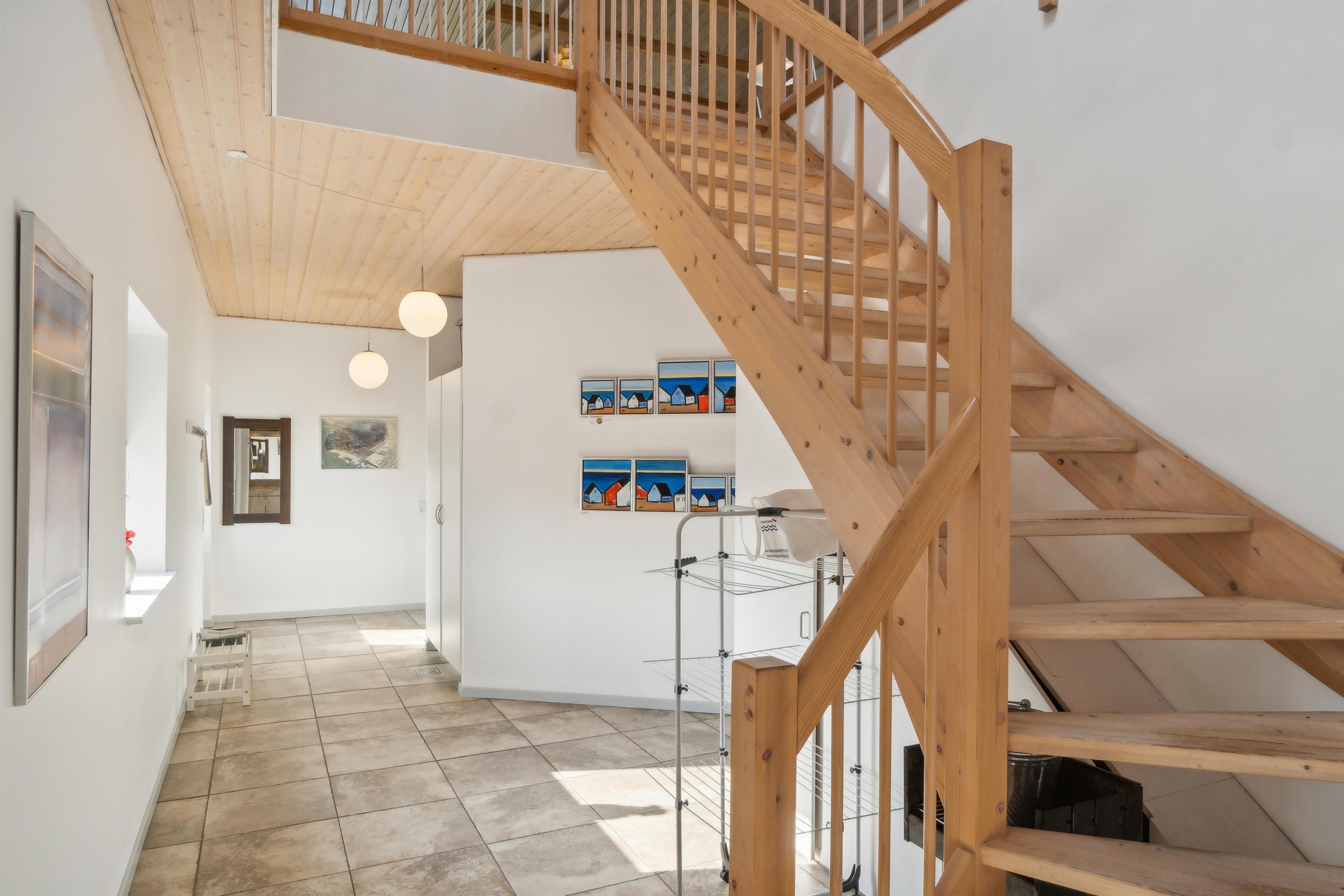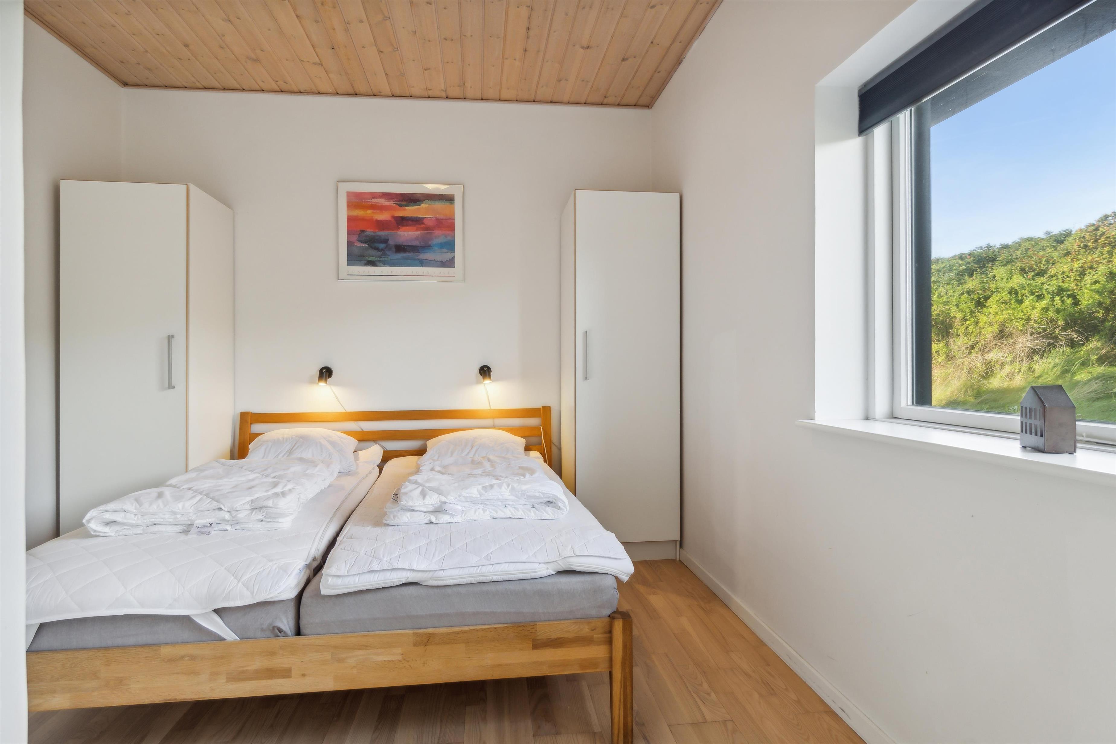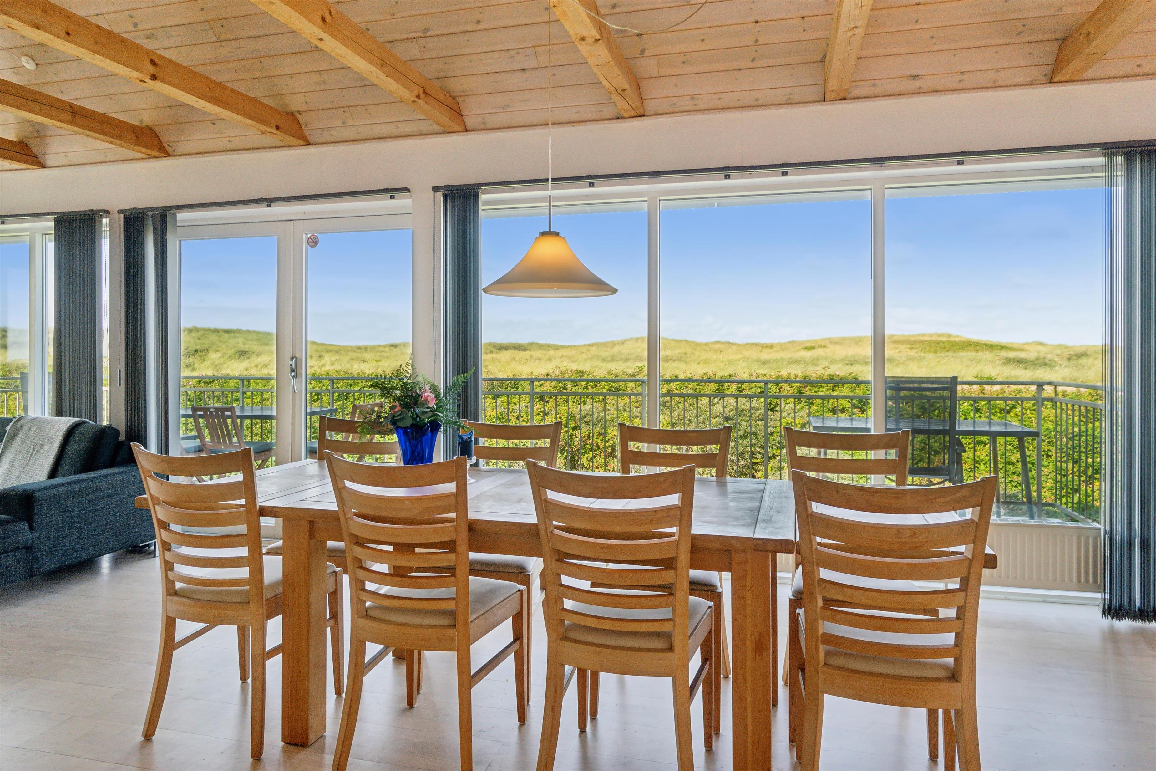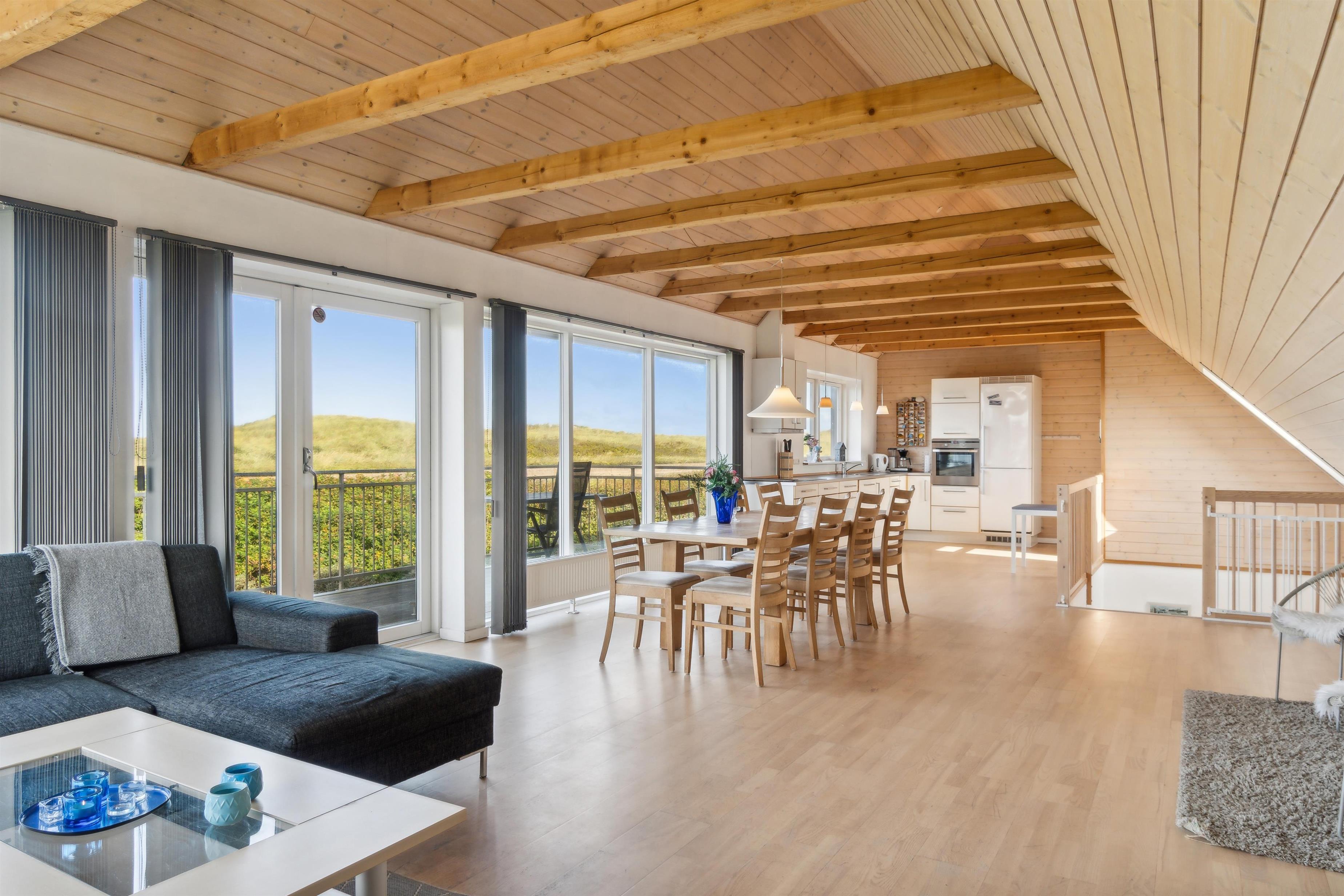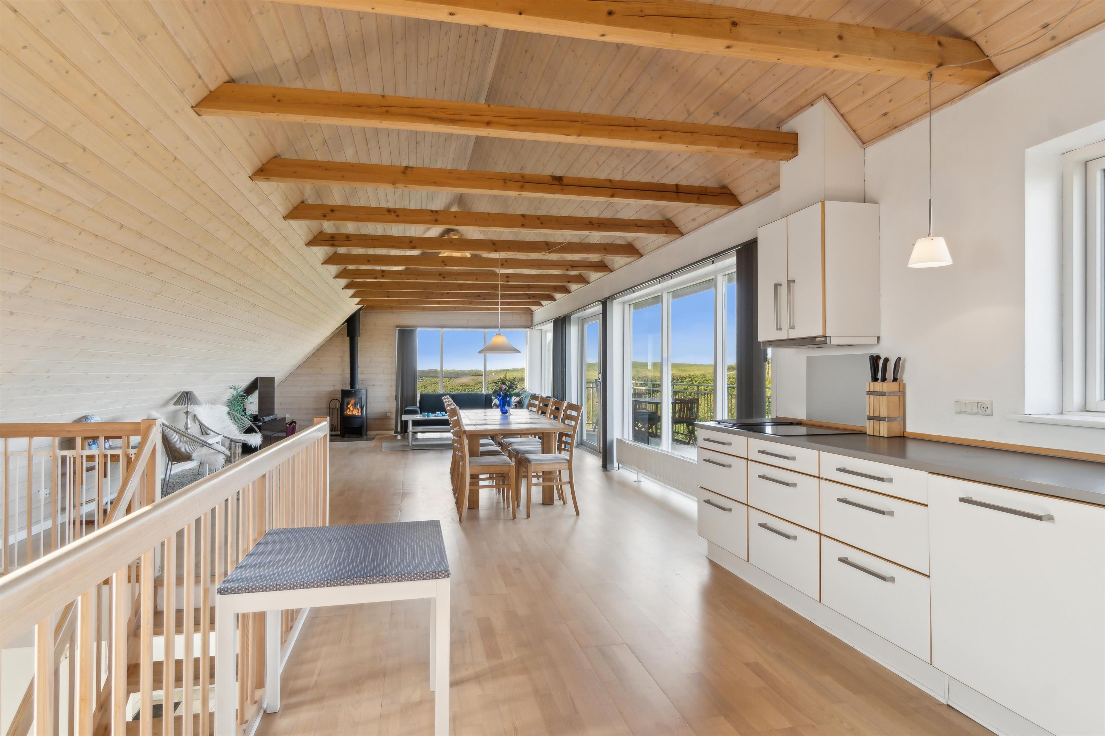 På 1. sal befinder sig et lækkert køkken-alrum med panoramaudsigt over klitlandskabet og den foranliggende kystsikringsvej. Herfra er der også udgang til den store indhegnede balkon hvor det er helt fantastisk at sidde når vejret er til det. Køkkenet er udstyret med elkeramiske kogeplader, emhætte, mikrobølgeovn, indbygningsovn, køleskab og opvaskemaskine. Hertil er der også en separat fryser på 80 liter. I det store stuerum er der et spisebord hvorfra der ligeledes er god udsigt sant hyggelig sofagruppe med smart-TV med tyske TV-programmer, radio og chromecast med mulighed for streamingstjenester. Brændeovnen til at sikre den rette stemning. Der er ligeledes en CD-afspiller og der er mulighed for både at se DR og TV2 samt nogle tyske TV-kanaler. I stueetagen er alle 4 soveværelser, 2 badeværelser og en entré. Der er 2 soveværelser med hver 2 enkeltsenge. De 2 sidste soveværelser har dobbeltsenge. De 2 badeværelser har begge håndvaske, toiletter og brusere. Der er gulvvarme på begge toiletter og i hele stueetagen. Herudover er der i huset tørretumbler, vaskemaskine samt gratis internetadgang. 2 husdyr tiladt. Rygning er ikke tilladt. Som lejer af dette hus har I gratis adgang til Wærket i Thyborøn.